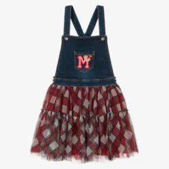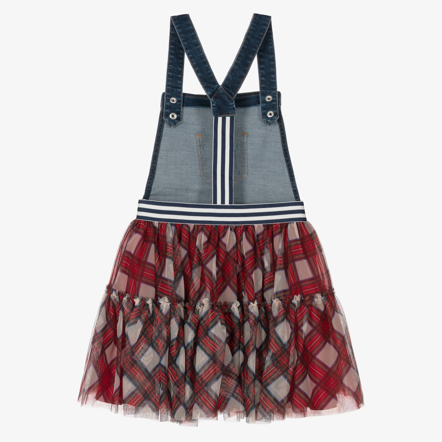 Dark blue denim and red tartan tulle pinafore dress for teen girls by Italian designer, Monnalisa. Stylish and quirky, the bib has a patch pocket with an embroidered teddy bear logo badge. The adjustable shoulder straps have striped elastic at the back and fasten with branded poppers. It has a full, tiered skirt, made in layers of gathered tulle and lined in soft red cotton-blend twill.
