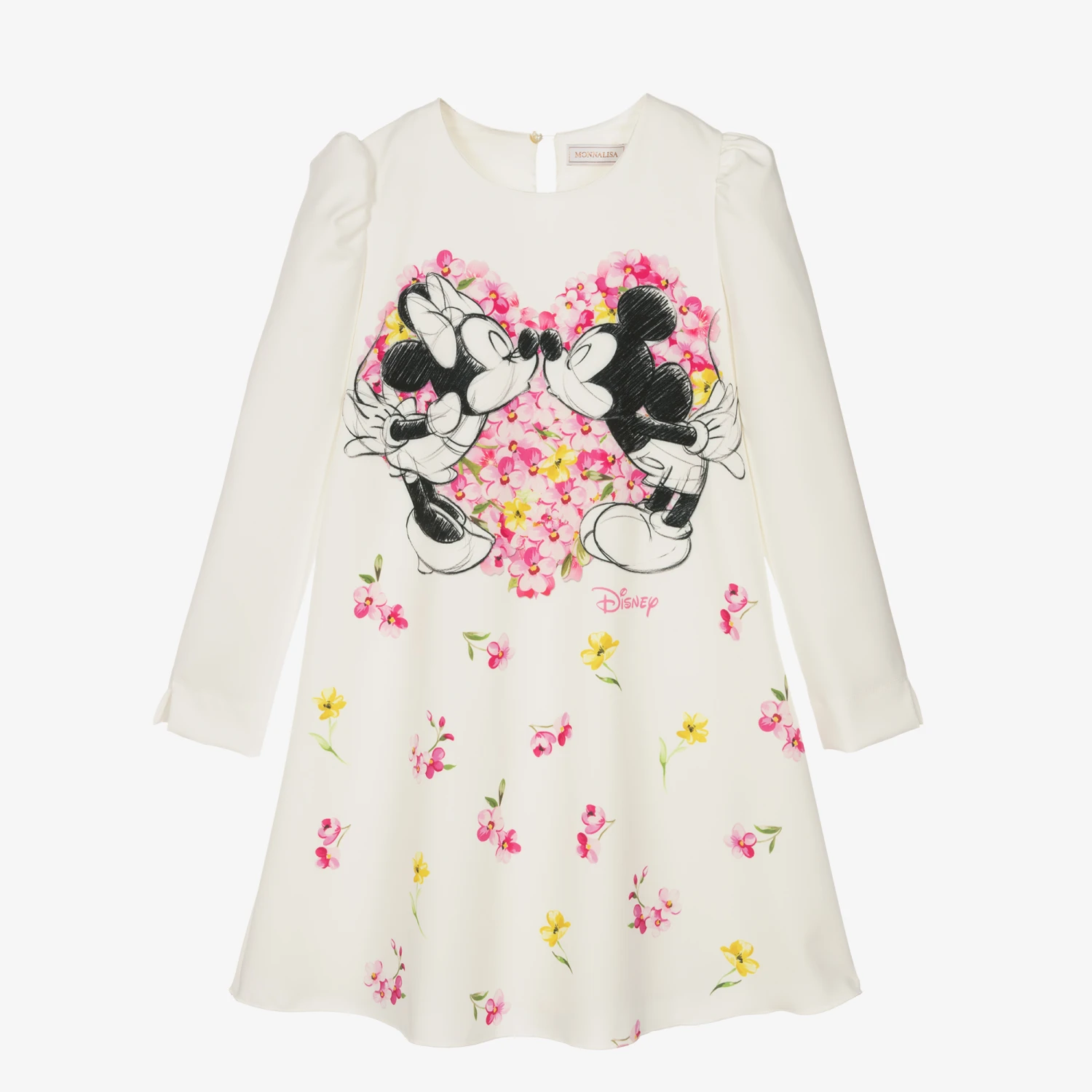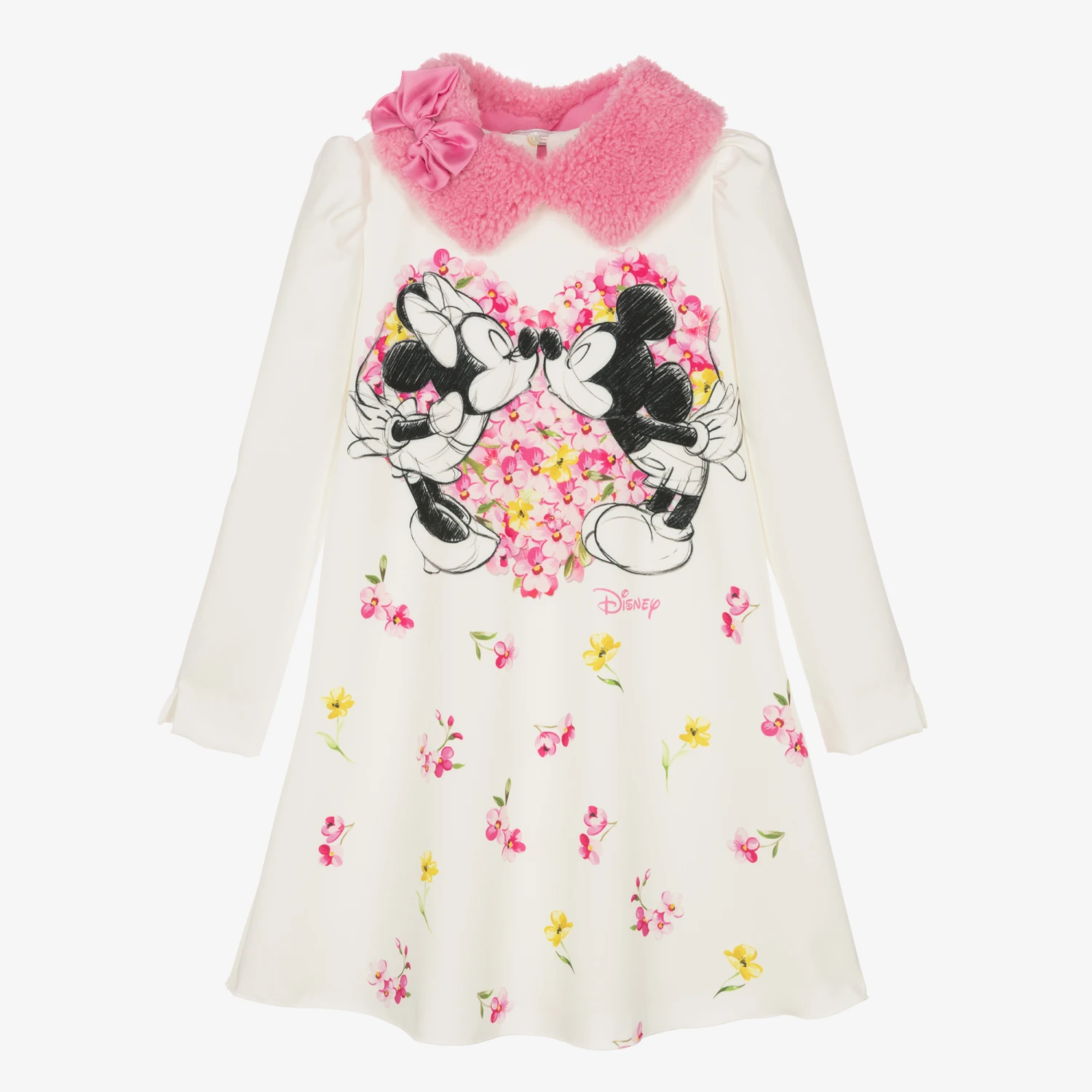 Ivory dress for teen girls by Italian designer Monnalisa, with a striking Disney© graphic and feminine floral print on the front. Made in silky twill with a frilled hemline on the back, this classic character dress has a removable pink faux fur collar with a gorgeous satin bow for versatile styling. Fully lined and comfortable to wear, it has pretty puffed sleeves and a keyhole button fastening on the back.
