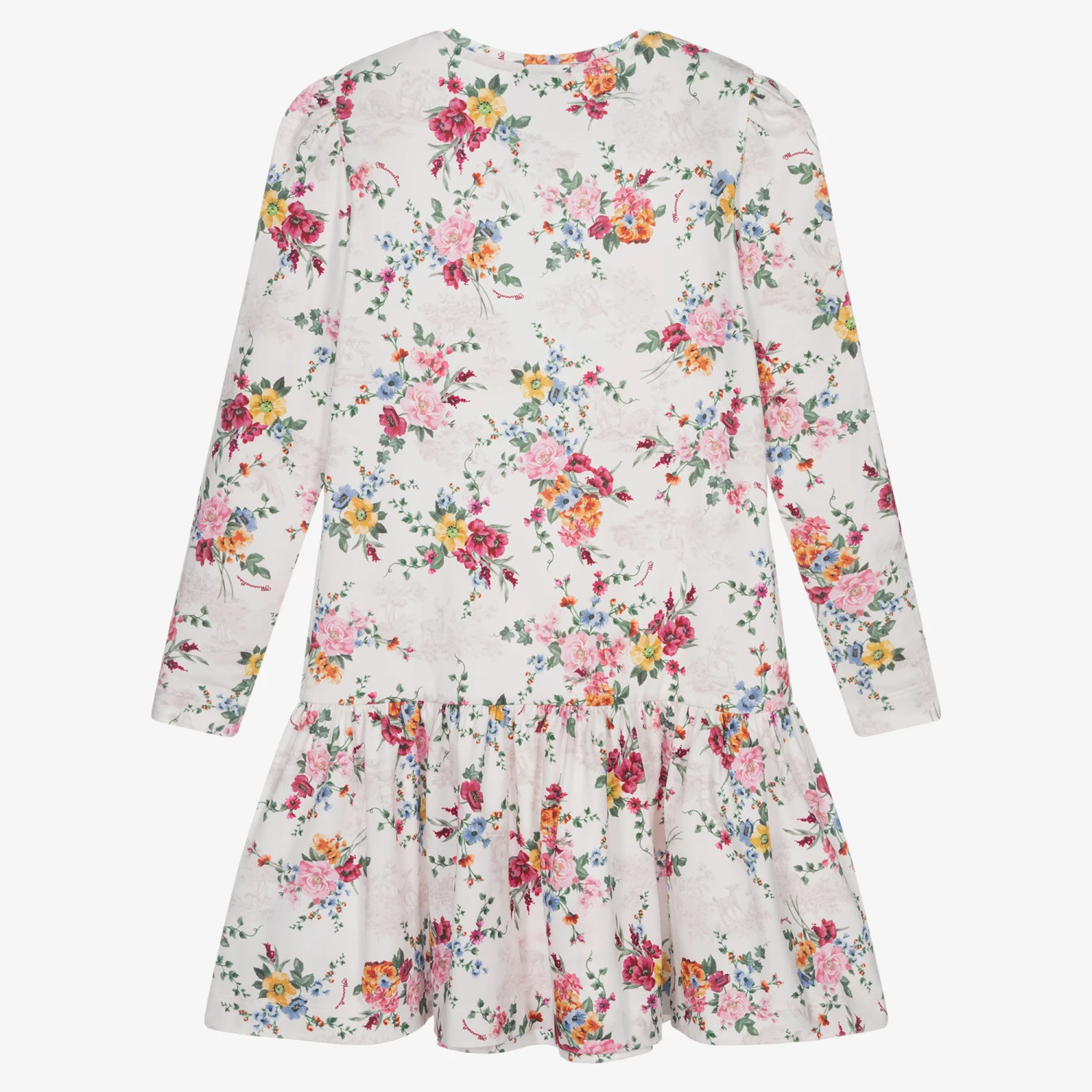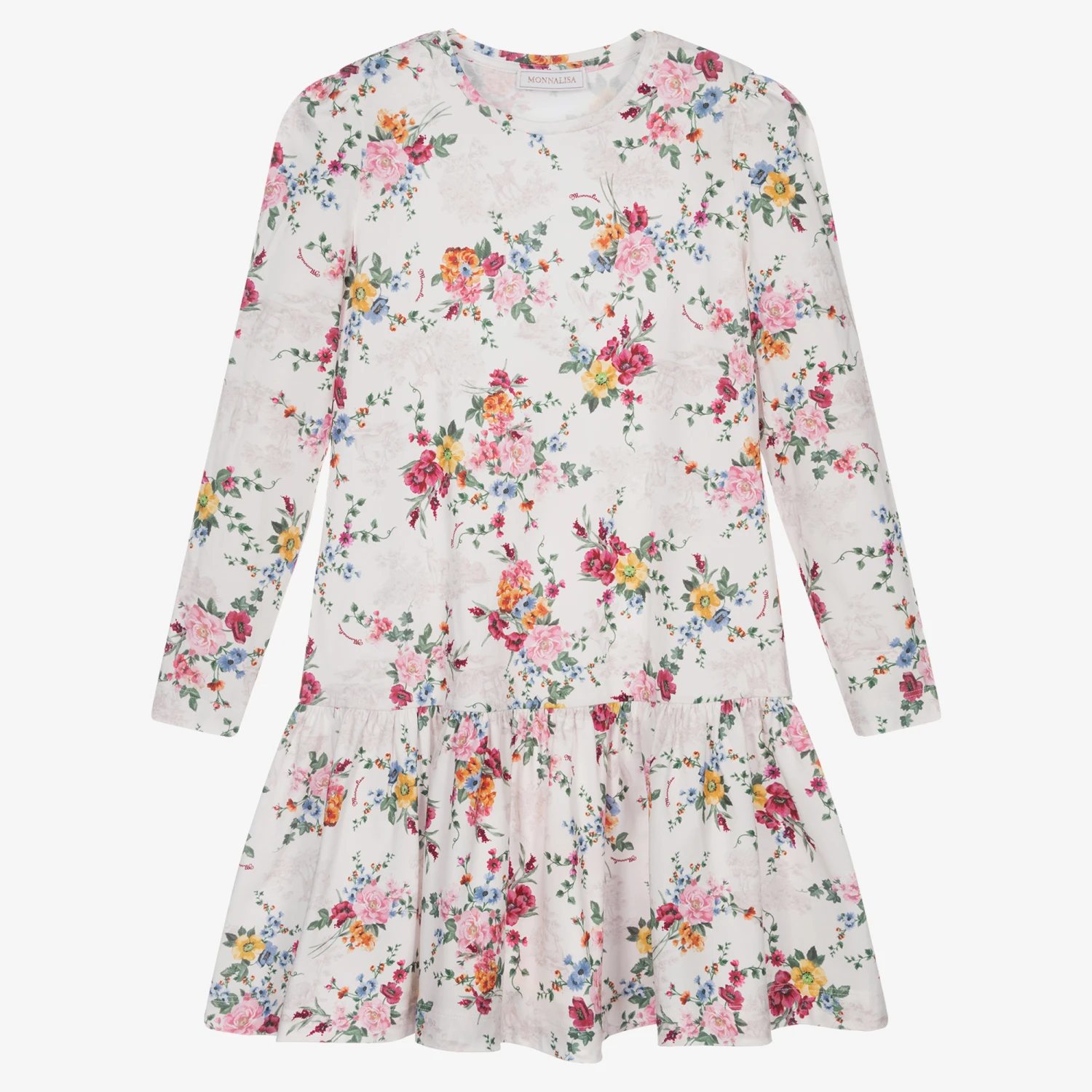 An easy to wear ivory cotton dress for teen girls by Monallisa. Made from soft stretch jersey, this casual dress is patterned with a colourful branded floral and Toile de Jouy print. Classically styled, it has slightly puffed sleeves, and a dropped waist with a gathered skirt for vintage appeal.