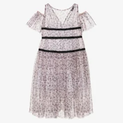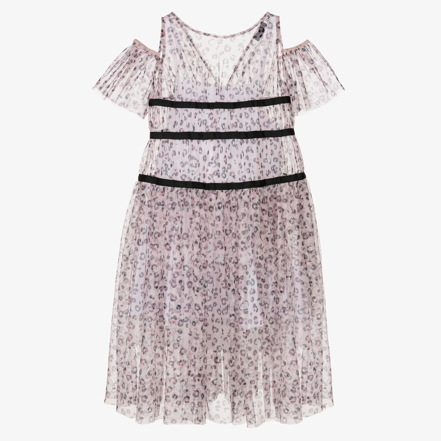 A fun party dress for teen girls by Monnalisa. This ankle length design features a pink tulle overlay with a black leopard print and black grosgrain ribbon bands around the middle. There are puff short sleeves with cold shoulder detailing. A white stretchy jersey slip dress is worn underneath.