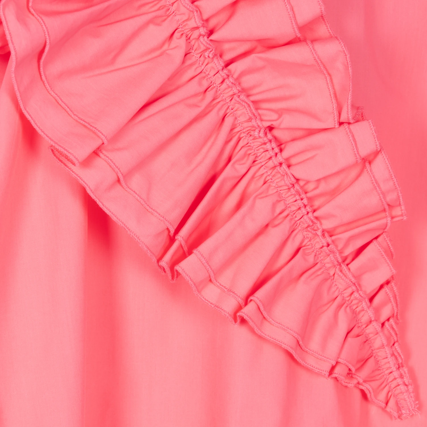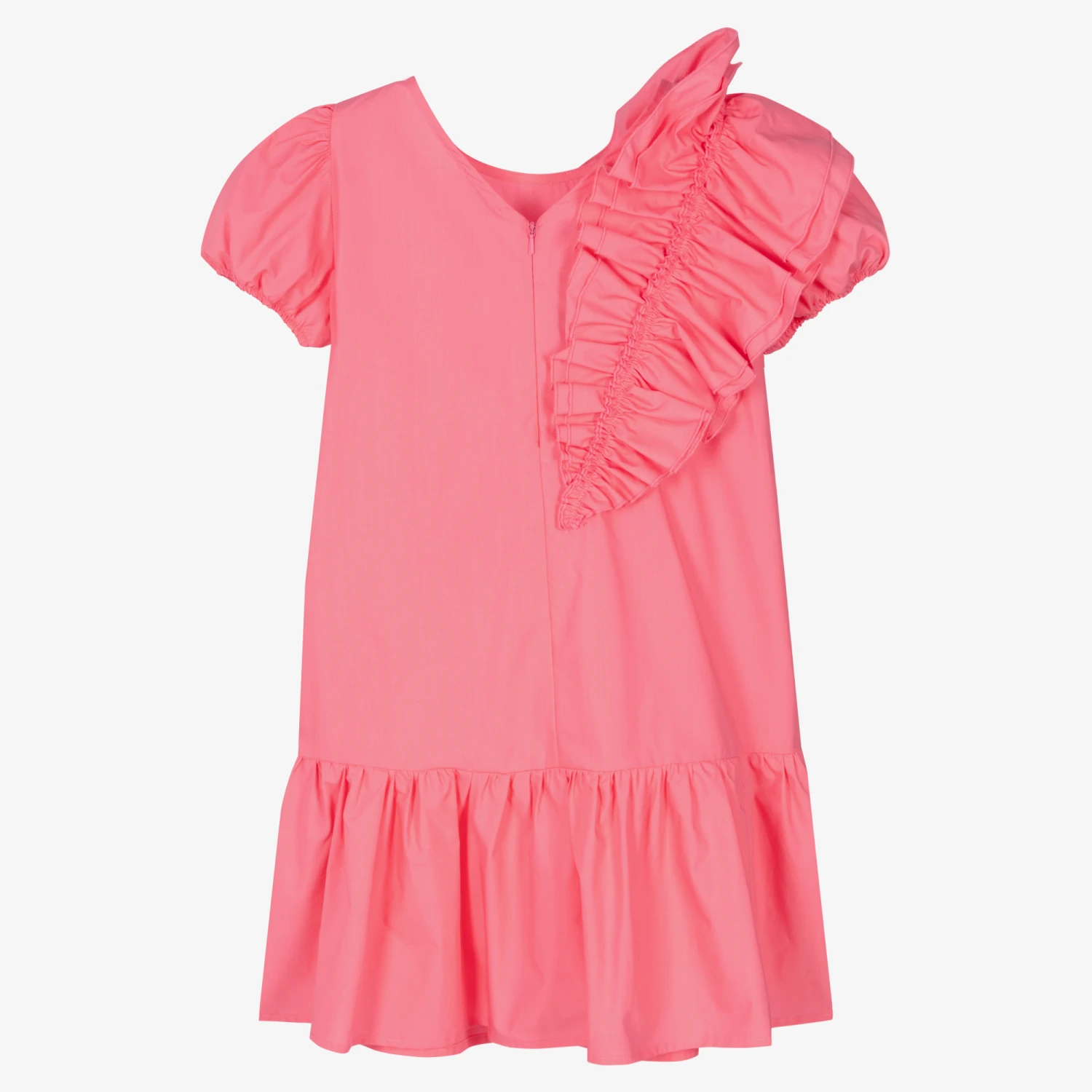 Coral pink dress for teen girls by Monnalisa, made in lightweight cotton poplin. It has gorgeous puffed sleeves and a ruffle sash detail across the front and down the back. There is a diamanté logo on the front and a zip fastening on the back.