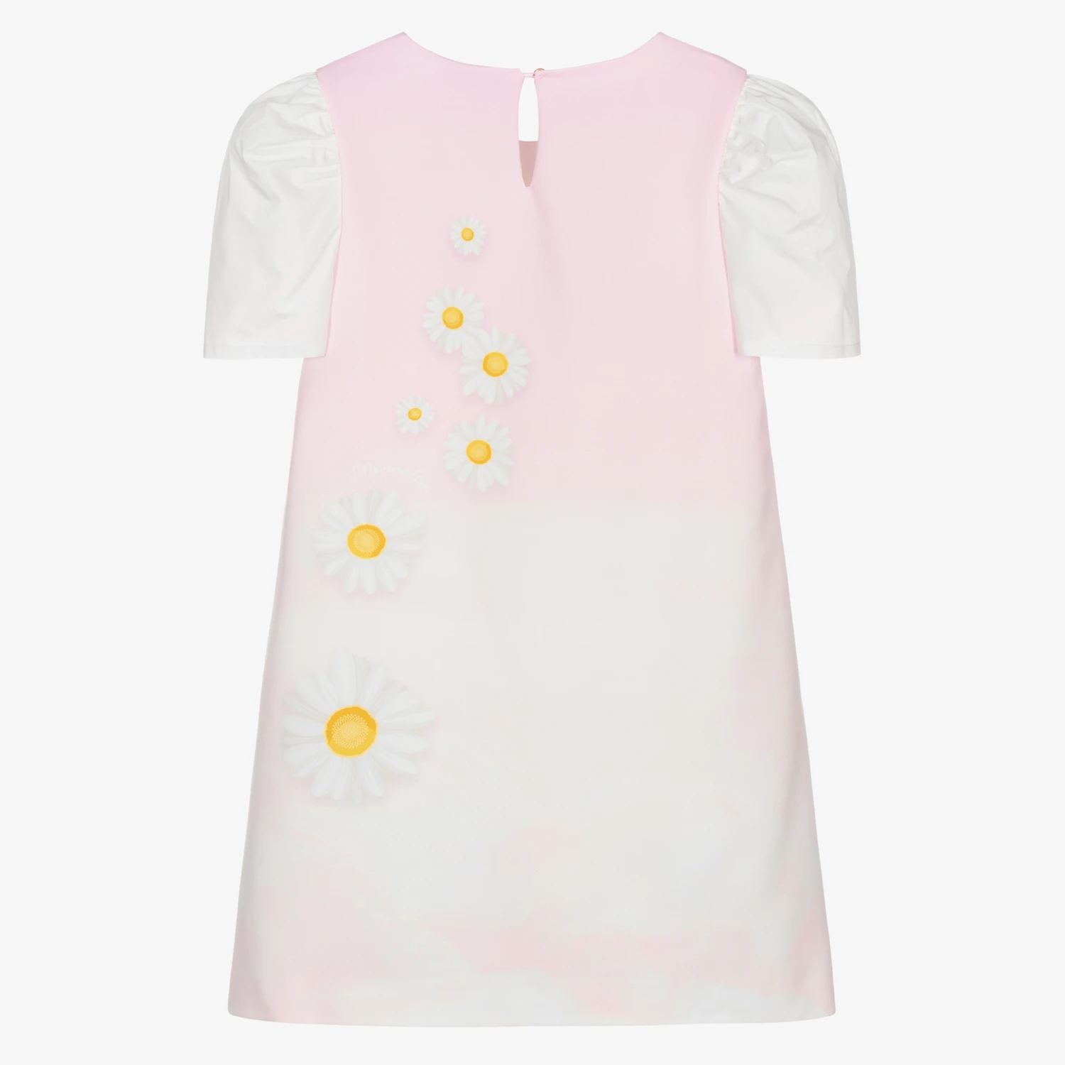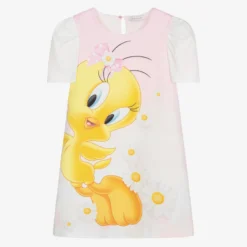Pale pink dress for teen girls by Italian designer Monnalisa, with a yellow Tweety, white daisies and clouds printed on the front. Made in lightweight polyester crêpe with padded cotton sleeves, it has the brand’s logo on the back.