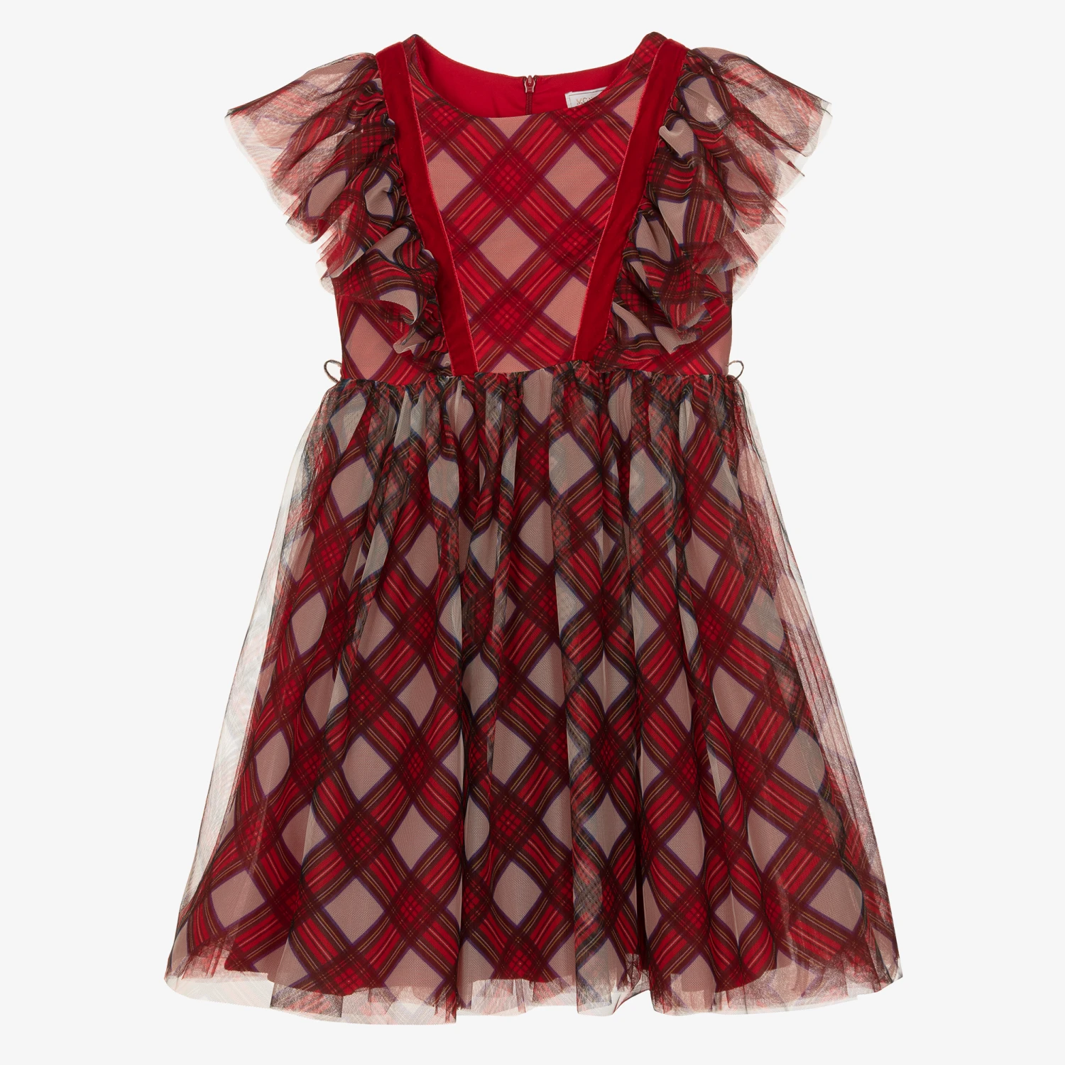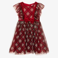 A beautiful red tulle dress for teen girls by Monnalisa, in a lovely tartan print. Lined in comfortable soft twill with layers of voluminous tulle, this elegant design has cap sleeves with slanted, sheer ruffles on the shoulders. The soft velvet trims on the chest match the layered red bow on the detachable waist belt for a lovely finishing touch. There is a tonal zip fastening on the back for a seamless look.