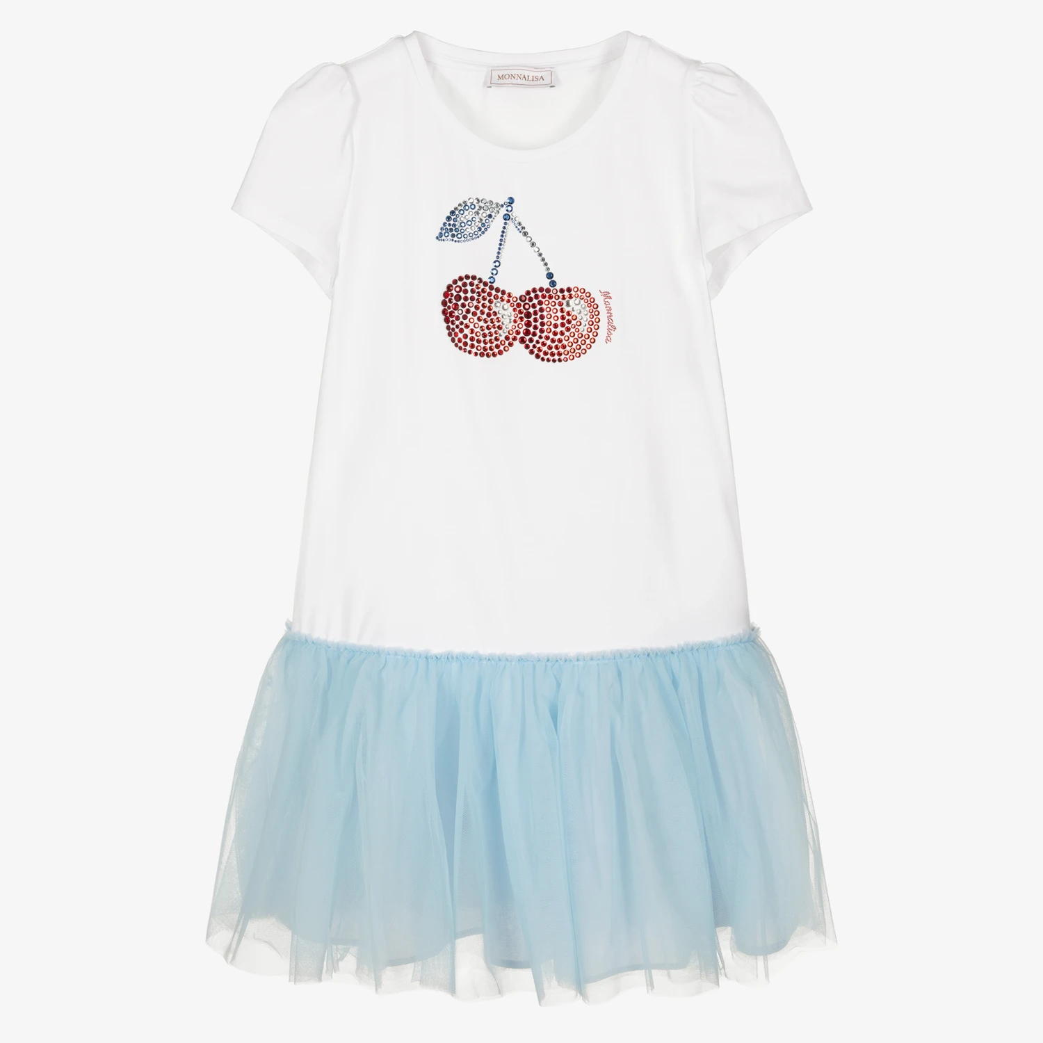 Pretty white cotton jersey dress for teen girls by Italian brand Monnalisa. The bodice has red and blue rhinestone cherries and a logo sparkling on the front, with a drop-waisted light blue tulle skirt. Easy to wear, it simply slips on over the head.