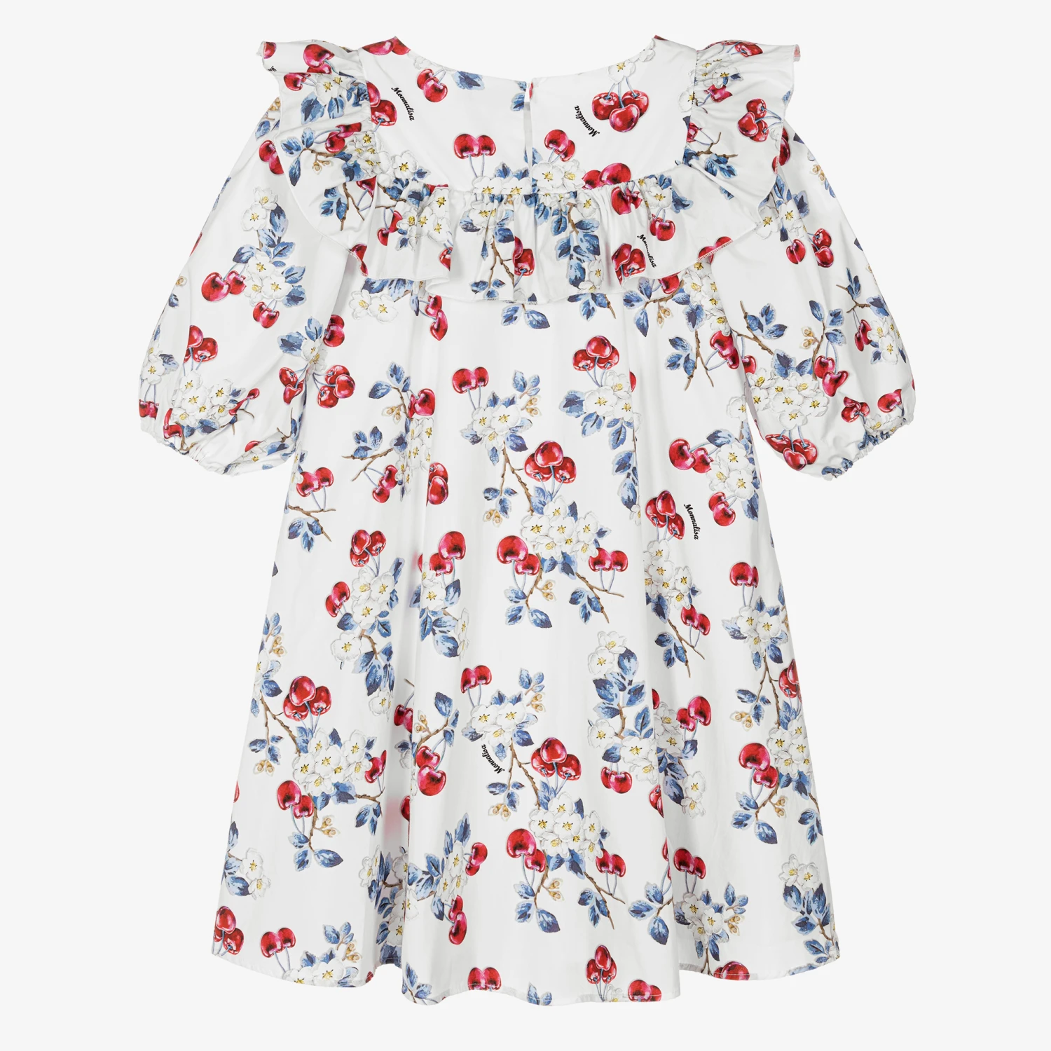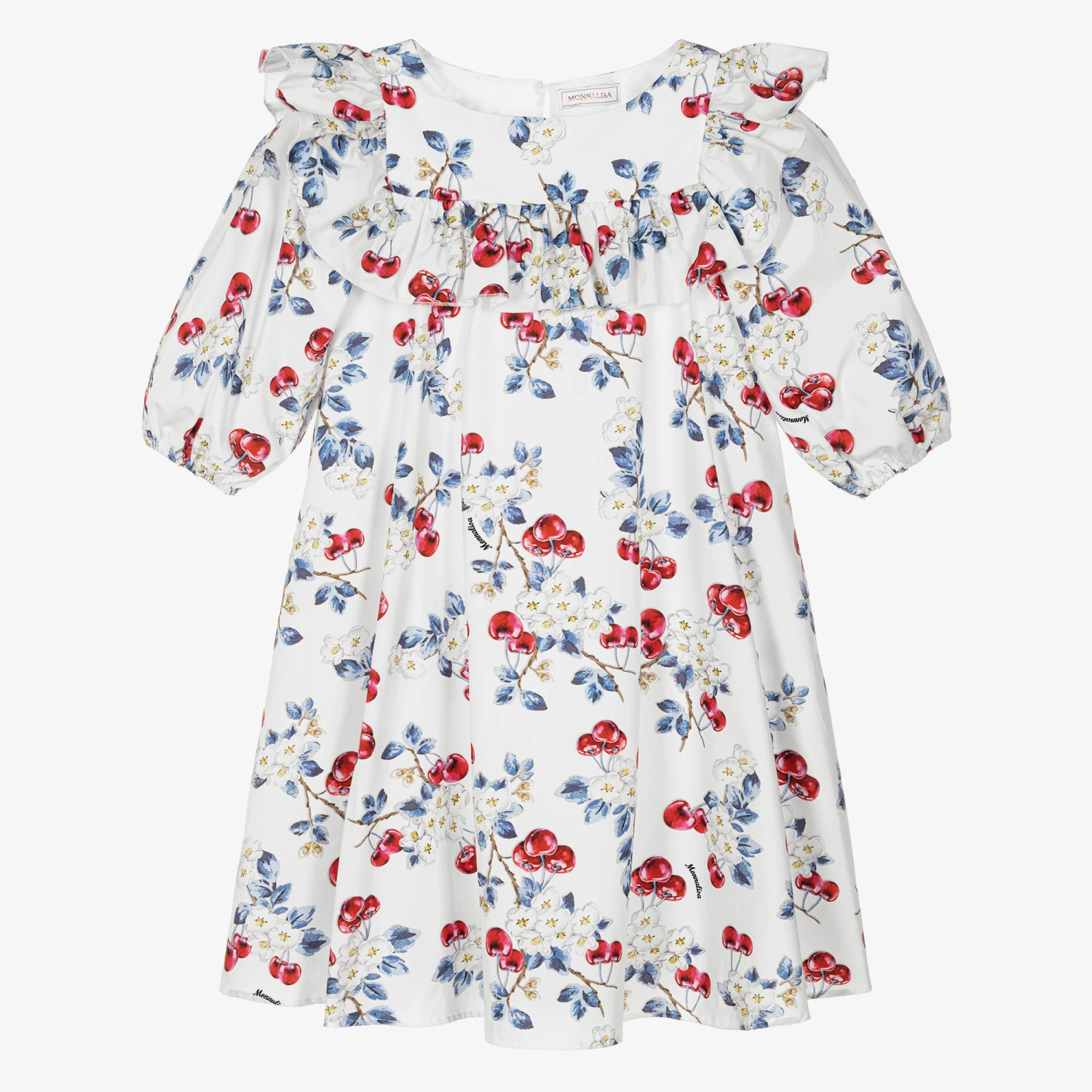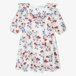 Lovely dress for teen girls by Italian designer Monnalisa, made in soft cotton poplin with a comfortable voile lining. Elegant and eye-catching, it has an all-over floral cherry print, with beautifully ruffled trims and voluminous puffed sleeves. There is a concealed button fastening on the back.