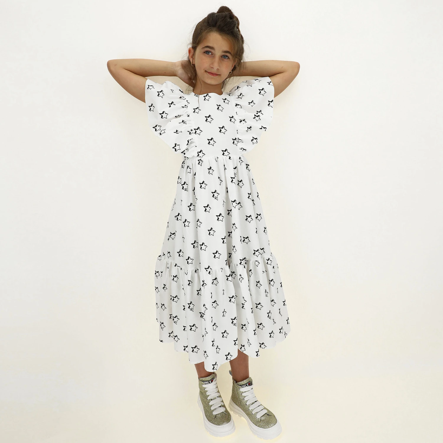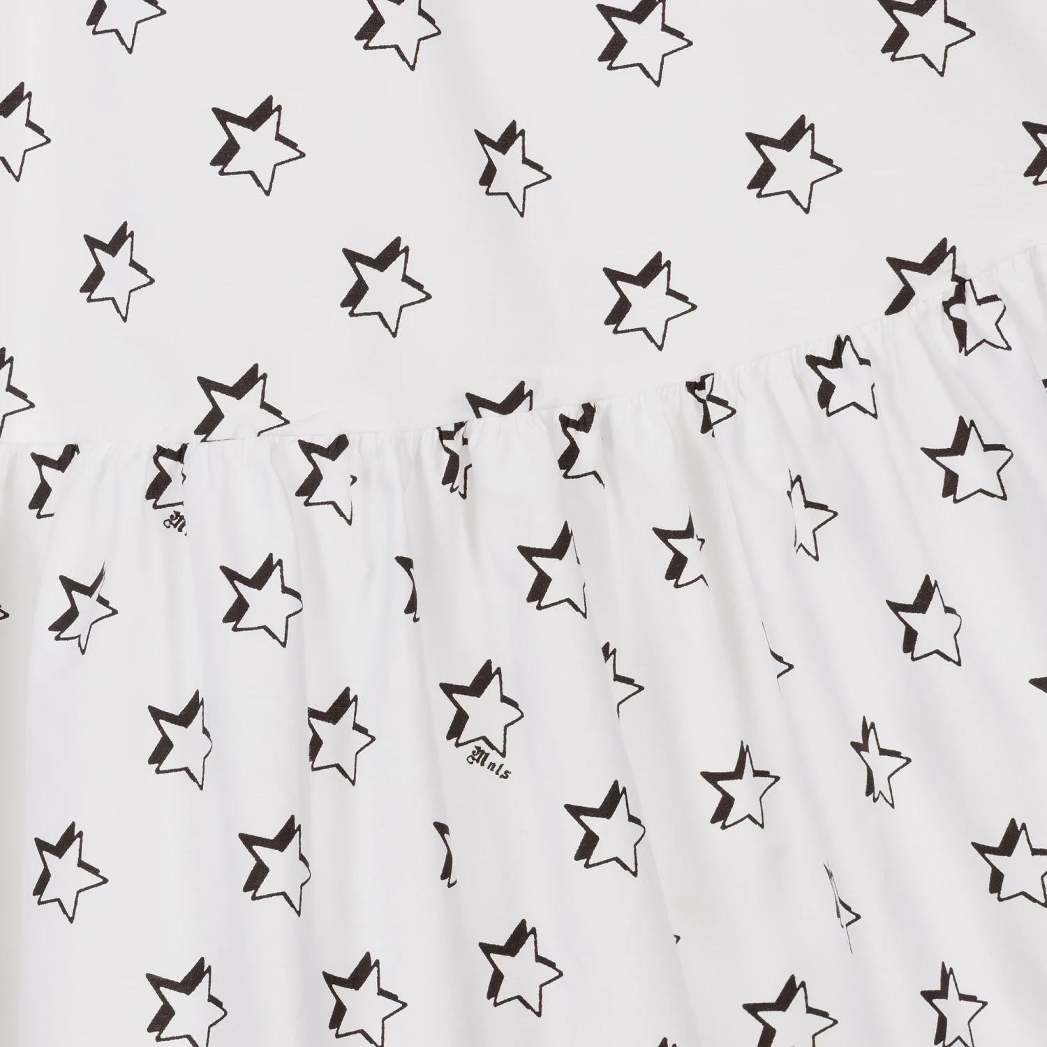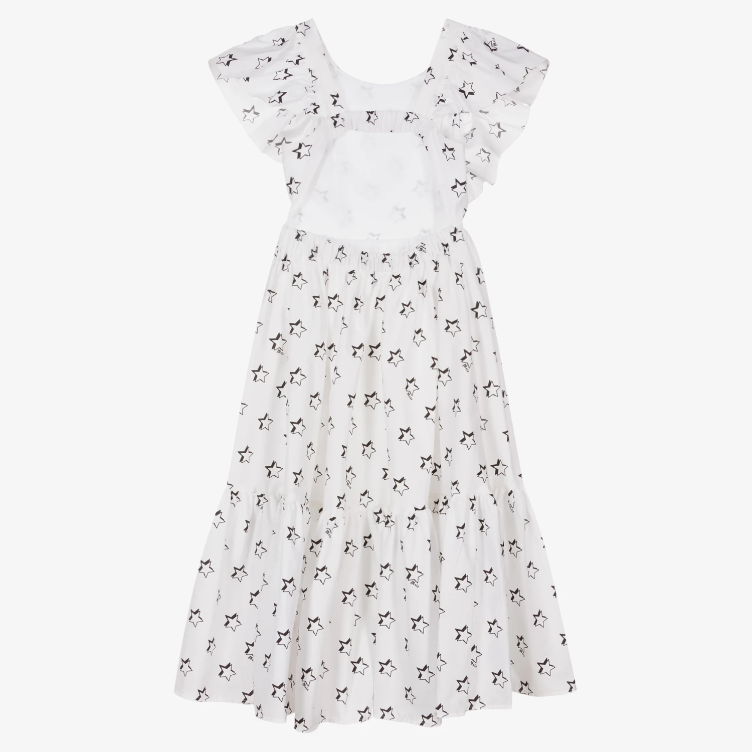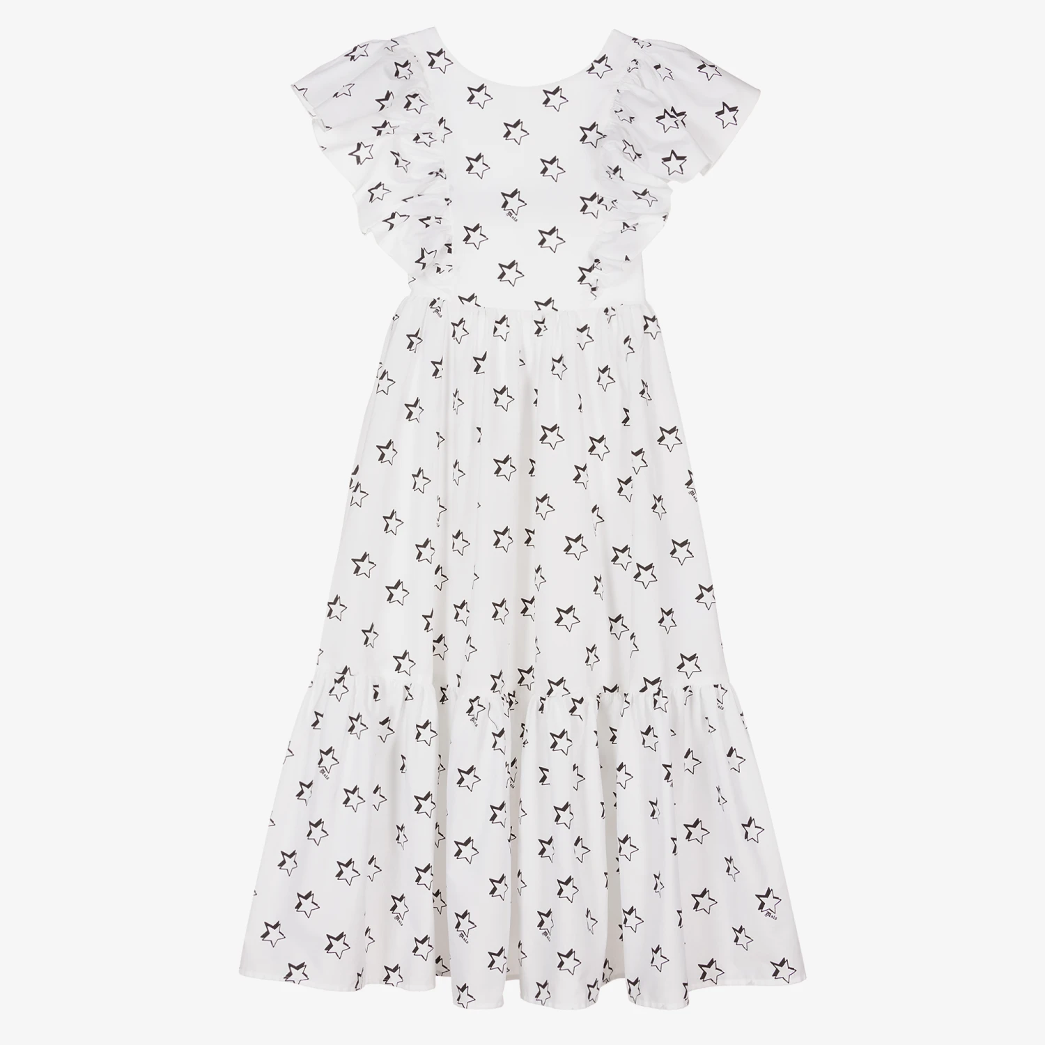 Lovely white dress for teen girls by Monnalisa, made in soft and lightweight cotton poplin. Patterned with black stars and logo prints, it has frilly trims on the shoulder and a gathered skirt. Ideal for summery days, it is also lined in lightweight cotton voile. It has a stylish open back detail.