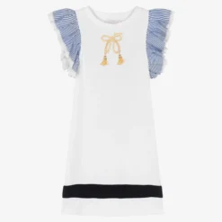 White dress for teen girls by Monnalisa, with a wide navy blue band above the hem. It has an embroidered gold logo on the front and a gold embroidered bow trimmed with sparkly diamantés and faux pearls. Stylishly casual, it is made in soft cotton jersey. The pretty navy blue and white striped ruffle sleeves add an extra flourish to this nautically themed dress.