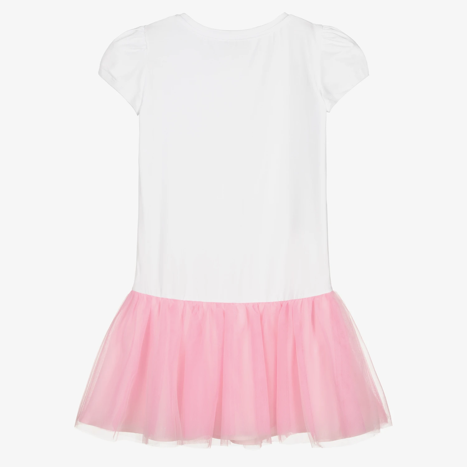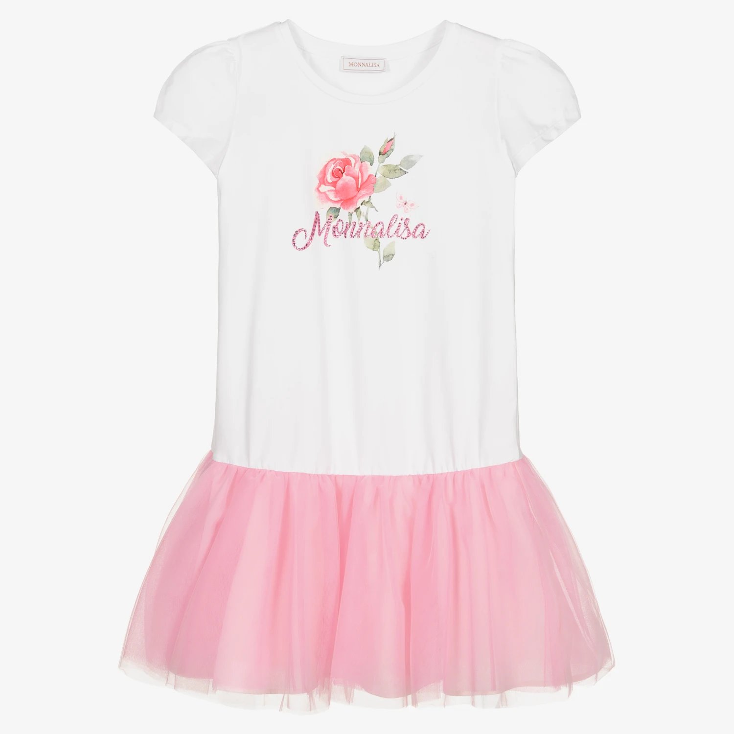 White and pink dress for teen girls by Monnalisa, made in soft cotton jersey, with a cute pink tulle skirt. The white bodice has a pretty pink and green rose print on the front, with a sparkling pink diamanté logo. It has slightly puffed sleeves and the tulle skirt is lined in soft, lightweight cotton.