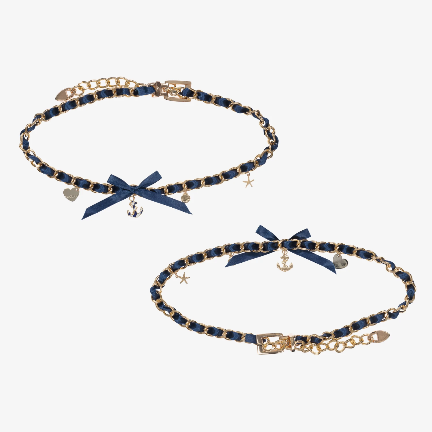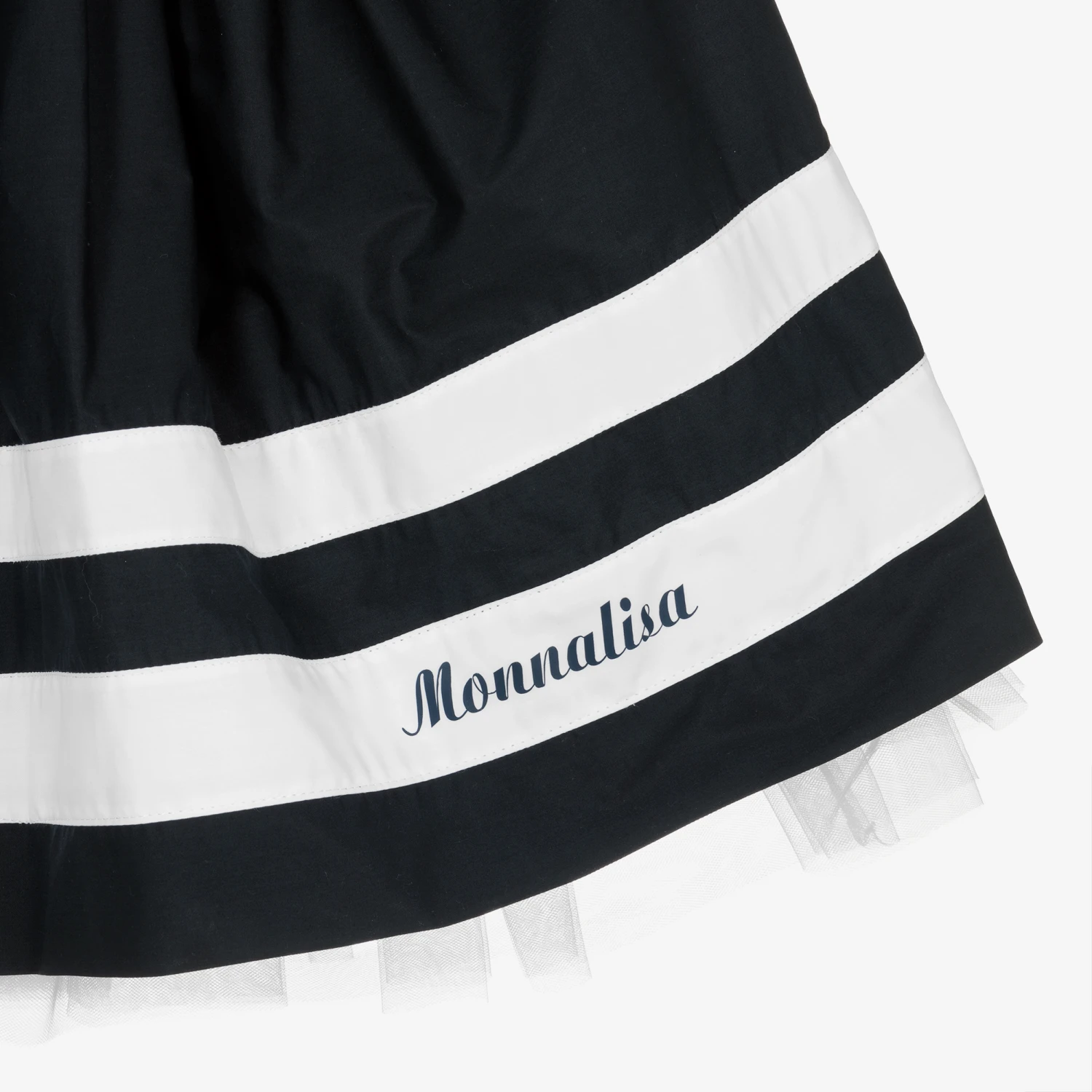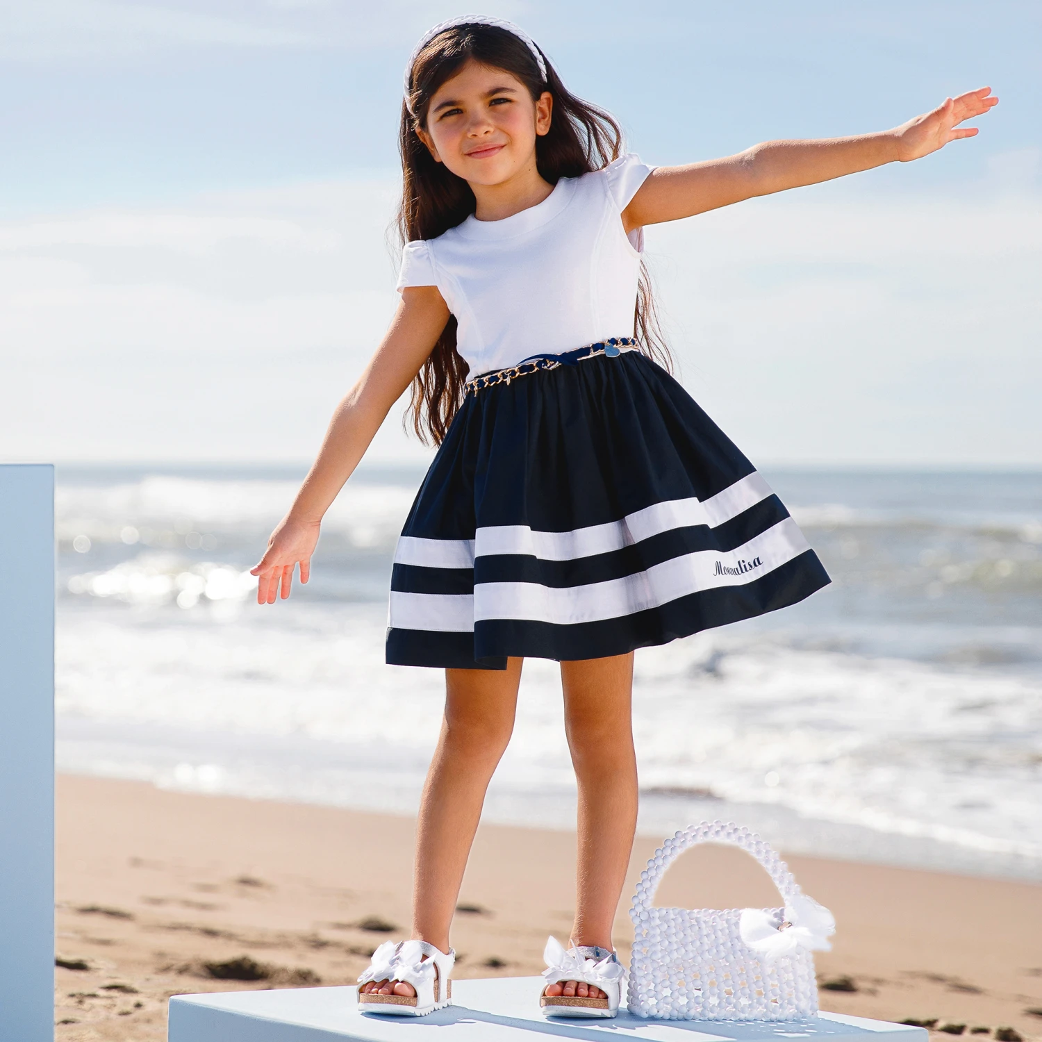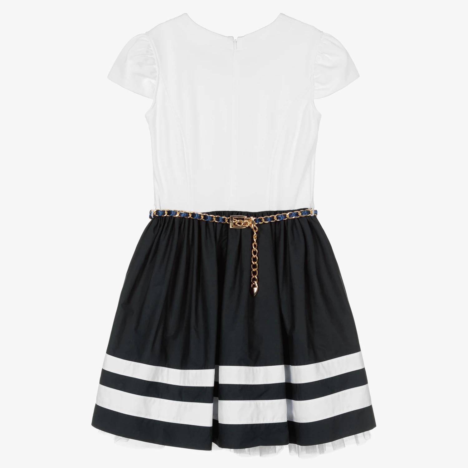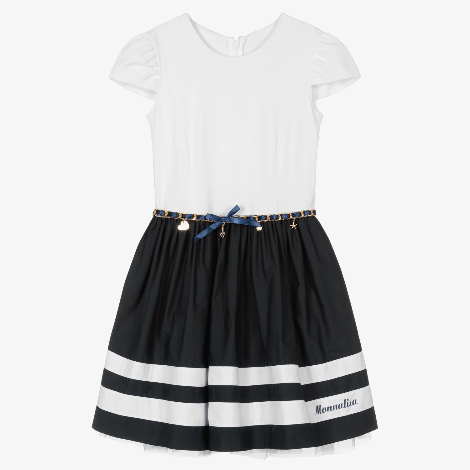 A nautical-inspired cotton dress for teen girls from Italian brand Monnalisa, in a white and navy blue colour palette. The white jersey bodice has capped sleeves and a concealed zip fastening on the back. The navy blue and white poplin skirt gently gathers at the waist and is shaped beautifully with a soft voile lining and tulle trim. A stylish gold metal chain belt can be worn around the waist, featuring a threaded blue ribbon and nautical-themed charms. A navy blue logo print can be seen above the hem for instant brand appeal.