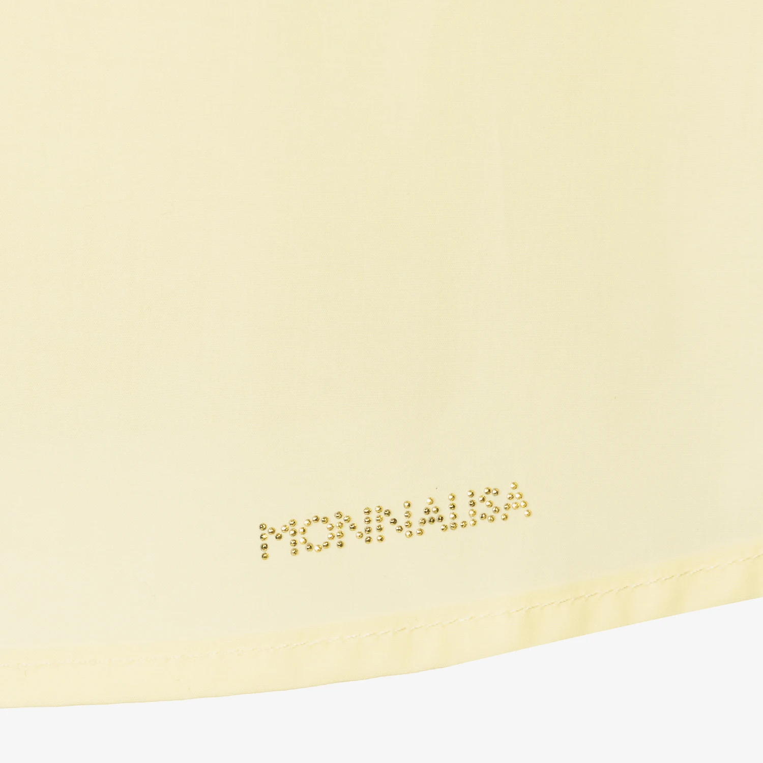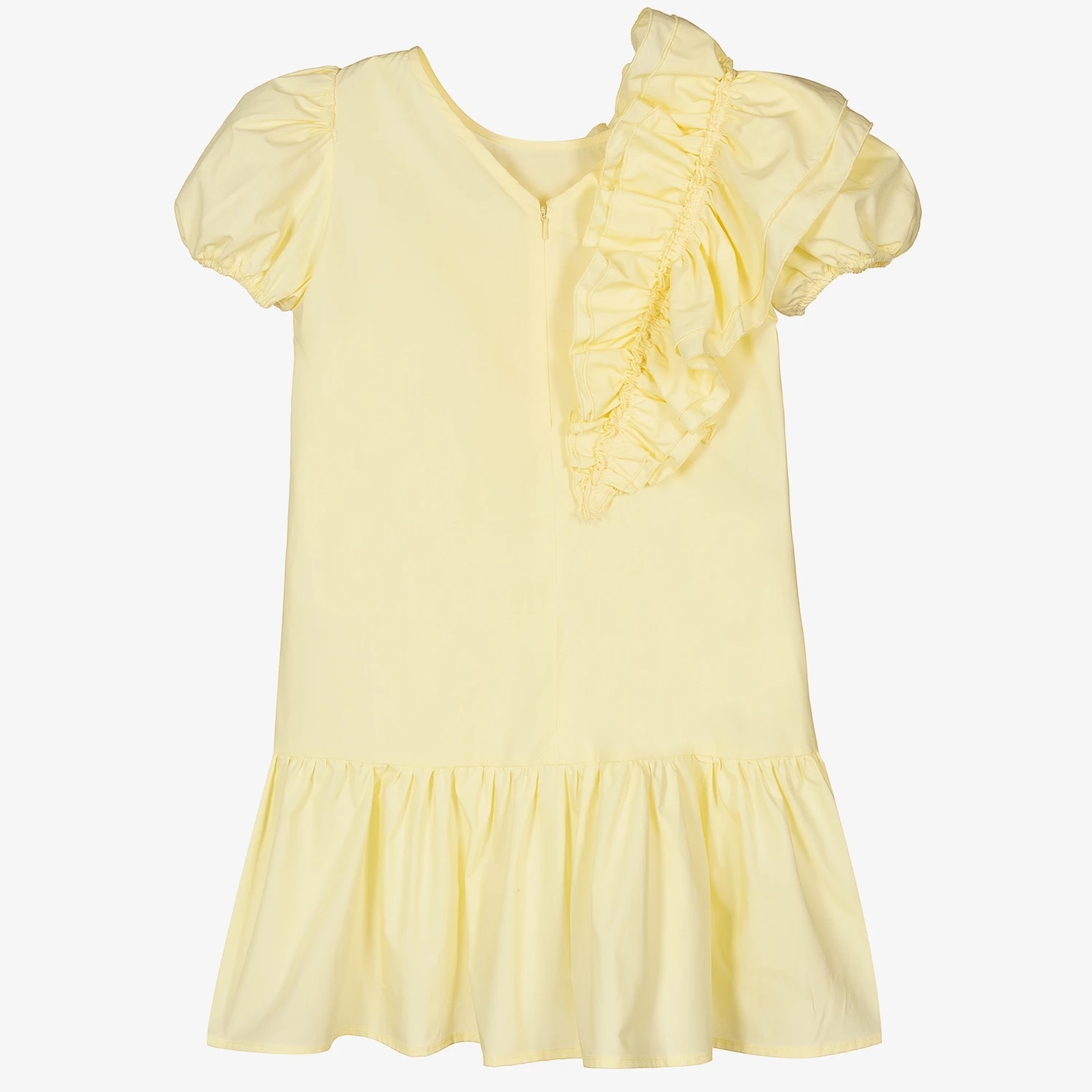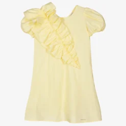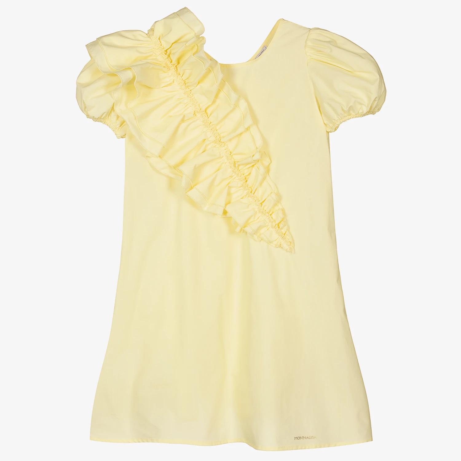 Pastel yellow dress for teen girls by Monnalisa, made in lightweight cotton poplin. It has gorgeous puffed sleeves and a ruffle sash detail across the front and down the back. There is a diamanté logo on the front and a zip fastening on the back.