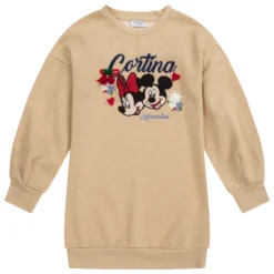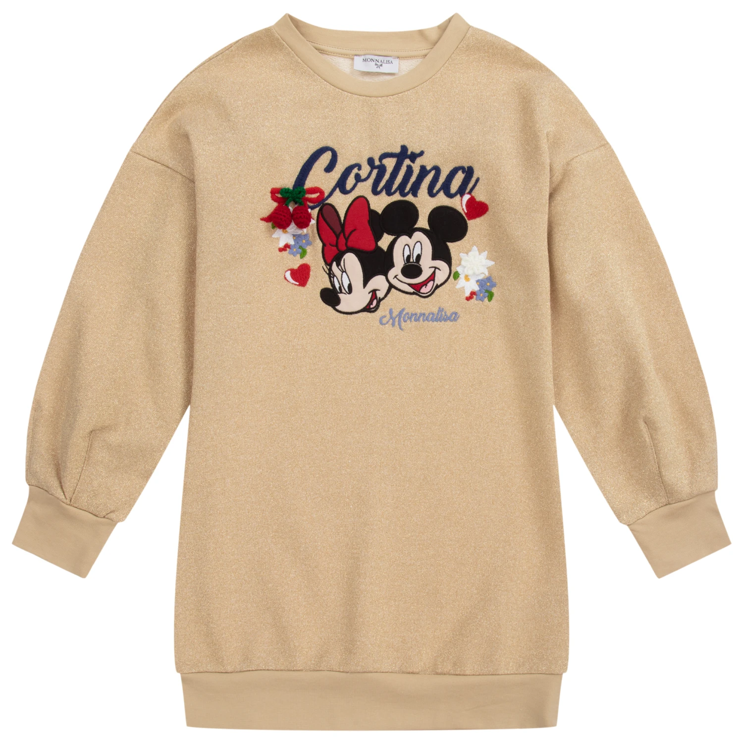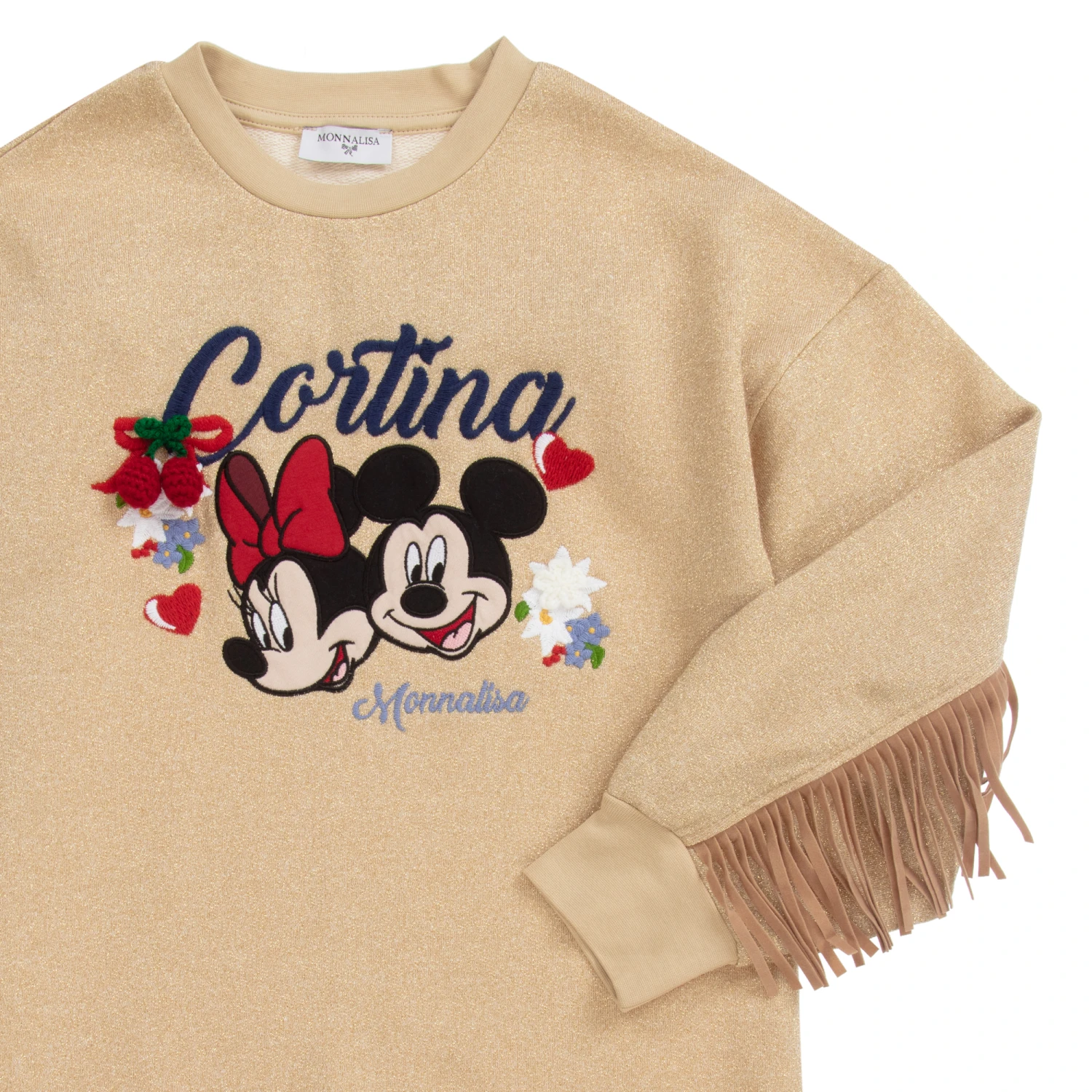 Teen girls glittery gold lurex sweatshirt dress by Italian designer Monnalisa, with faux suede fringing across the back. Made in cotton jersey, it has a colourful appliqué of Disney’s Mickey and Minnie Mouse. There is a red knitted pom-pom bow and blue logo embroidery on the front.