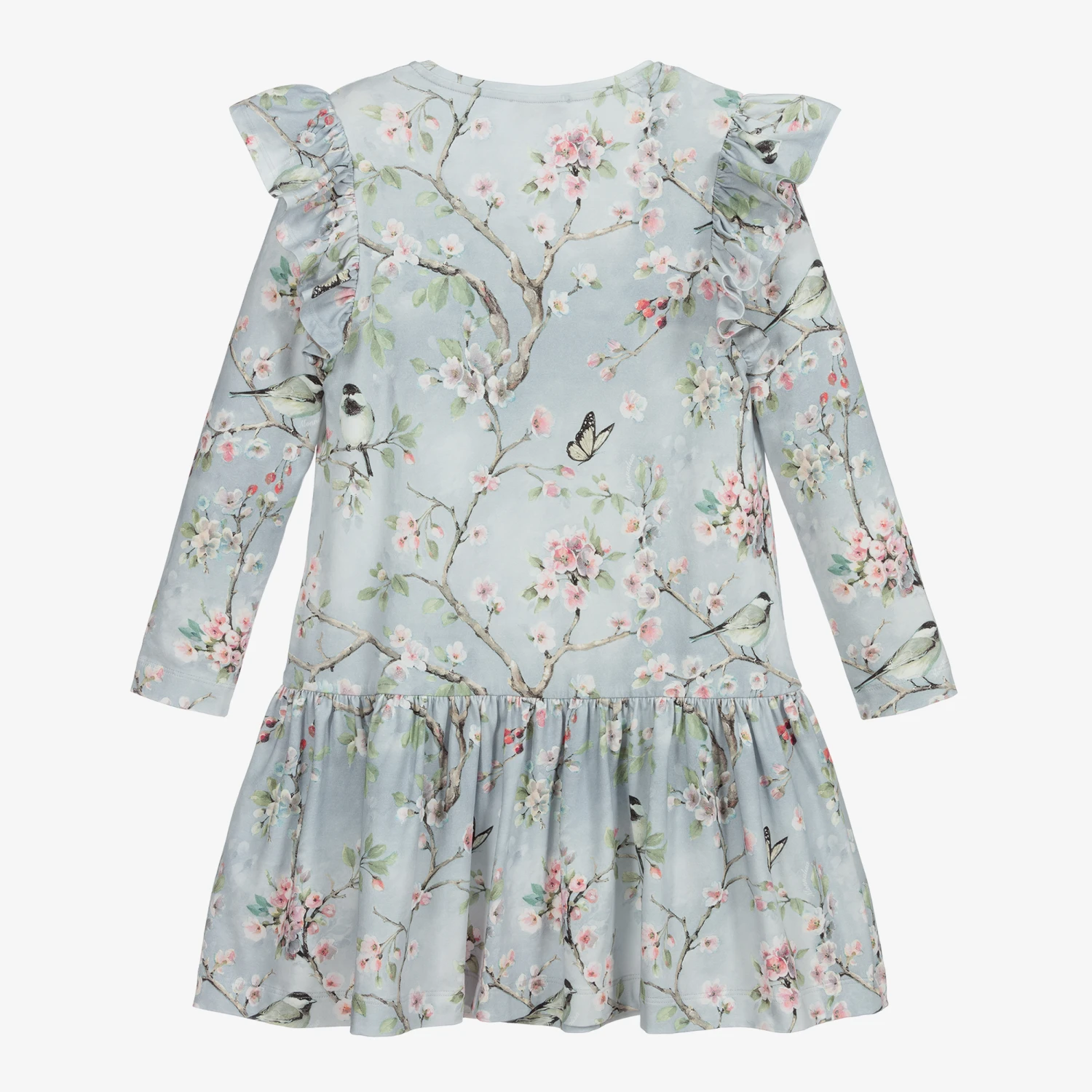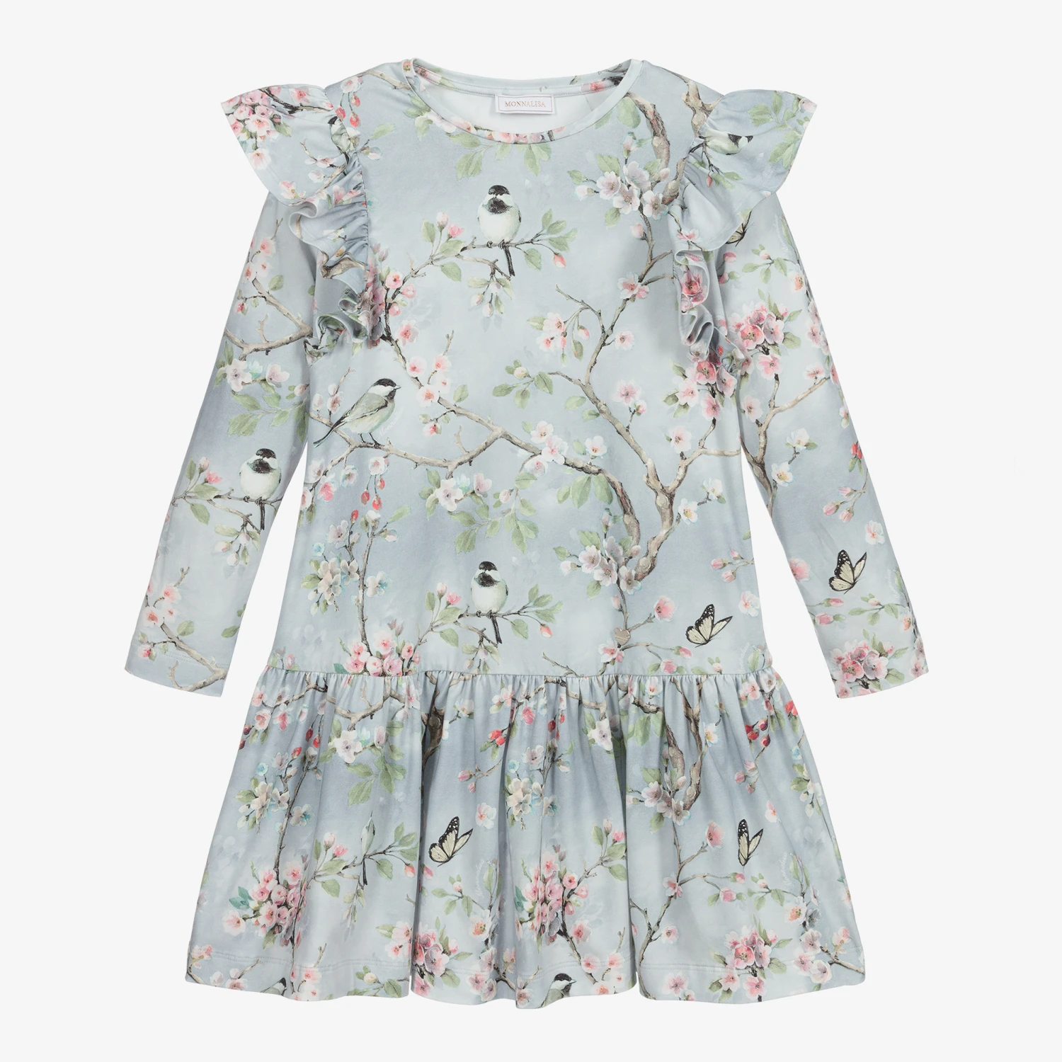 Teen girls blue grey jersey dress from Monnalisa, with a colourful floral and bird pattern. This dropped-waisted style has ruffles over the shoulders and a gathered skirt.