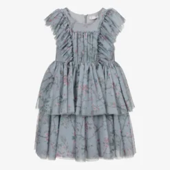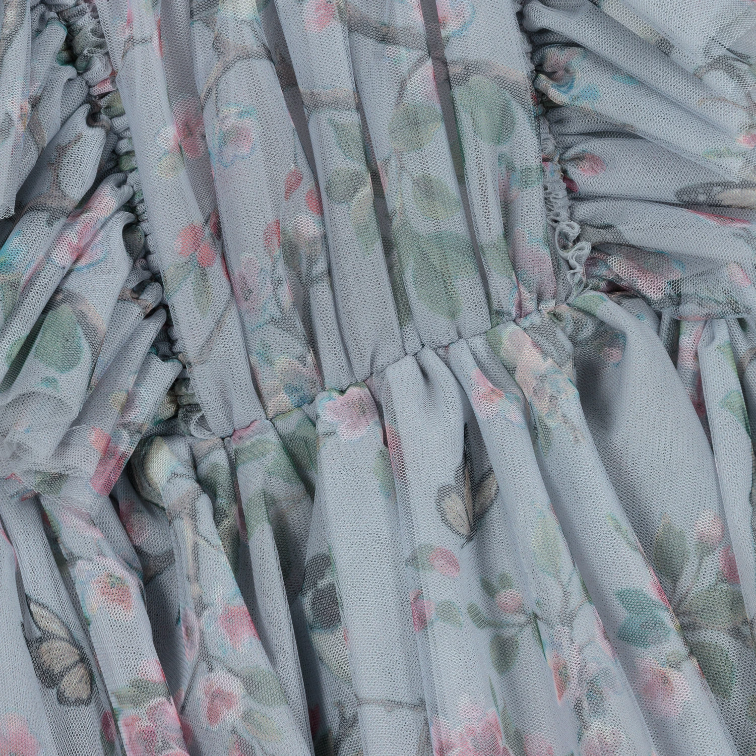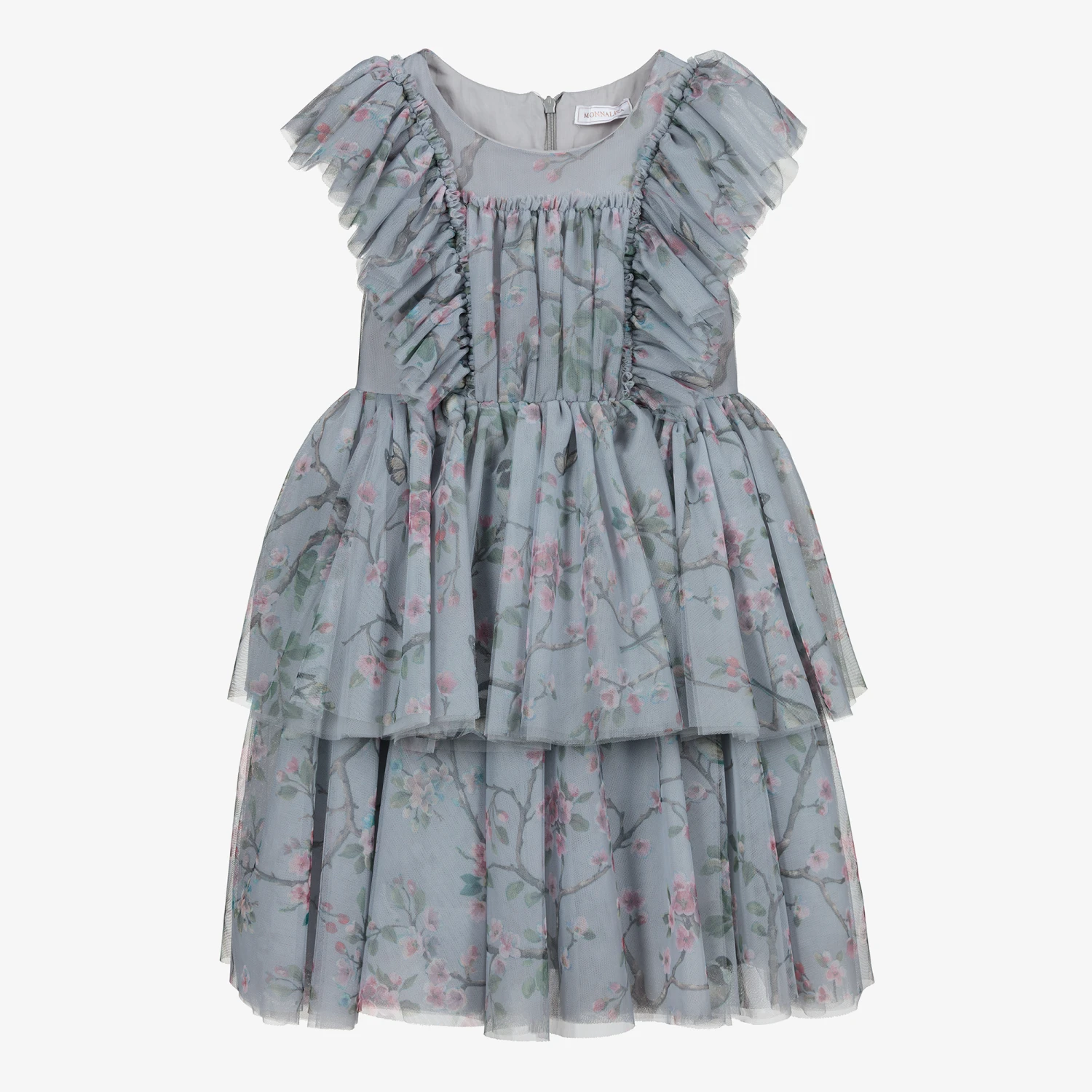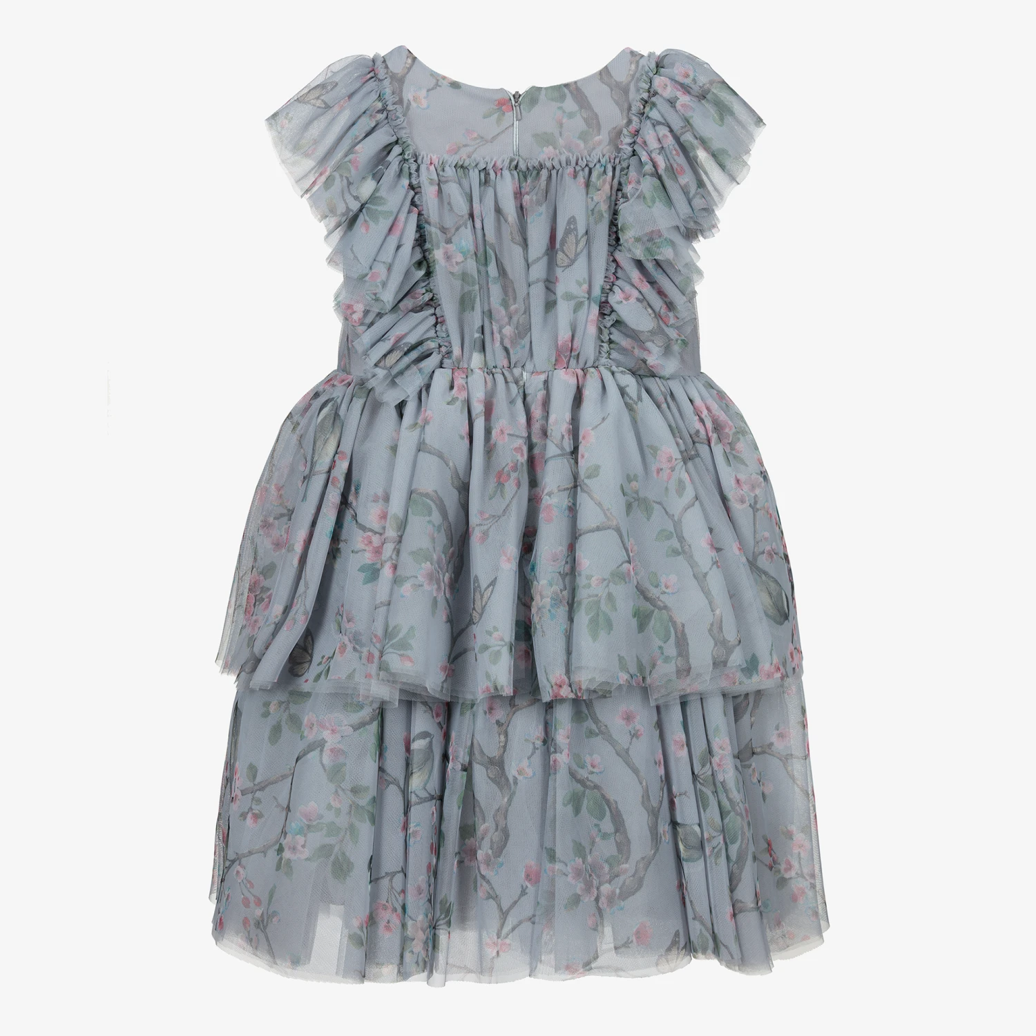 Teen girls blue grey prom dress by Monnalisa, with a cherry blossom and bird pattern in pink and green. This special occasion dress is made in tiered layers of soft tulle and is lined in soft cotton voile. There are layered tulle ruffles over the shoulders and it fastens with a zip on the back.