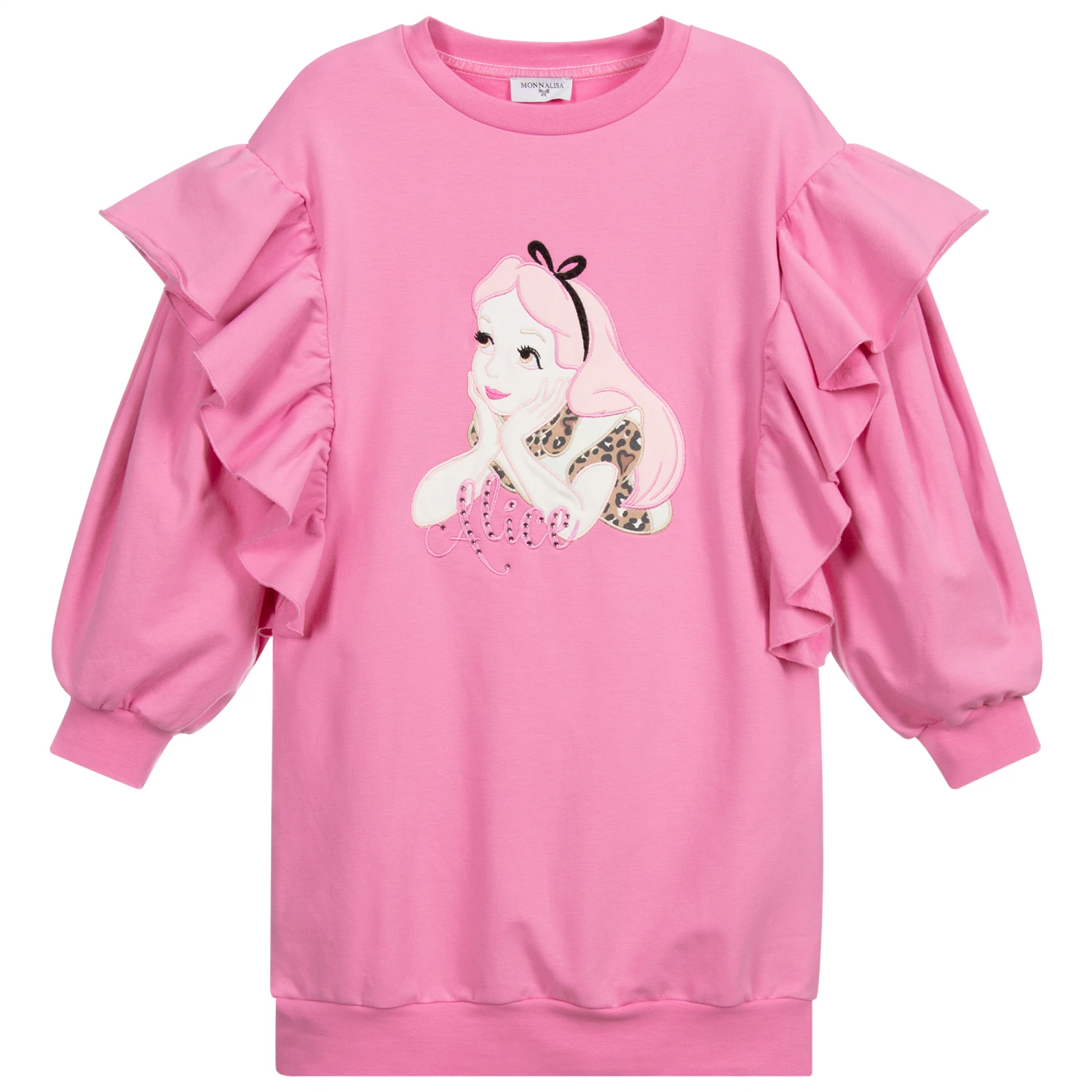 Teen girls pink sweatshirt dress with ruffles over the shoulders by Italian designer Monnalisa. Made in mid-weight cotton jersey, it has Disney’s Alice in Wonderland appliqué on the front, with ‘Alice’ in sparkling pink diamantés below.