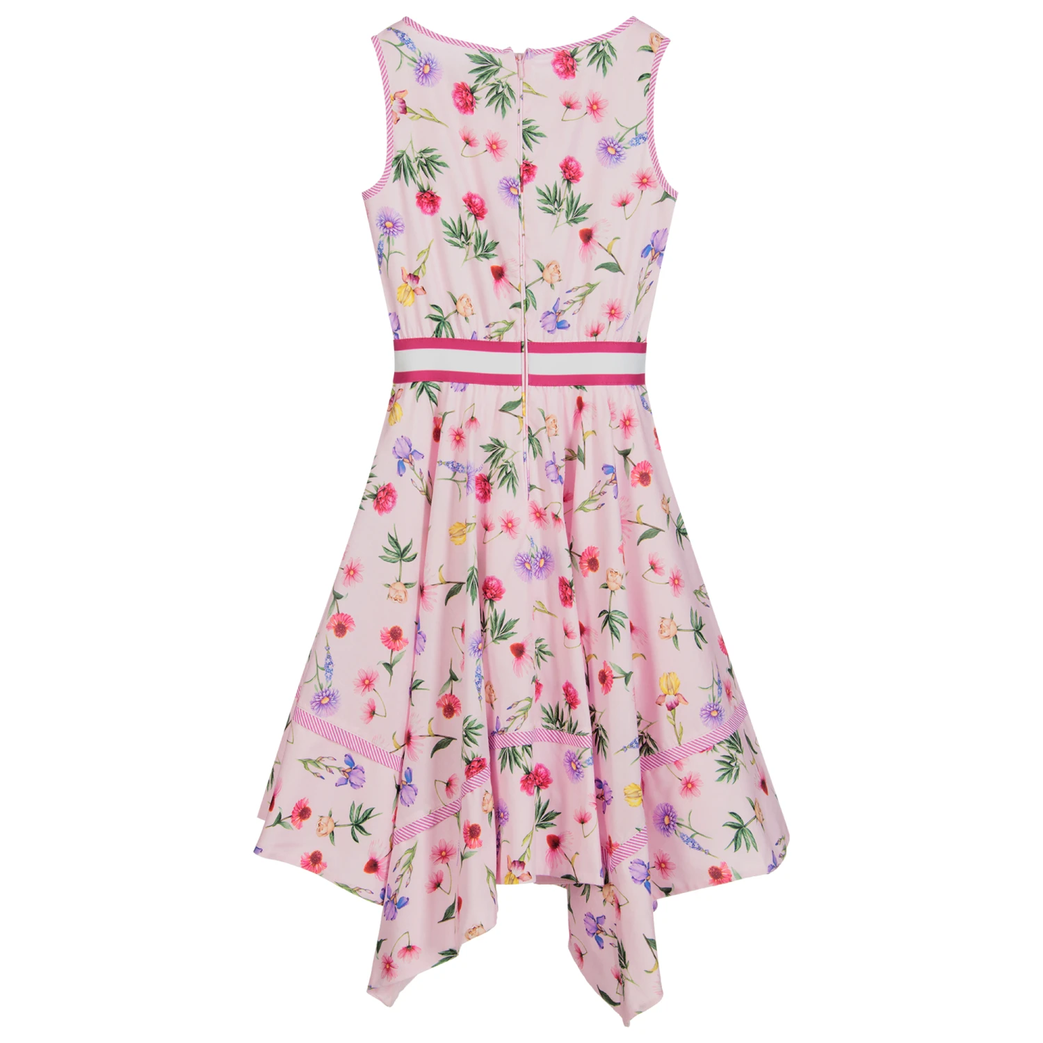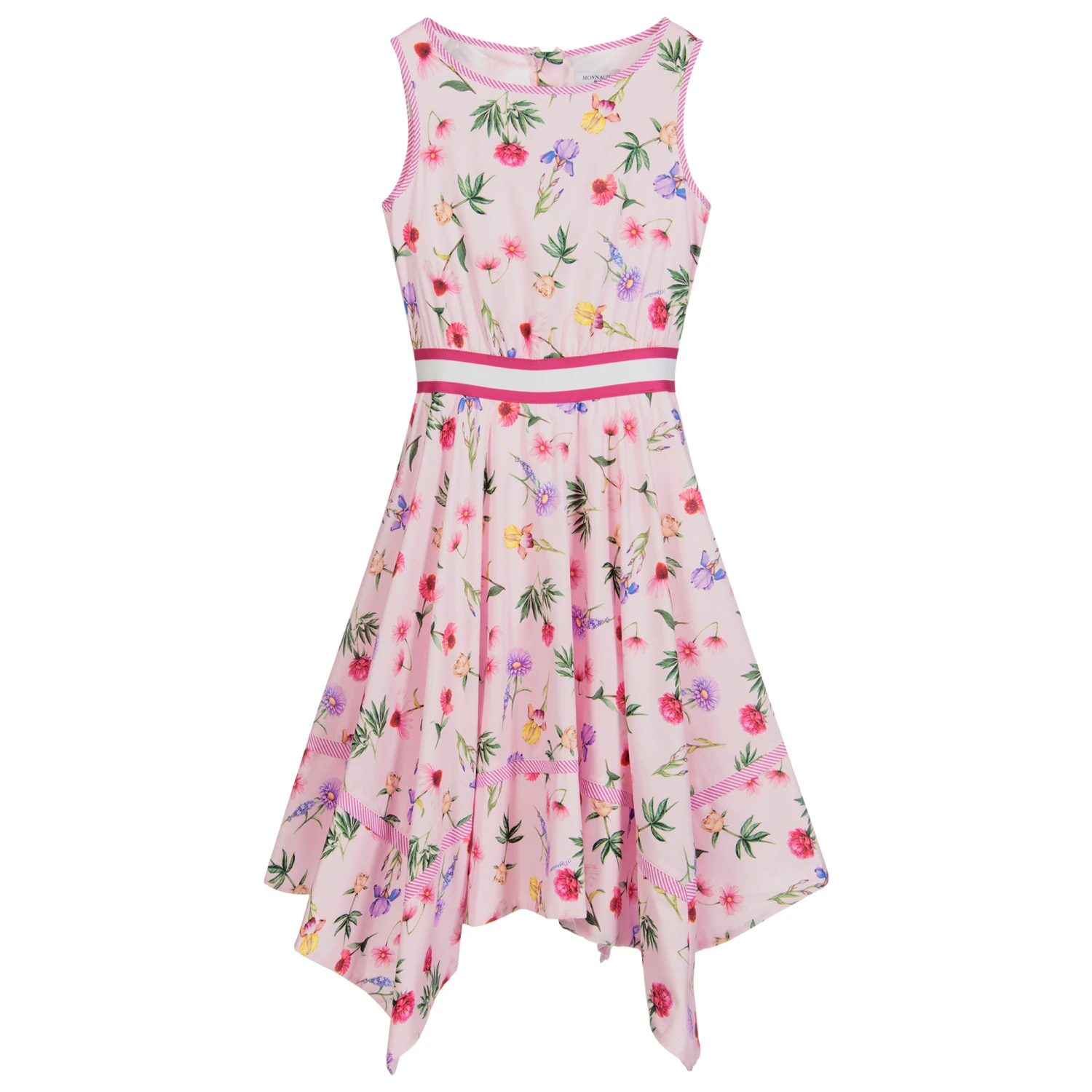 Pink cotton dress for teen girls by Monnalisa, with a purple, yellow and green floral print and an asymmetric hem. There is a pink and white elasticated trim on the waist and tulle trim on the lightweight cotton lining.