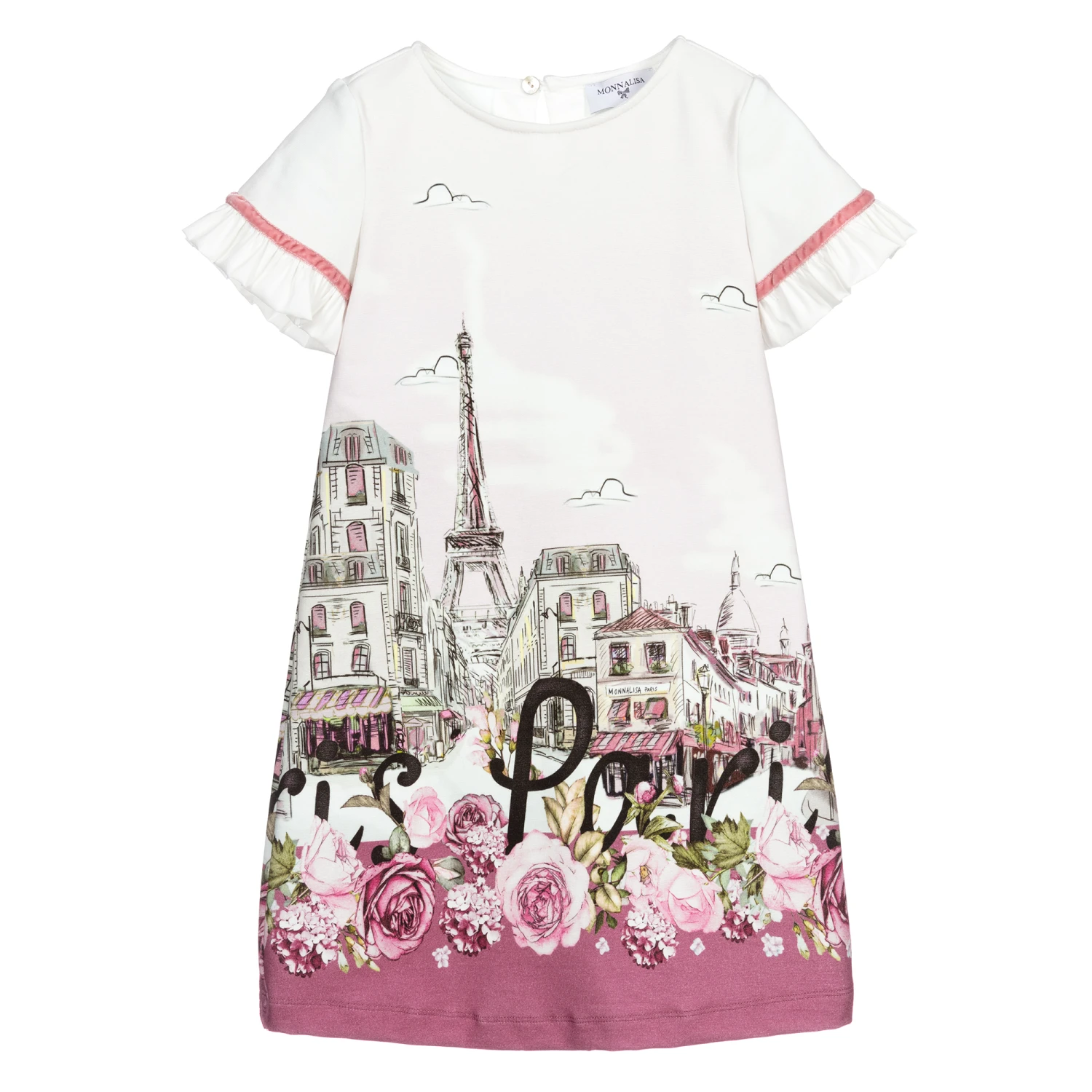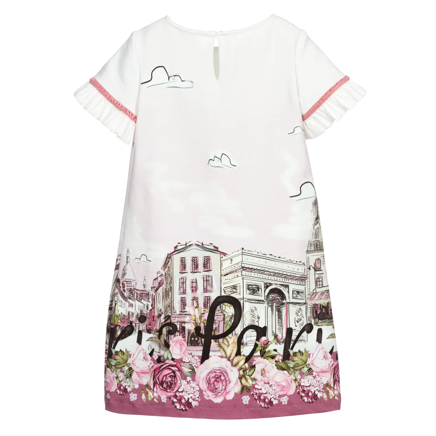Pink and ivory shift dress for teen girls by Monnalisa, made in mid-weight viscose jersey. It has a Paris skyline with ‘Paris’ printed in black and a pink floral pattern along the hem. The sleeves are frilled with a pink velvet trim and there is a single button fastening on the back.
