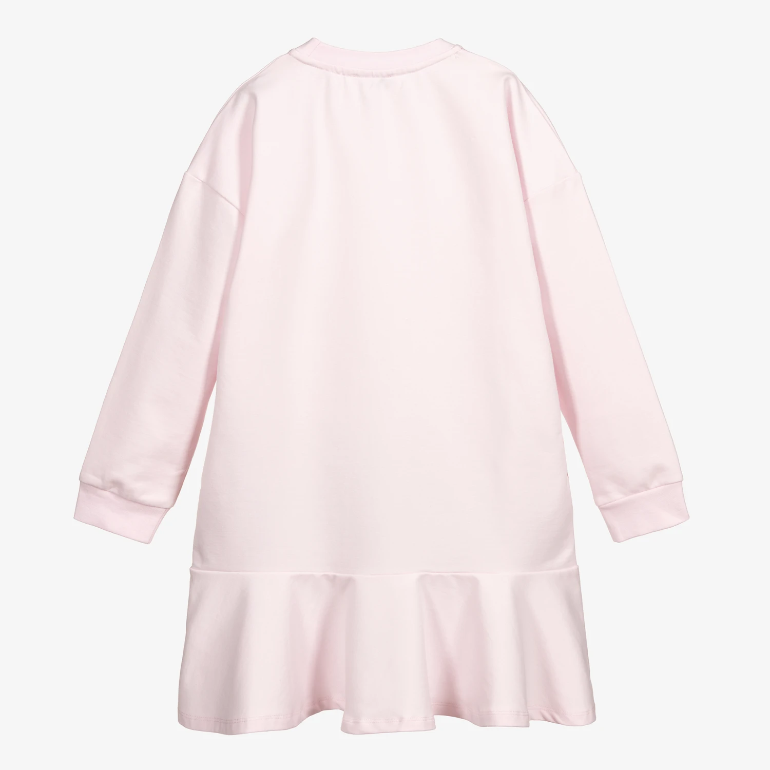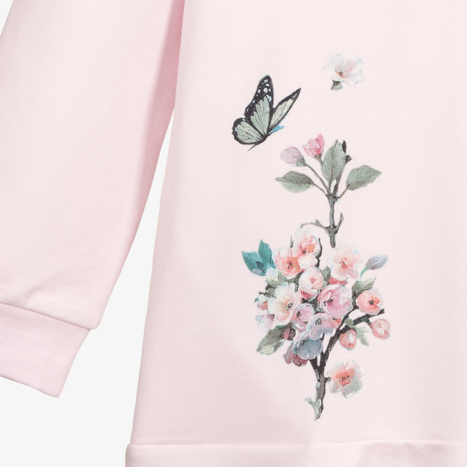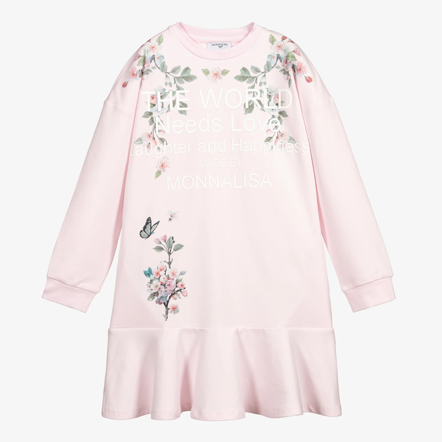 Casual pretty pink cotton sweatshirt jersey dress for teen girls, by Monnalisa. It has a cool white slogan appliqué with a pretty pink and green blossom print.