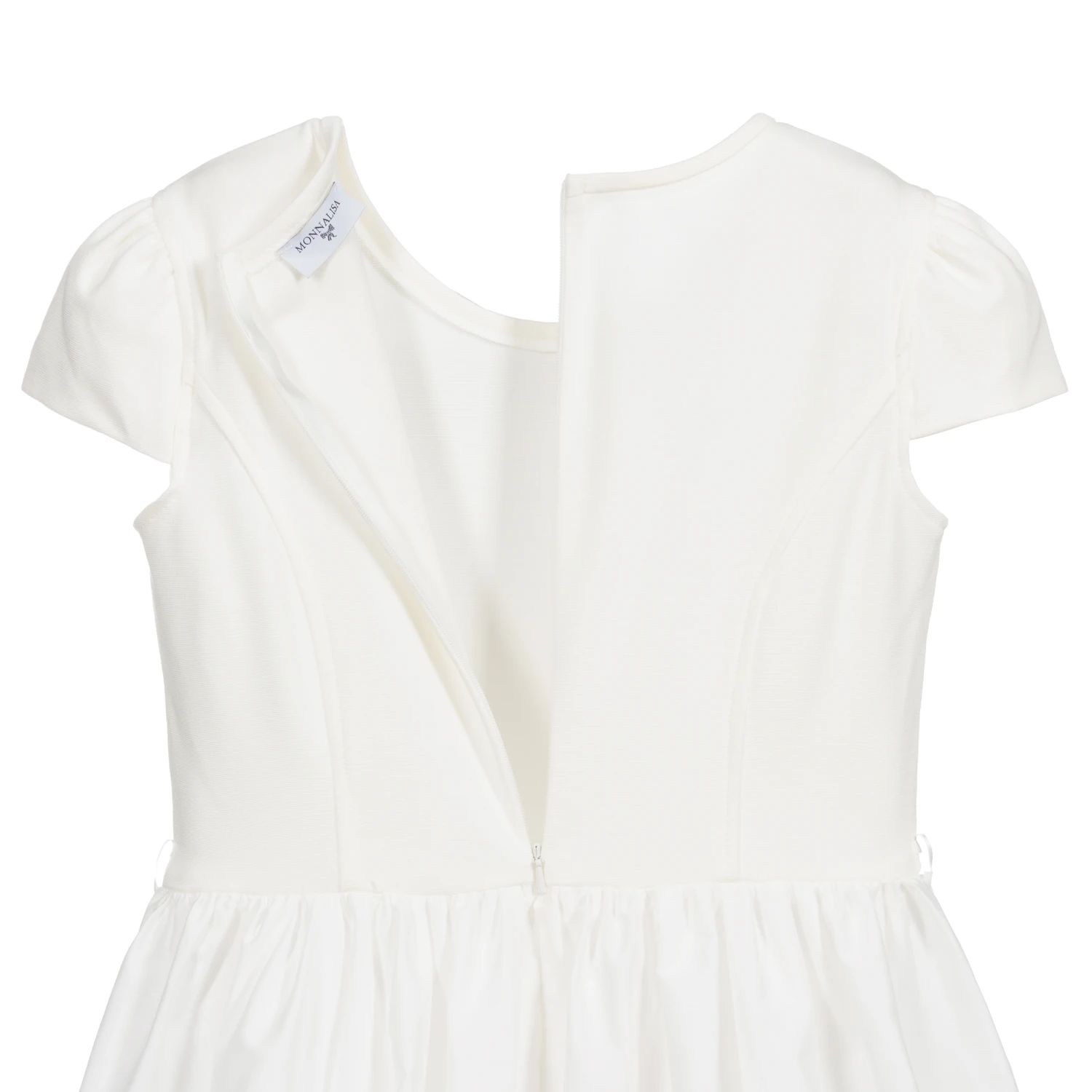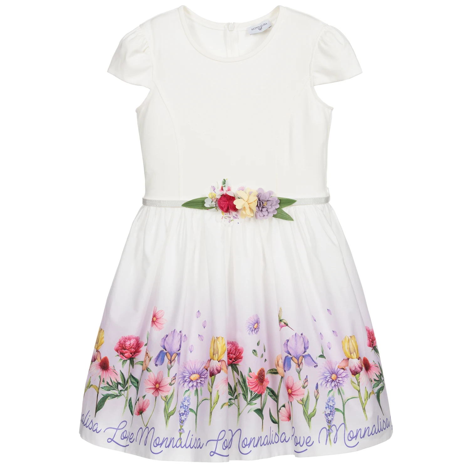 Teen girls off-white fit and flare dress by Monnalisa, with a pink, purple and yellow floral design. The bodice is made from soft viscose jersey, with capped sleeves and has a detachable flower appliqué belt. The skirt is made in soft cotton, with a purple logo print and tulle trims on the lining for added volume.