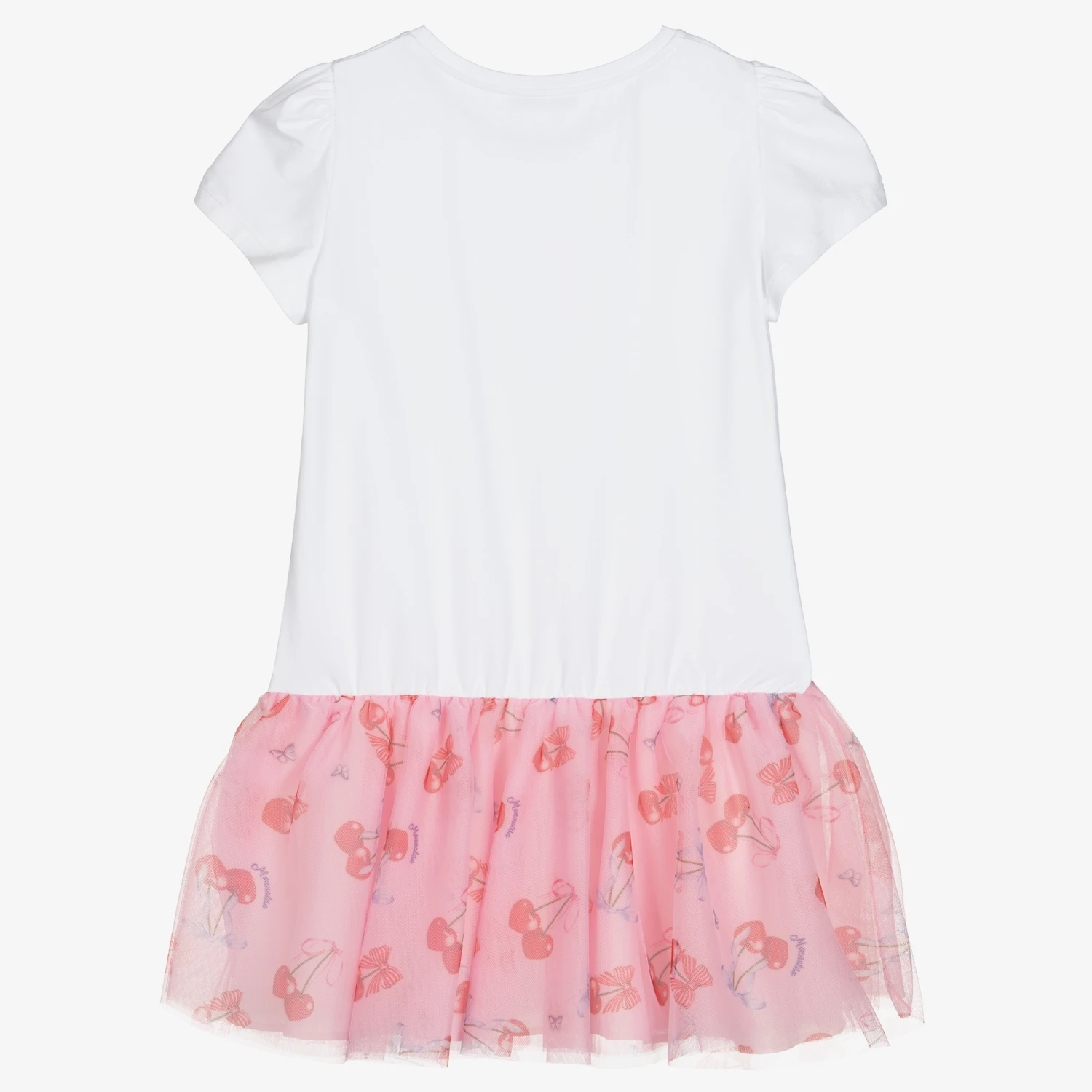 Exclusive to Childrensalon, this delicately comfortable white and pink dress for teen girls is by Monnalisa. Made in soft and stretchy jersey with puffed sleeves, the bodice has a cherry and bow motif in red, white and blue. The dress has a dropped waist with a gathered pink tulle skirt, patterned in a matching cherry print.