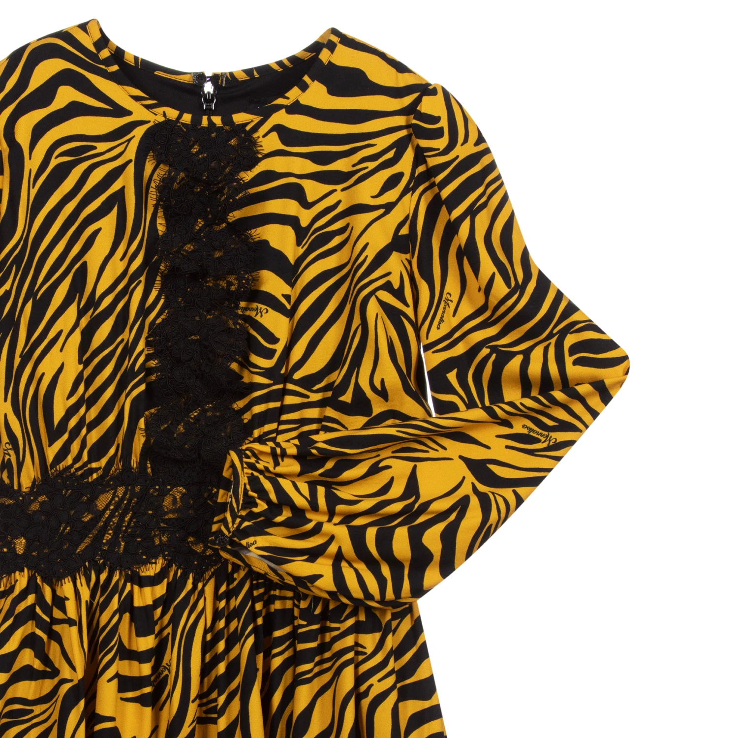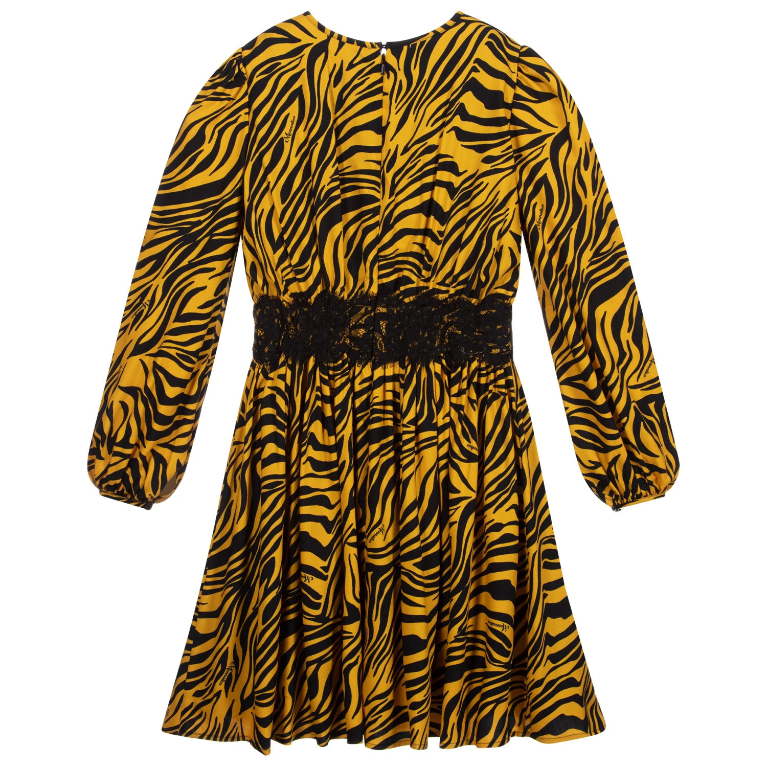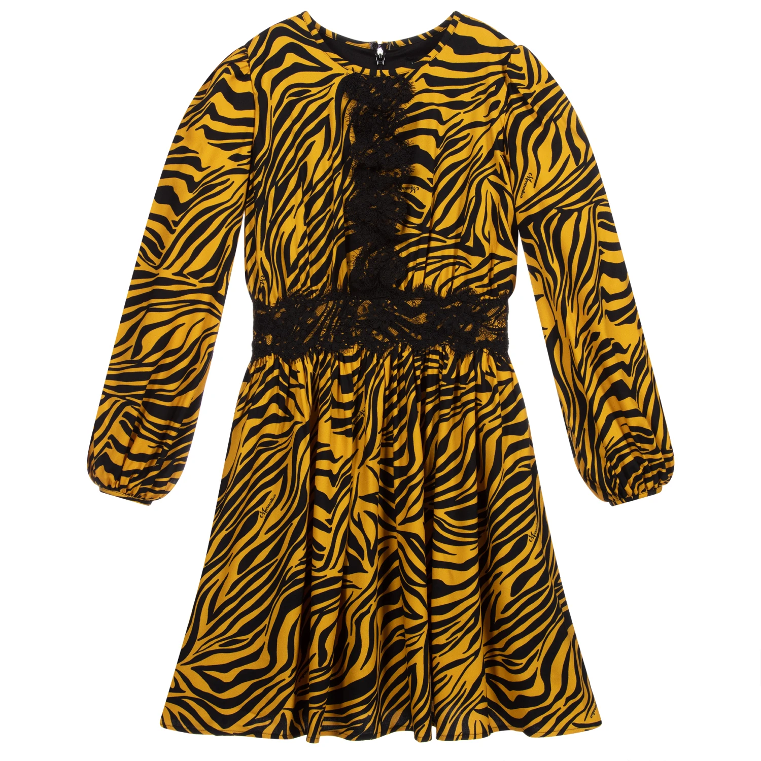 Teen girls yellow and black dress by Italian designer Monnalisa, with puffed sleeves. Made in lightweight viscose, it has a zebra print and black lace trims.