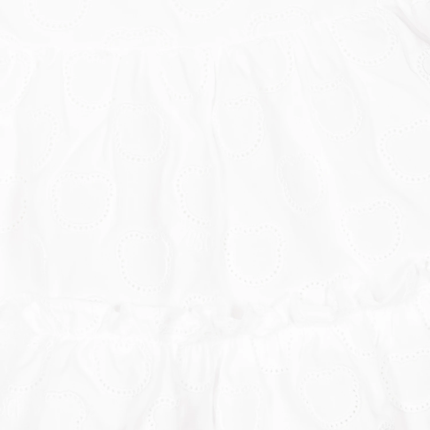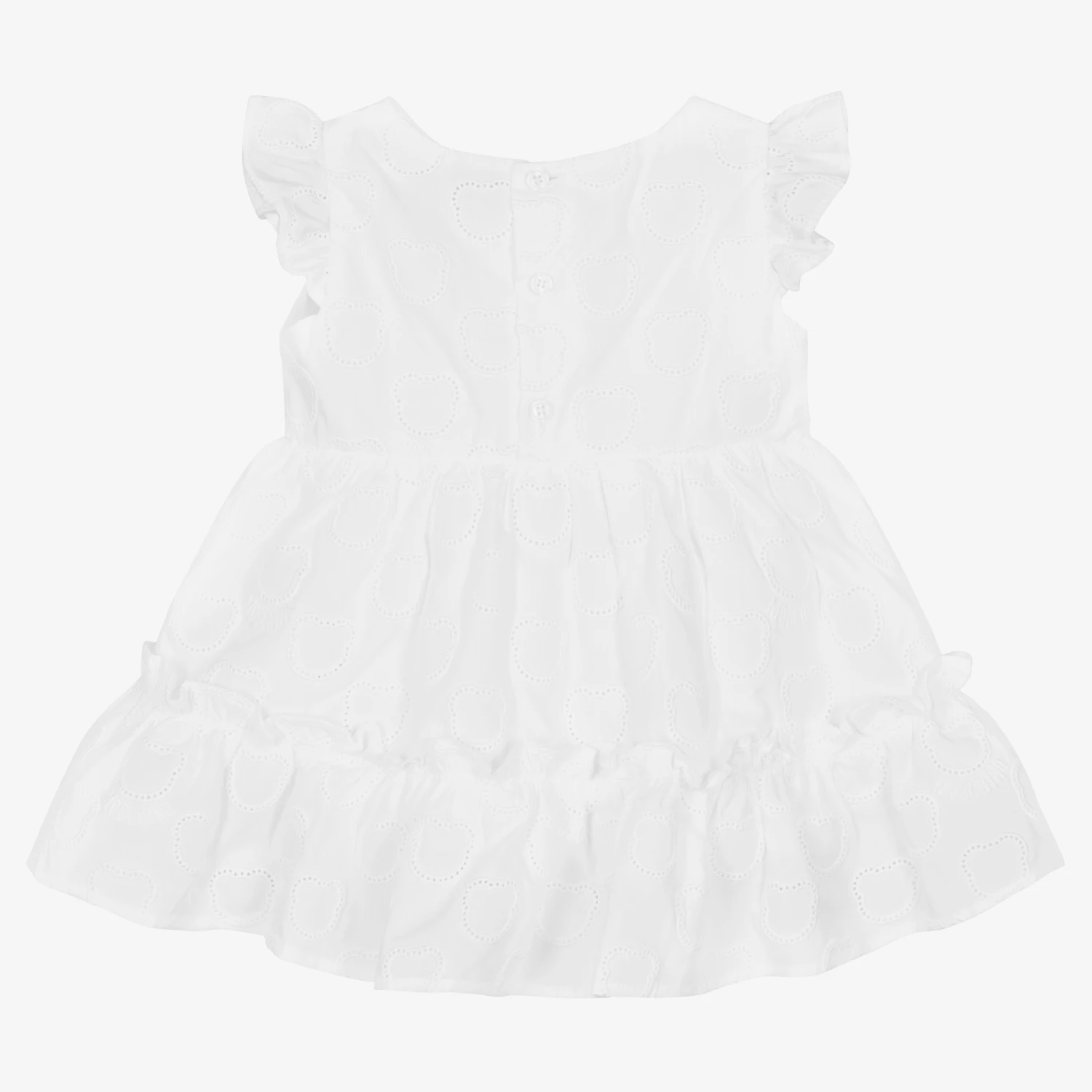 White dress for baby girls by Italian brand Moschino Baby, made in the softest cotton poplin with a lightweight voile lining. This luxury dress has intricate cutwork embroidery in the shape of the brand’s signature Teddy Bear logo, for a stunning yet simplistic style. It has ruffled sleeves and pearlescent button fastenings on the back.