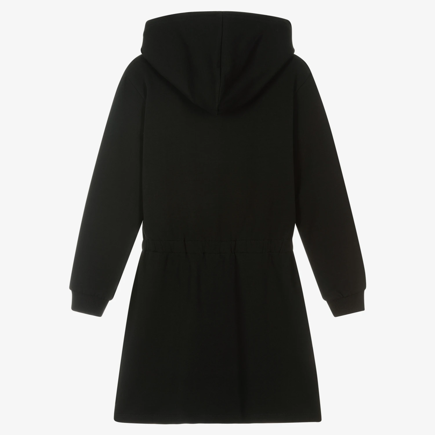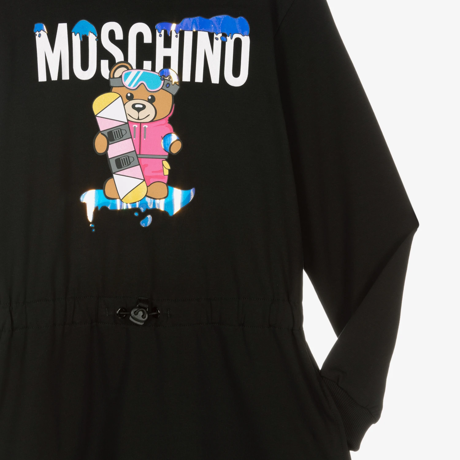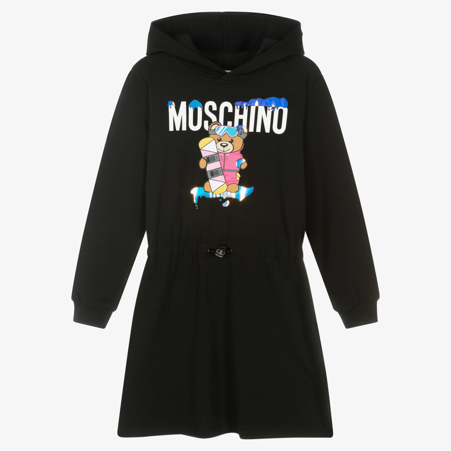 Teen girls black hooded dress by Moschino Kid-Teen. There is fun snow-boarding Moschino Teddy Bear logo print on the front, with metallic reflective trims. Made in mid-weight cotton sweatshirt jersey, with a warm fleecy inside, it has side seam pockets and a drawstring waist with a toggle fastening.