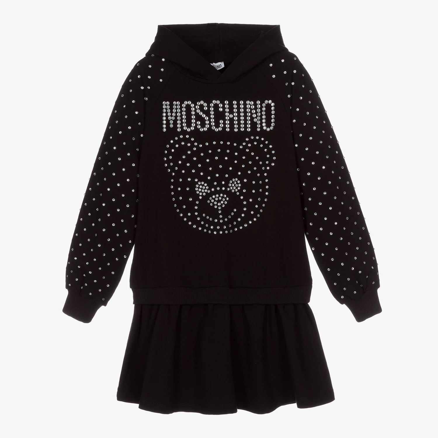 Eye-catching casual black dress for teen girls by luxury Italian designer Moschino Kid-Teen, with the appearance of a hoodie and skirt. As seen in the main collection, it has a rhinestone Moschino Teddy Bear logo on the front and coordinating raglan sleeves. Both stylish and comfortable, it is made in soft, stretchy cotton jersey with a cosy fleecy inside. Easy to wear, it just slips on over the head.