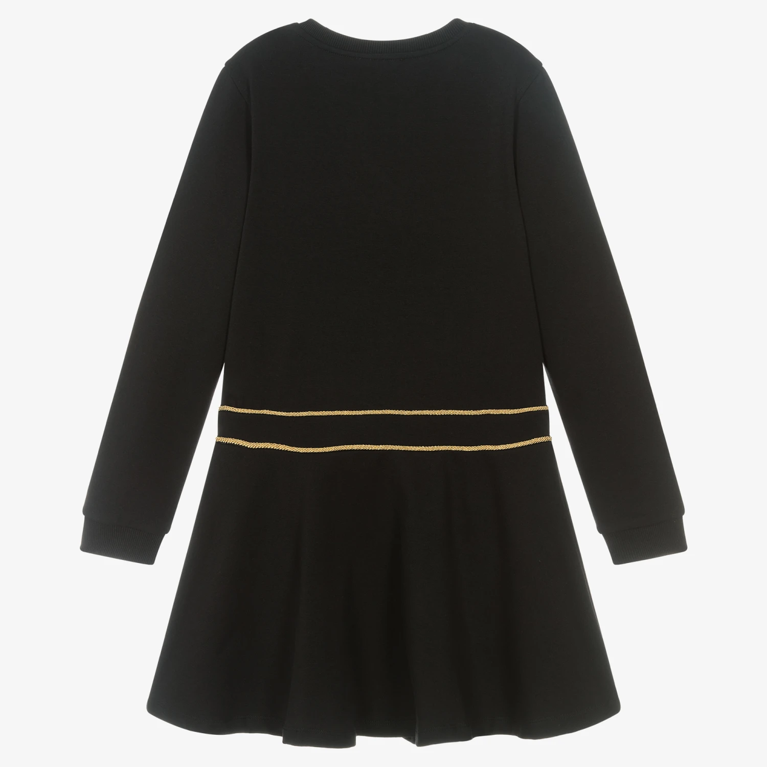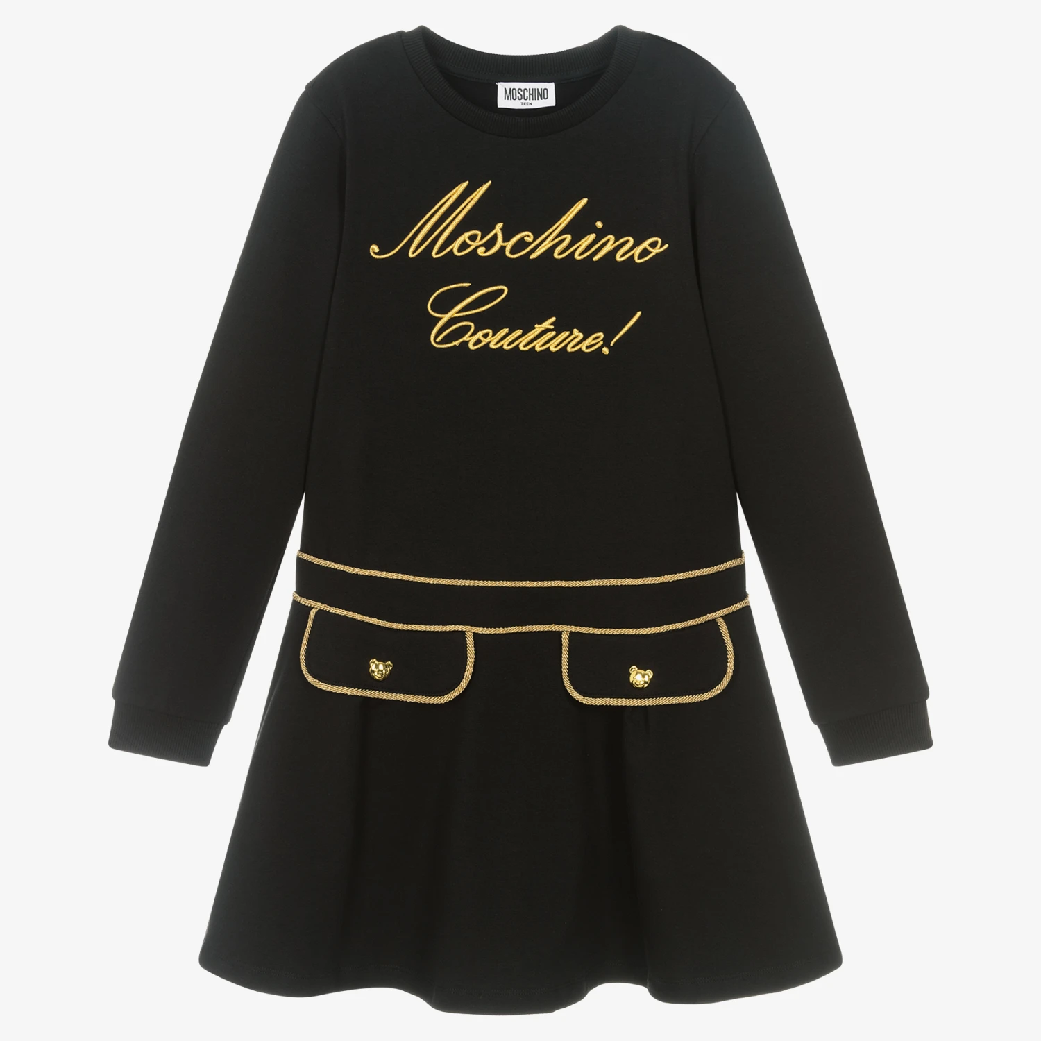 Comfort and style are beautifully combined in this black dress for teen girls from luxury designer, Moschino Kid-Teen. As seen in the main collection, the front is beautifully embroidered with ‘Moschino Couture!’ script in lustrous gold thread. The dropped waist and faux front pockets are trimmed with glittering gold cord for a glamorous touch, and there are gold metal Teddy Bear logo studs on the flaps. Made in comfortable cotton sweatshirt jersey, it has classic ribbing on the crew neck and cuffs.
