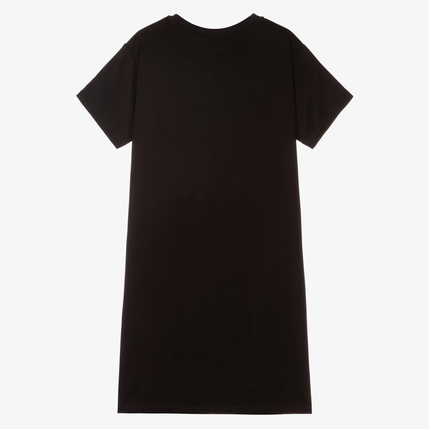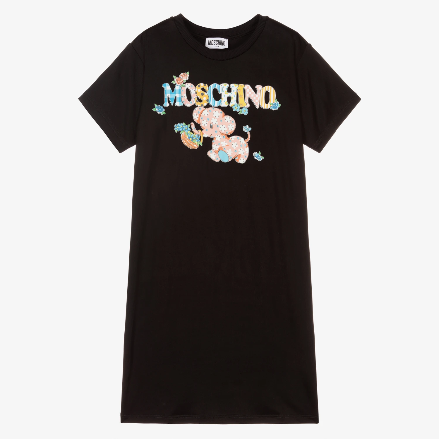 Black T-shirt dress for teen girls by Moschino Kid-Teen, inspired by the adult collection. This comfortable piece is made in soft, stretchy viscose jersey with a lovely sheen. There is a ribbed crew neckline and a vintage-style floral baby elephant and logo print on the front.