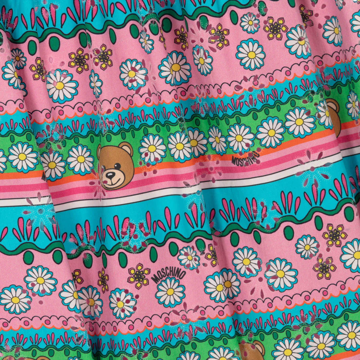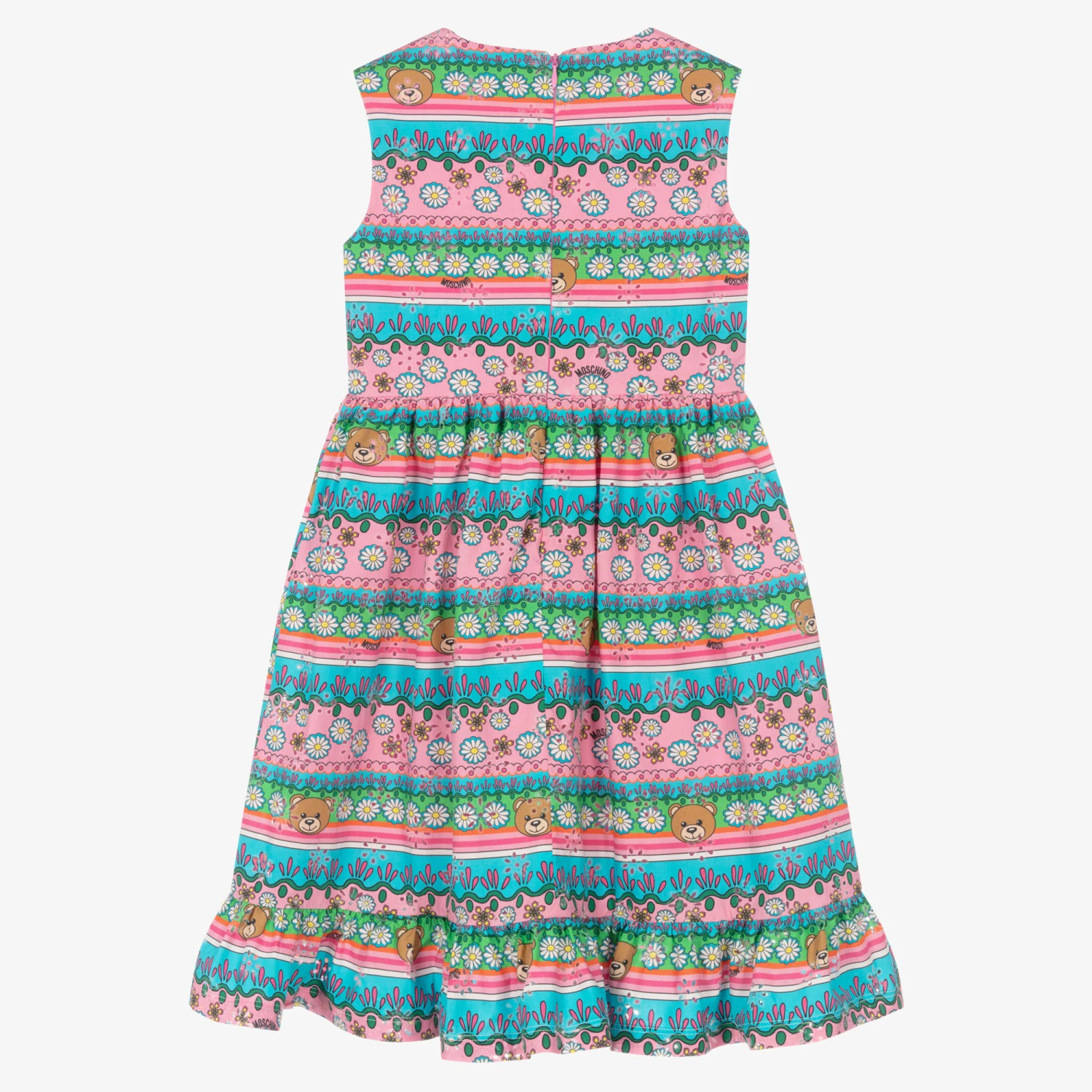 Ideal for summer days, this sleeveless pink and blue dress is for teen girls by Moschino Kid-Teen. Patterned with floral-inspired striped artwork, the brand’s recognisable Moschino Teddy Bear is incorporated within for a branded look. It seamlessly fastens with a hidden zip on the back and has chic cut-out floral details all-over for a summer-inspired look.
