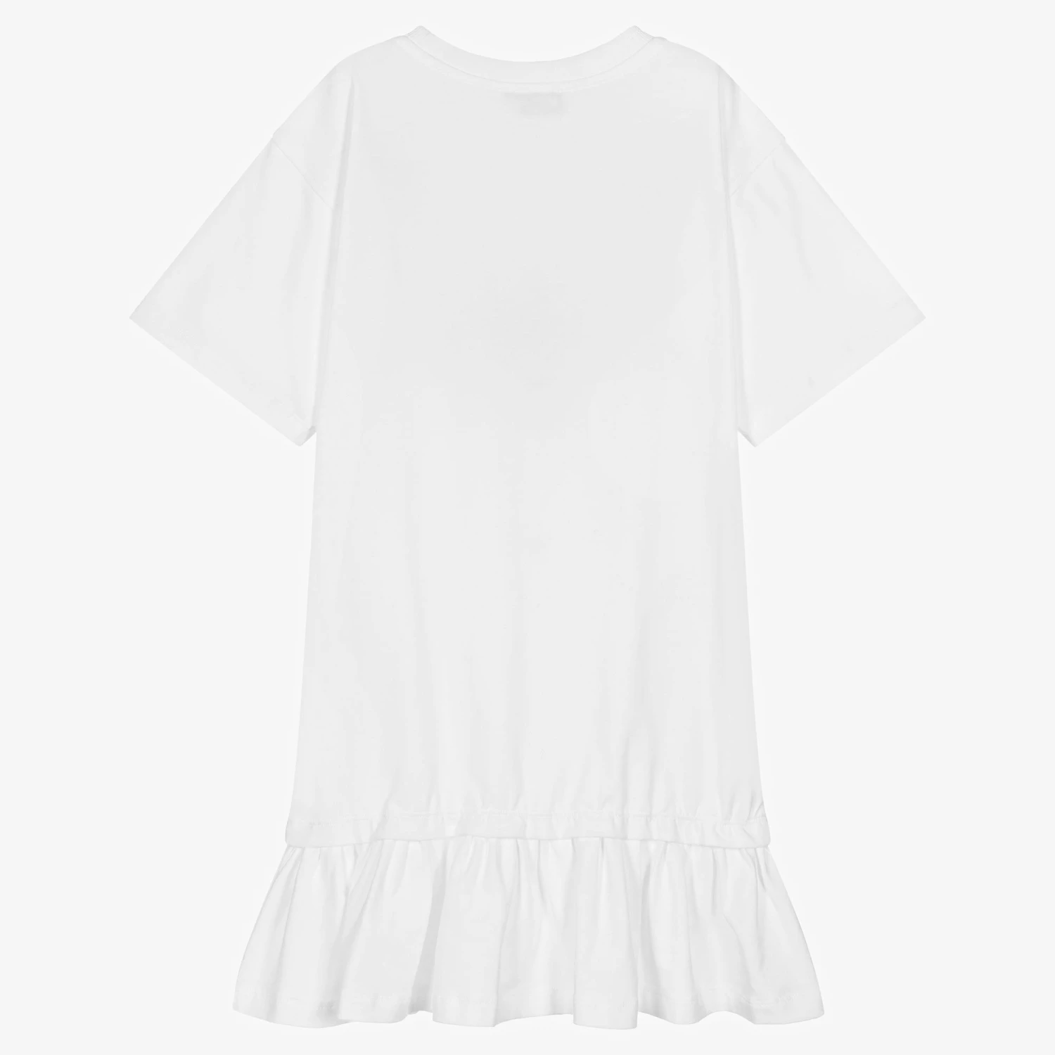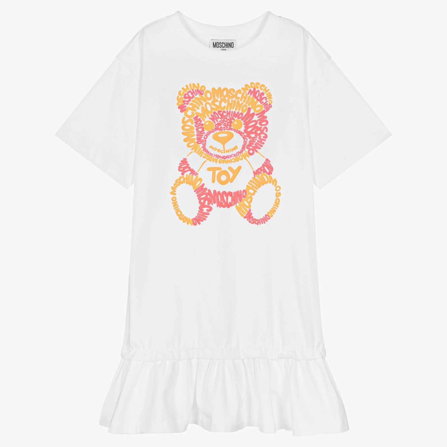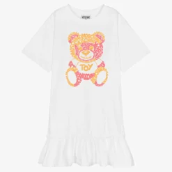 Stylish white dress for teen girls by Moschino Kid-Teen, inspired by the brand’s Moschino Teddy Bear logo. It has a contemporary raised neon pink and orange calligram print on the front for a modern twist, and a dropped waist for a laid-back look. Made in cotton jersey, this casual dress is soft and comfortable to wear.