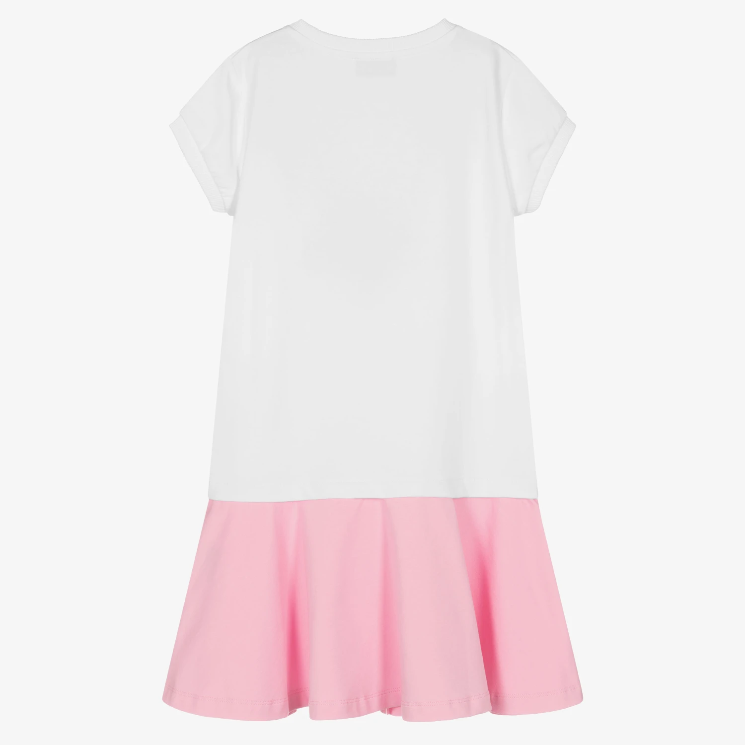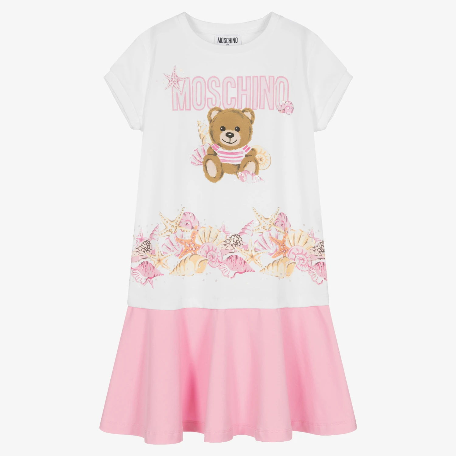 Teen girls white and pink dress by Moschino Kid-Teen, in a casual T-shirt style. Featuring a relaxed, dropped waist, it has the brand’s iconic logo printed across the front in pink with the instantly recognisable Moschino Teddy Bear. Summery pink and yellow sea shells are printed on the front for a holiday-inspired look.