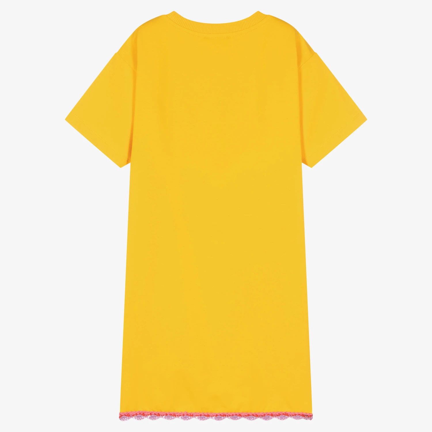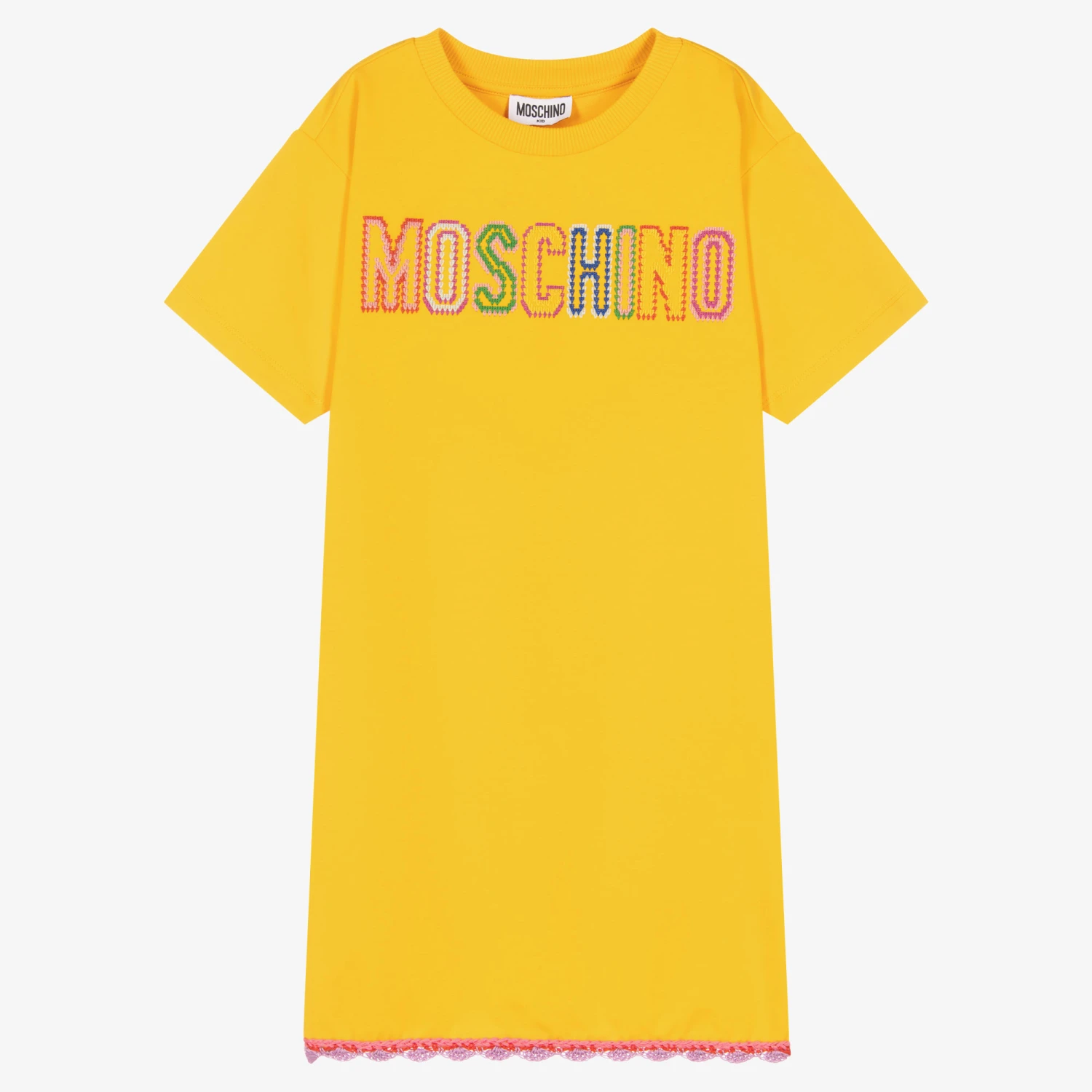 Bright yellow T-shirt dress for teen girls by Moschino Kid-Teen, as seen in the main collection. For a summer-inspired look, it has an on-trend, colourful crochet logo knit across the front and a matching crochet hem. Ideal for laid-back days, it is made in soft cotton jersey for a casual fit.