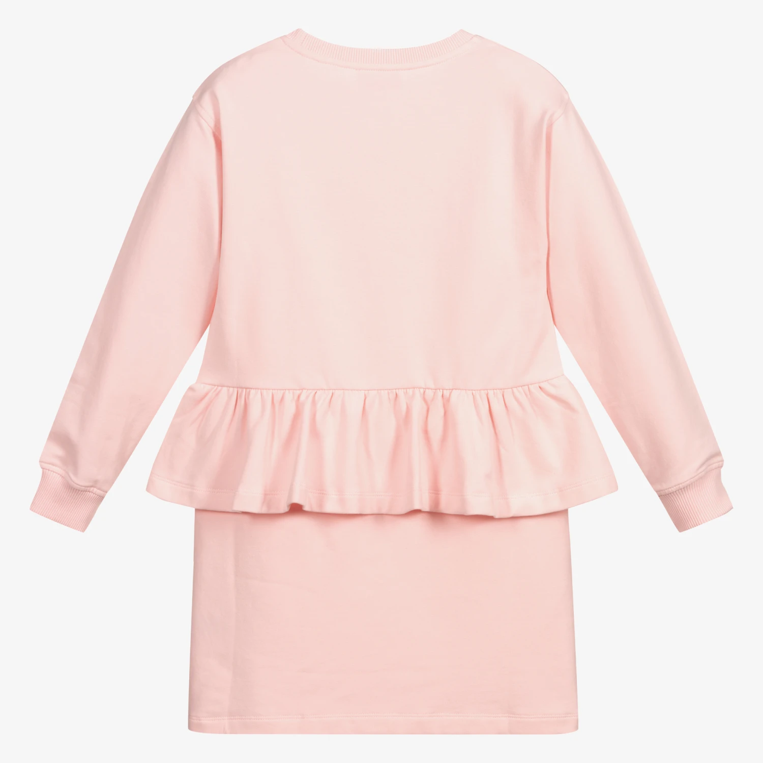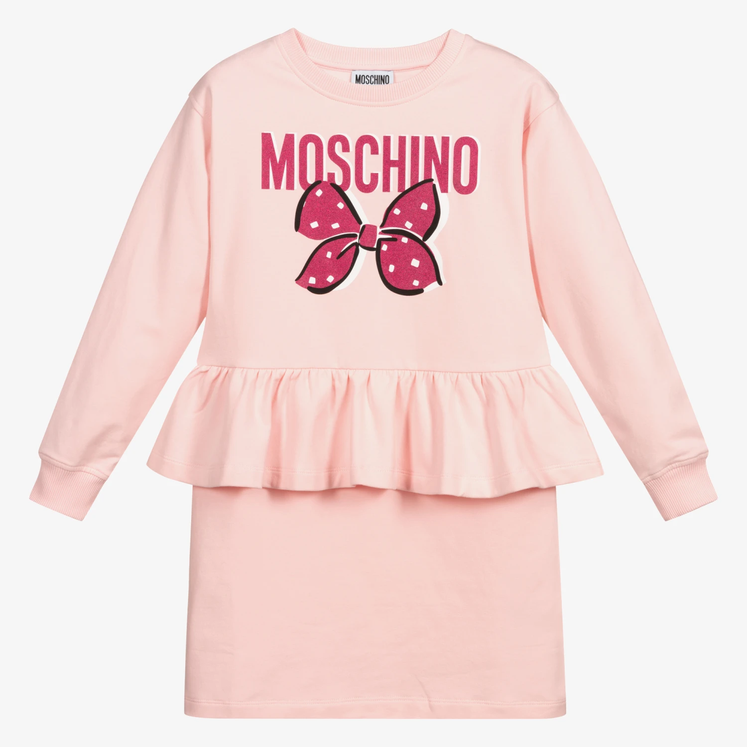 Teen girls can add a little sparkle to their dress collection with this pink style by Italian designer Moschino Kid-Teen. Made in lightweight jersey with a brushed inside, it has the brand’s glittery dark pink logo on the front with a bow below. Around the waist is a large frill, adding a feminine touch.