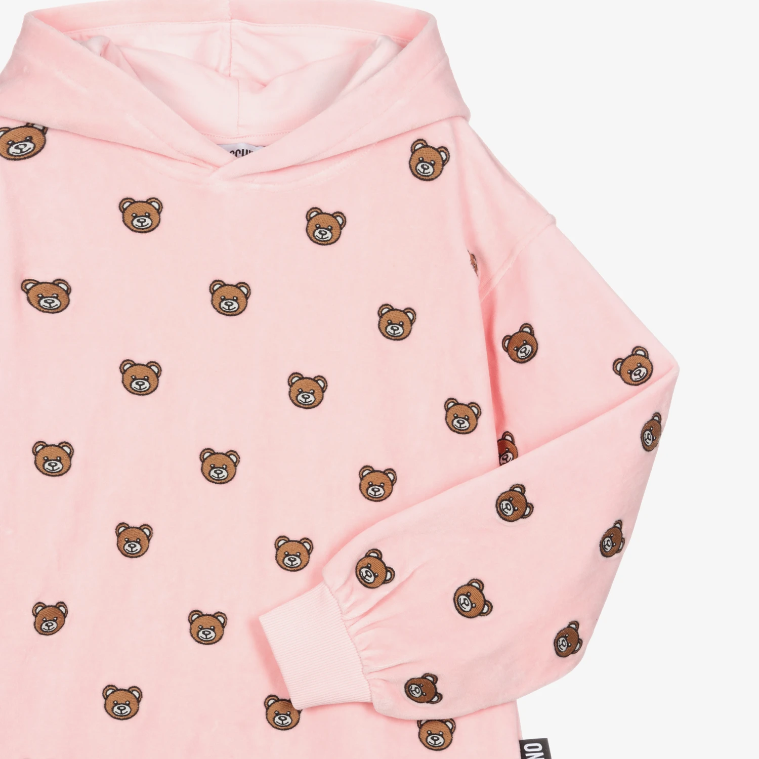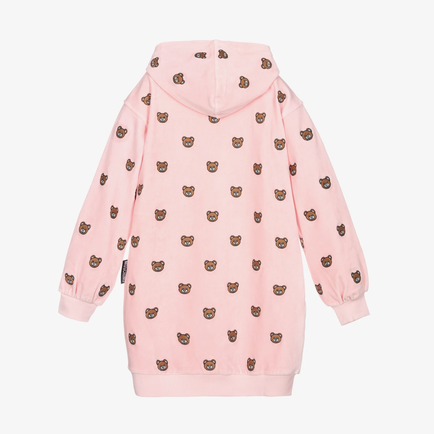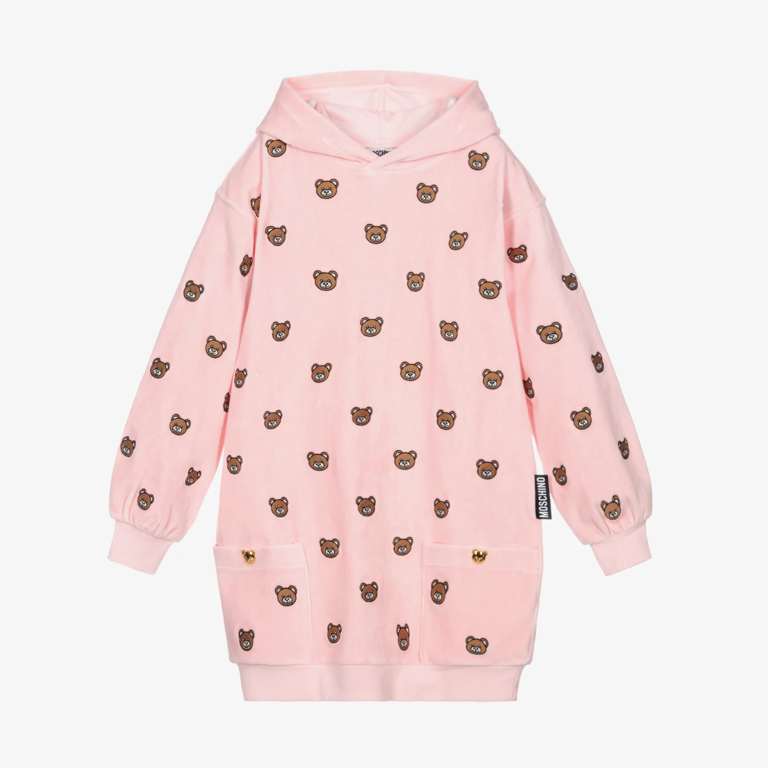 Combing comfort and luxury is this pink hooded dress for girls by Italian luxury brand Moschino Kid-Teen, made in super soft cotton velour. It has the designer’s unmistakeable embroidered Teddy Bear pattern and a large black and white logo tab on the side seam. There are patch pockets on the front with shiny gold Teddy Bear popper fasteners.