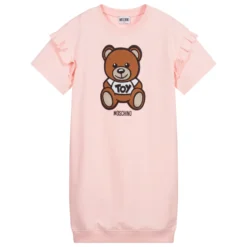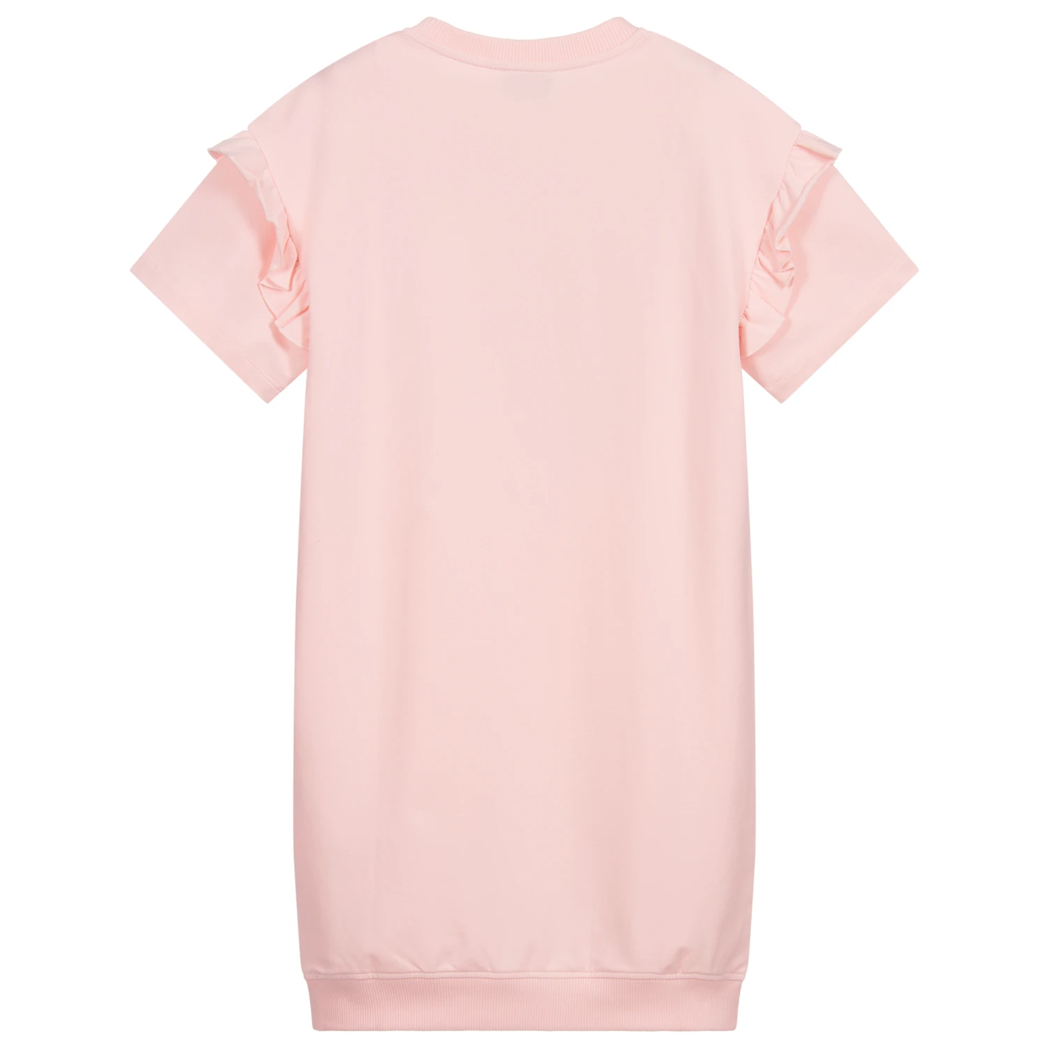 A pink sweatshirt dress for teen girls by Moschino Kid-Teen, made in stretchy cotton jersey. The front has a brown Moschino Teddy Bear logo embroidered appliquƩ. It has a loose style, with ruffles over the shoulders and a ribbed hem.