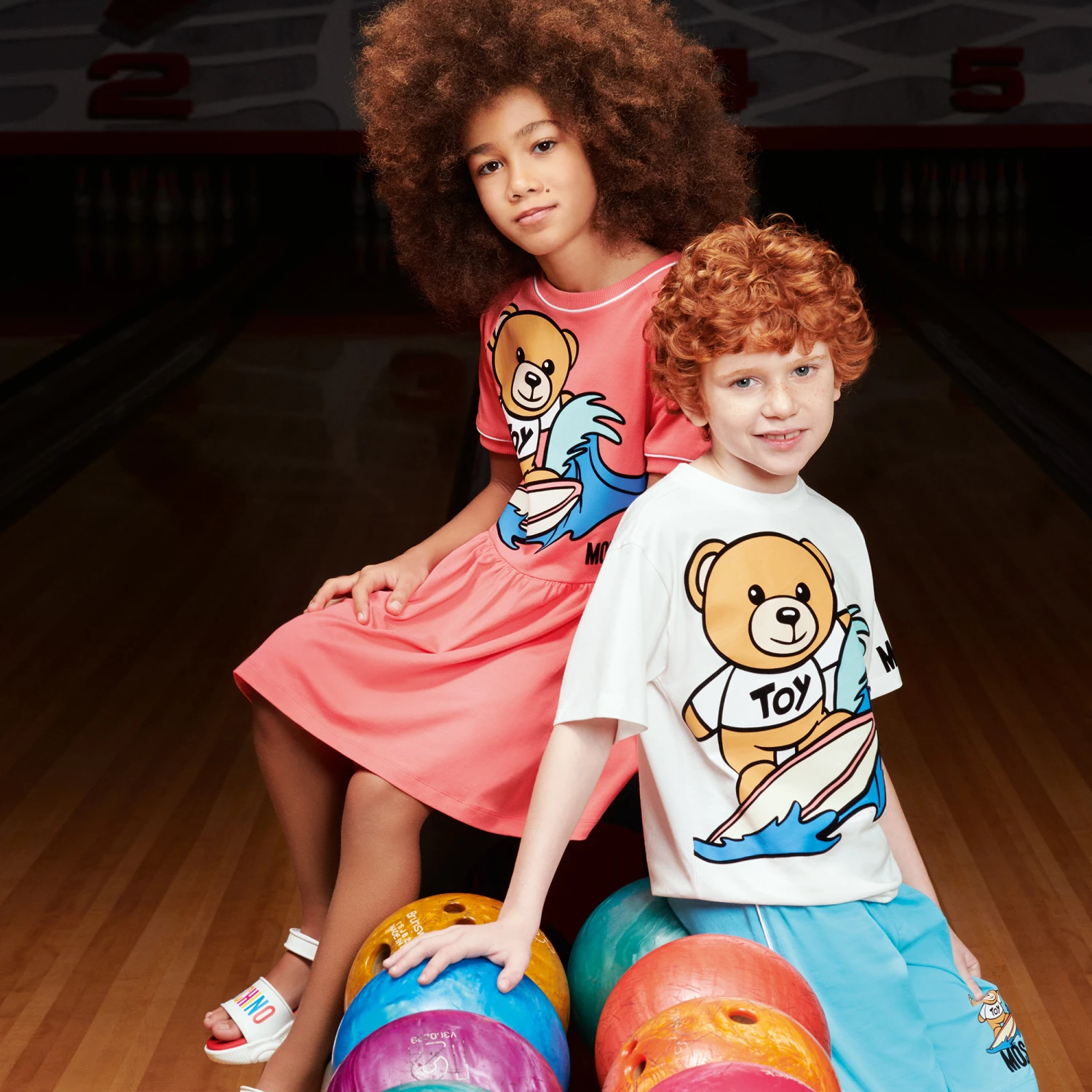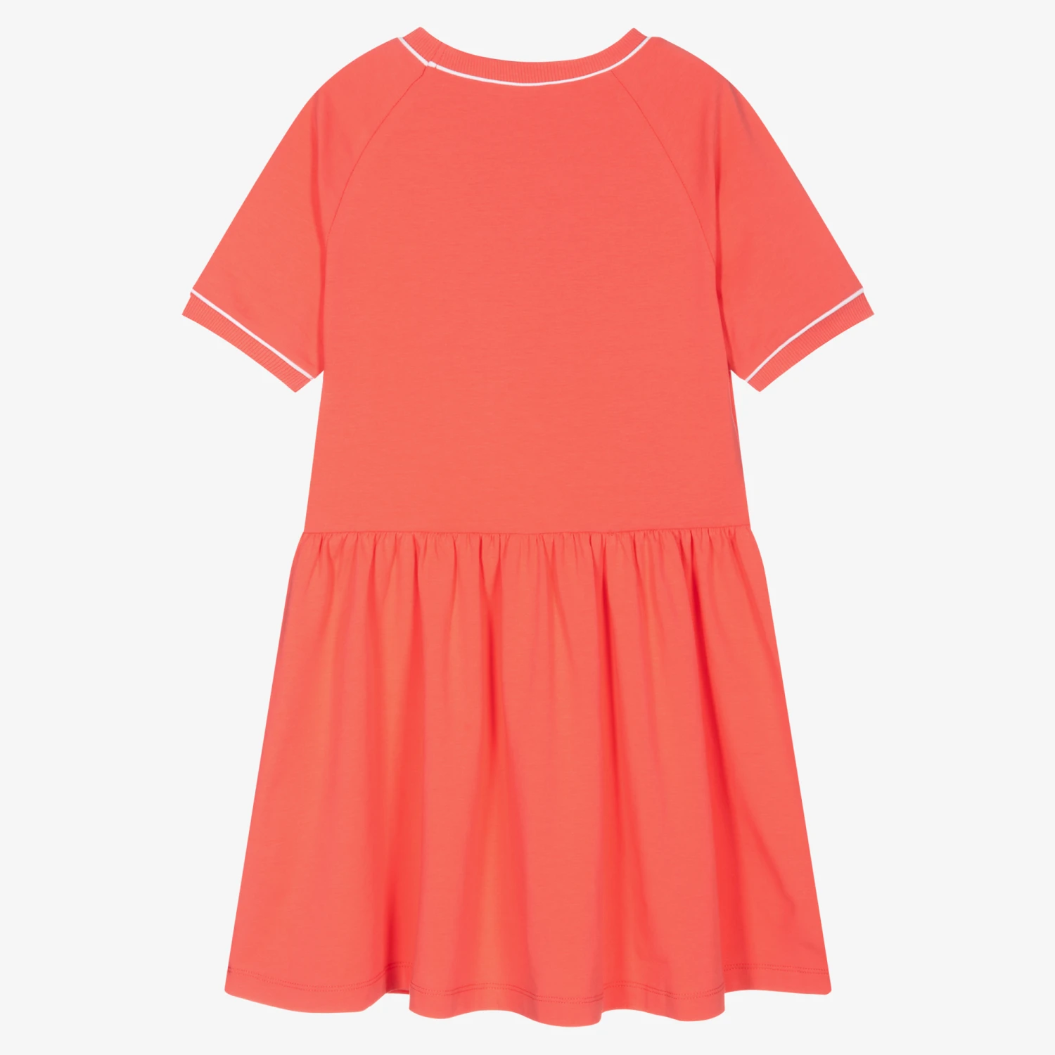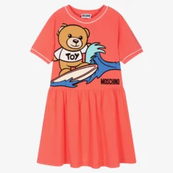 Coral pink Mini-me dress for teen girls by luxury brand Moschino Kid-Teen, with pink piped details. Made with soft and stretchy cotton jersey, it has a fun surfing Moschino Teddy Bear logo with blue waves and black flocked outlines. The designer’s logo can be found near the dropped waist in black flocking.