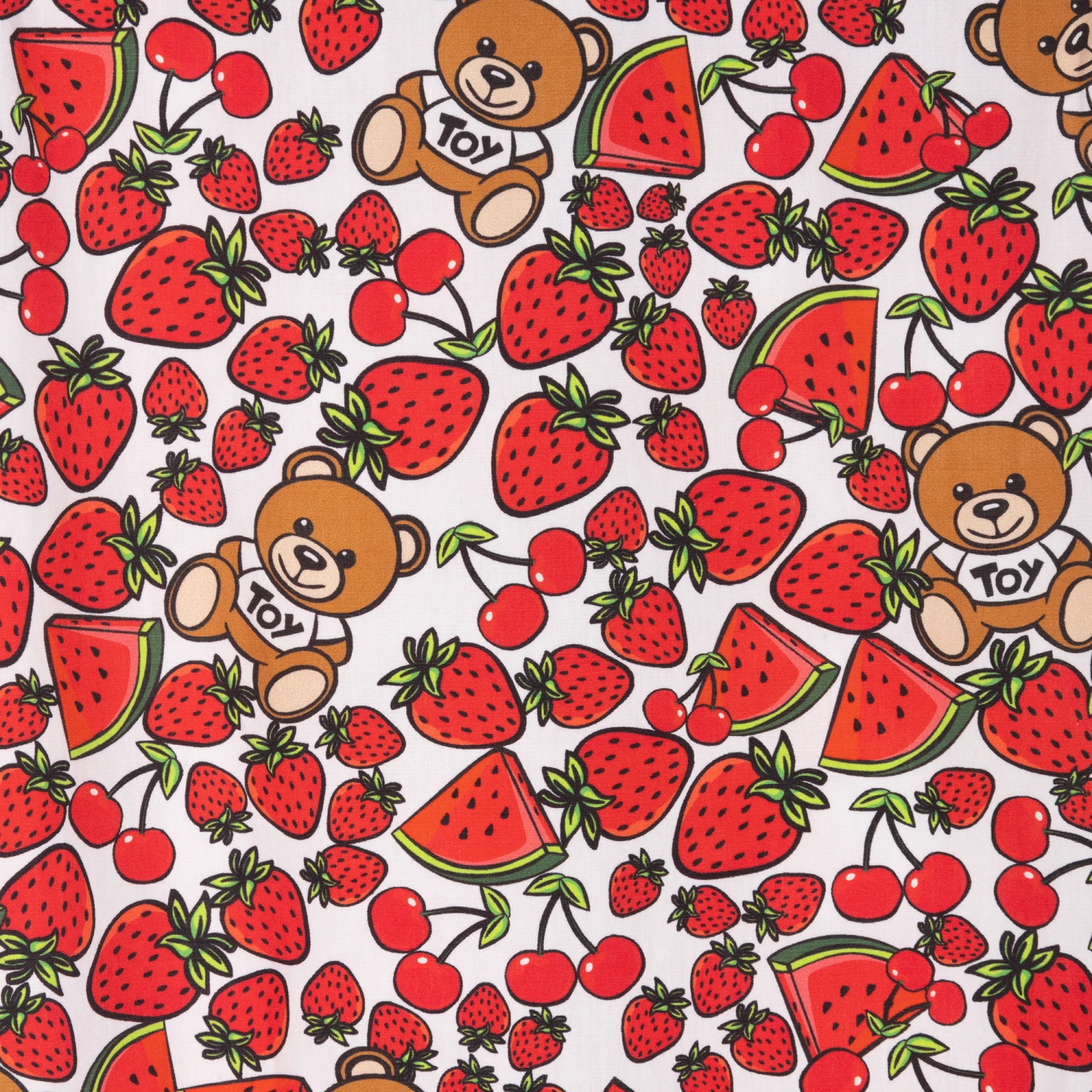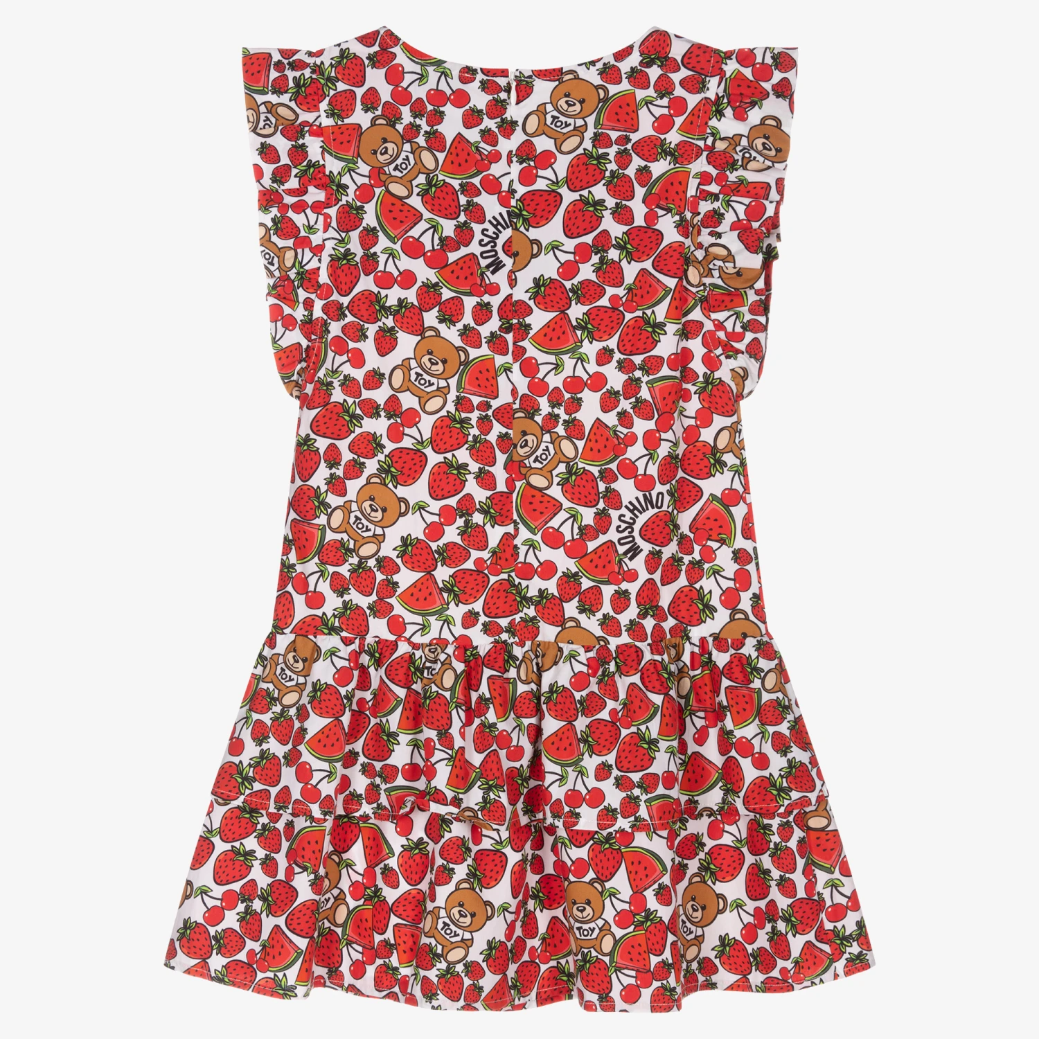 Teen girls white and red dress by luxury brand Moschino Kid-Teen, made with soft, lightweight cotton poplin. As seen in the main collection, it has an all-over cherry, watermelon and strawberry design with the Moschino Teddy Bear logo. It has frilled, capped sleeves, a stylish dropped waist and a tiered skirt. There is a concealed zip fastening on the back.