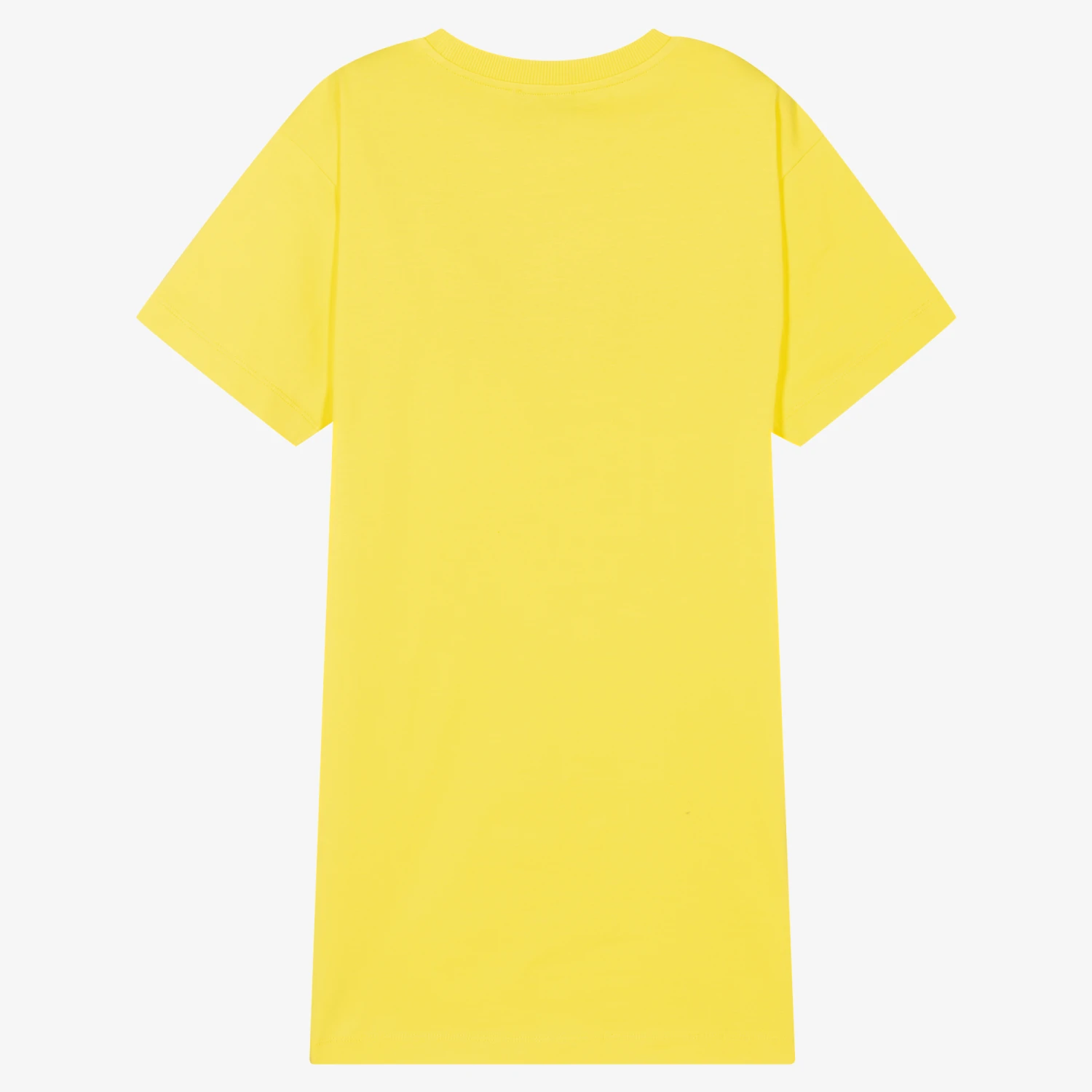 Casual yellow T-shirt dress for teen girls by luxury Italian designer Moschino Kid-Teen, made in comfortable cotton jersey. As seen in the main collection, it has a colourful flocked logo on the front.