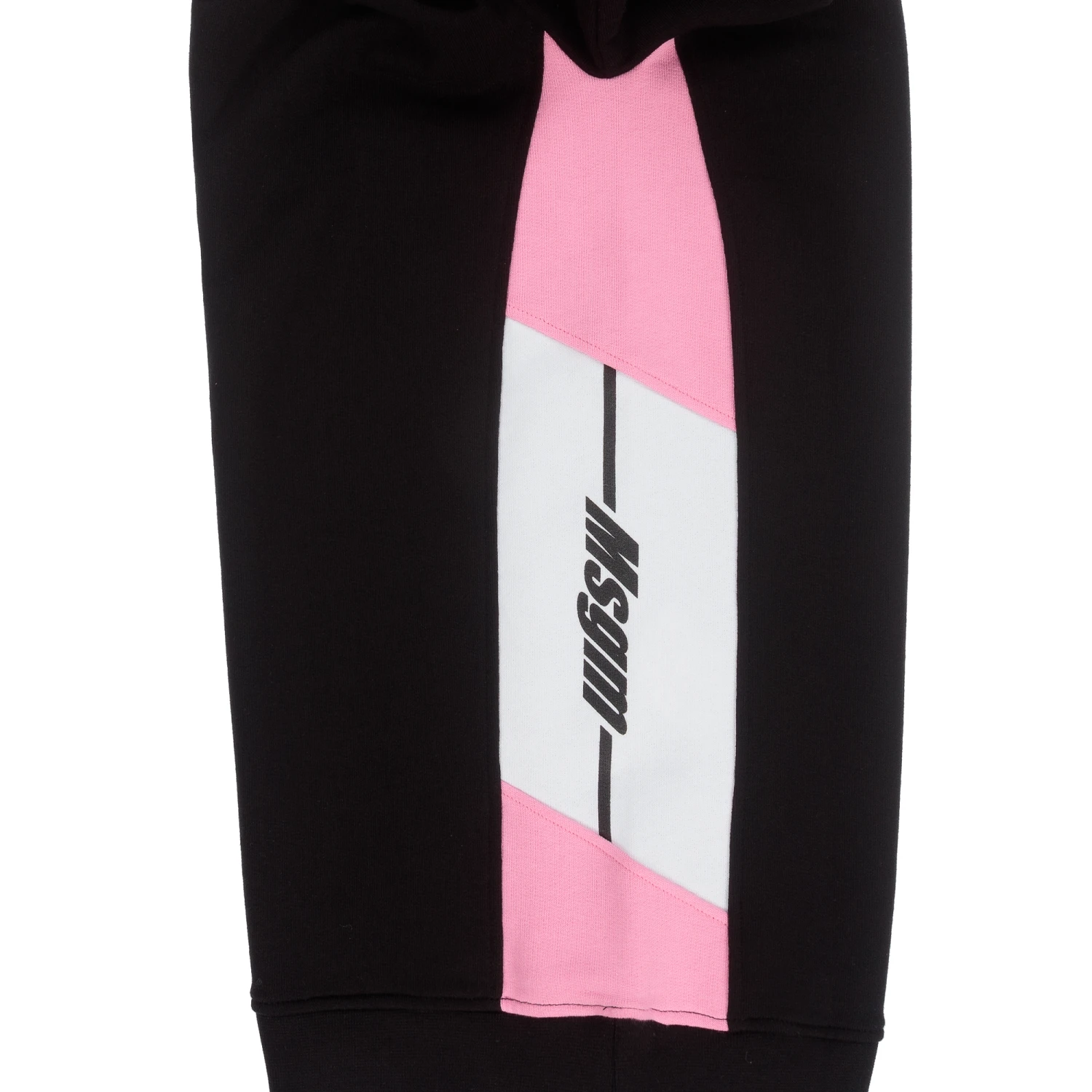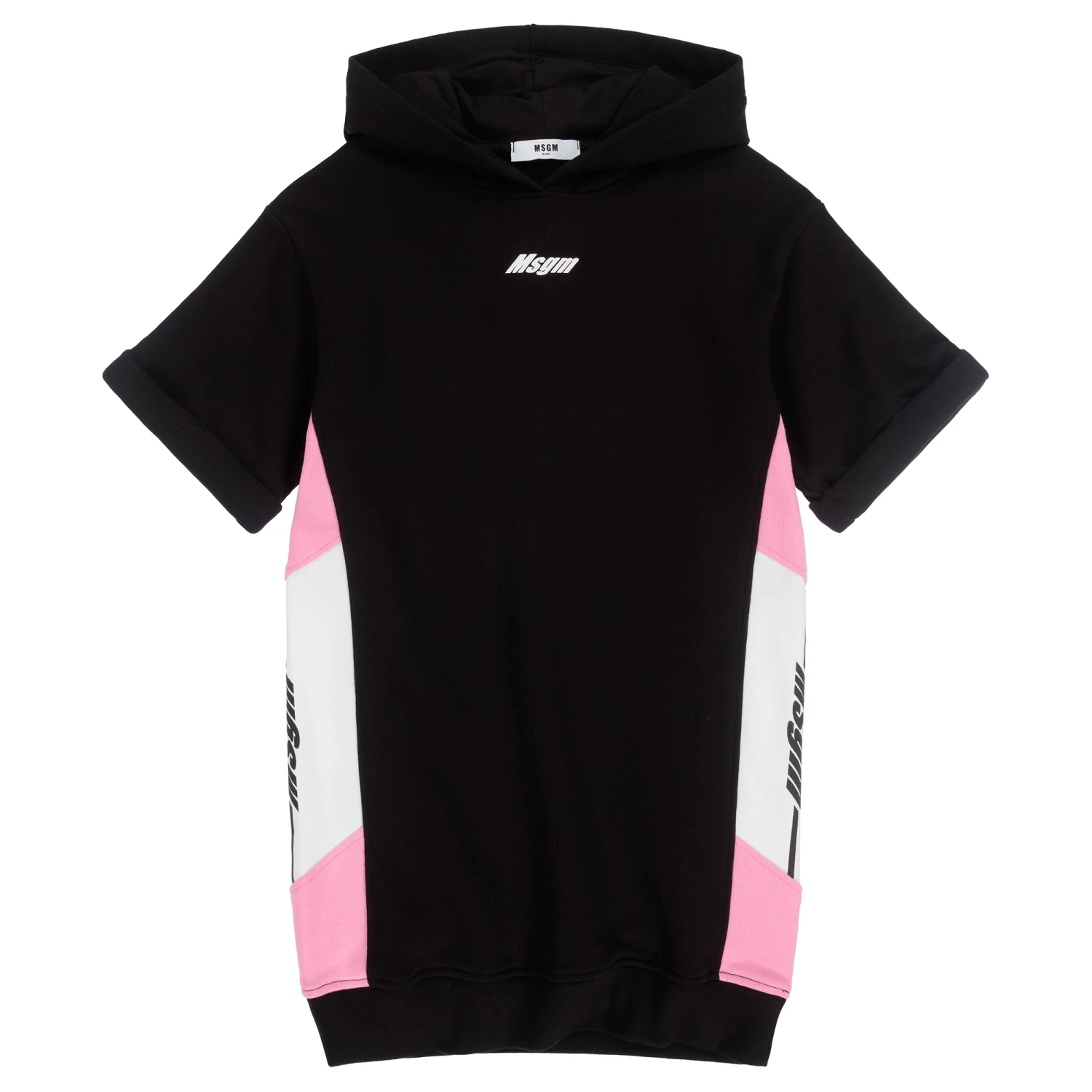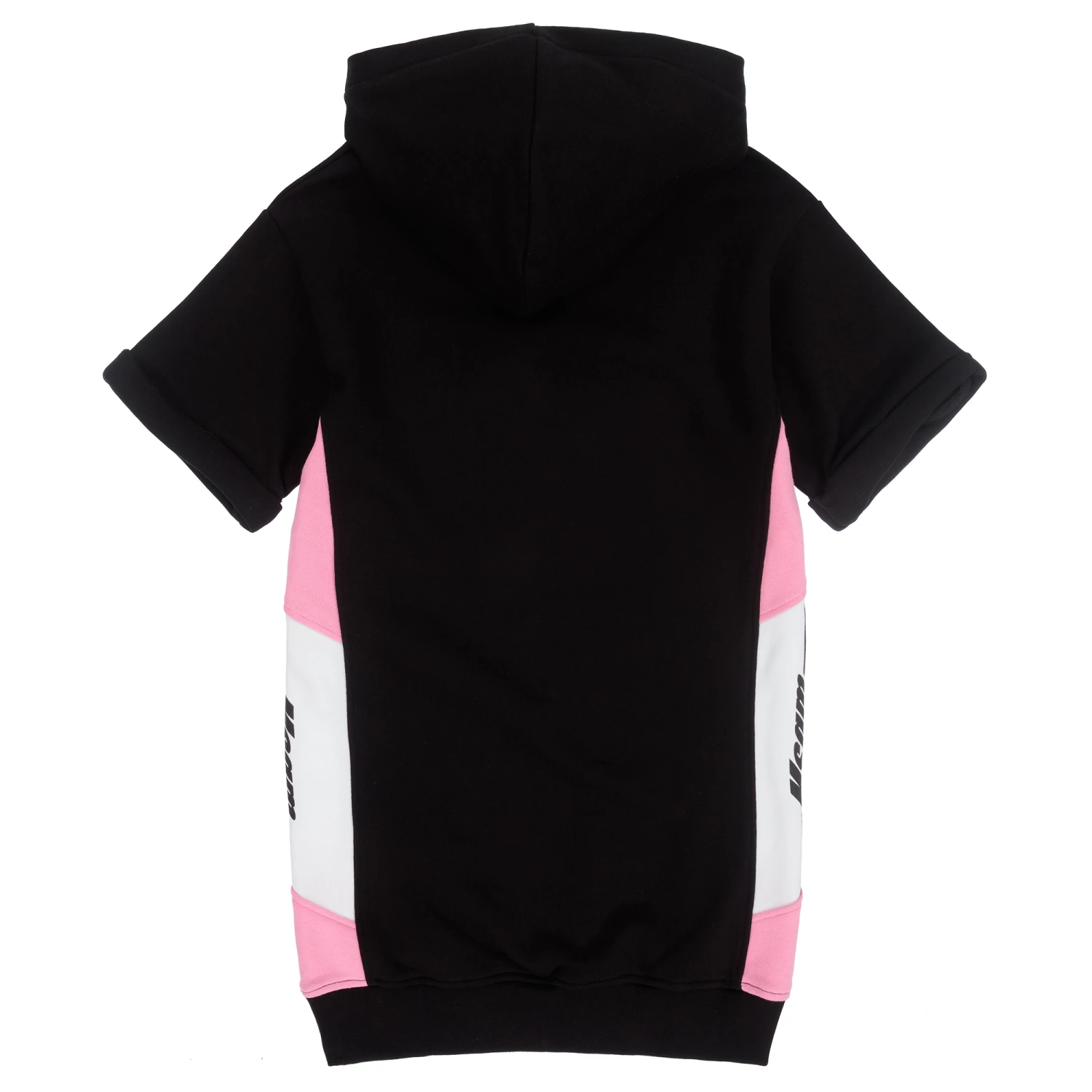 Teen girls black dress by MSGM, with pink and white logo trims. Made from lightweight looped back cotton jersey. It has a white logo printed on the front and a jersey lined hood.