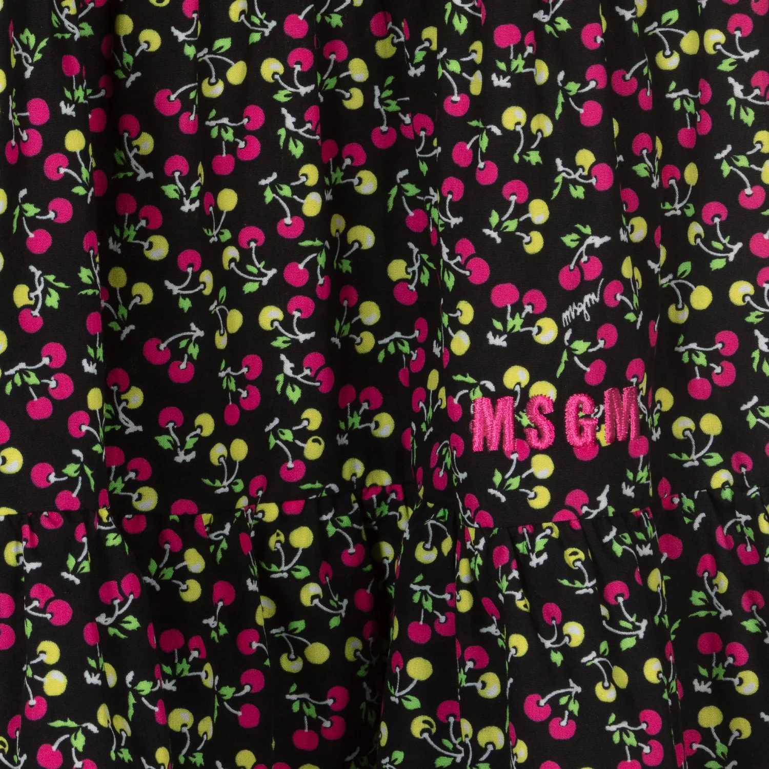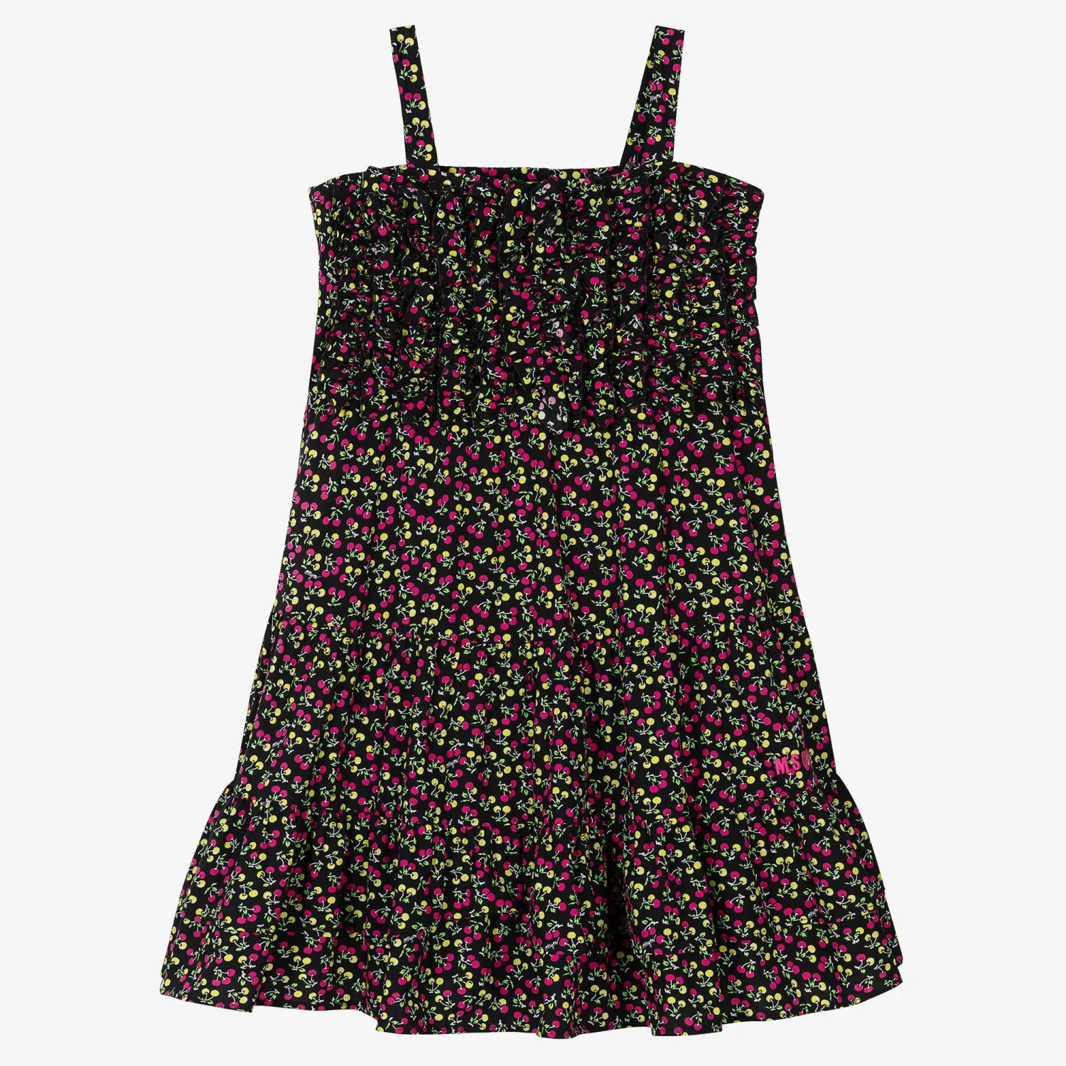 Black dress for teen girls by Italian brand MSGM, patterned in a vibrant pink and yellow micro cherry print with a subtle white logo script. Made in soft cotton poplin, it has adjustable shoulder straps and ruffles on the bodice for a feminine touch. Designed in a tiered shape, it has a pink micro logo embroidered above the hem and a concealed zip fastening on the side.