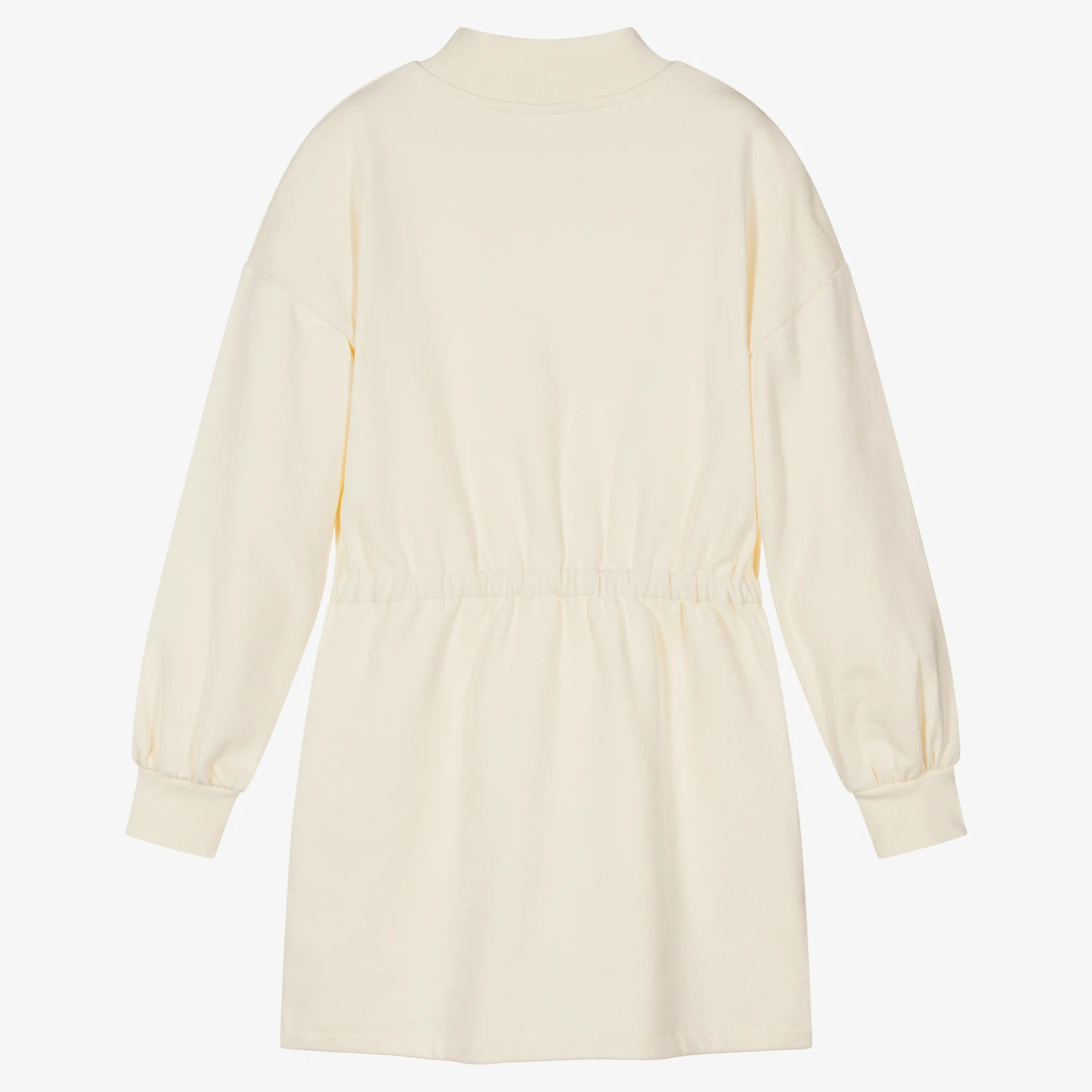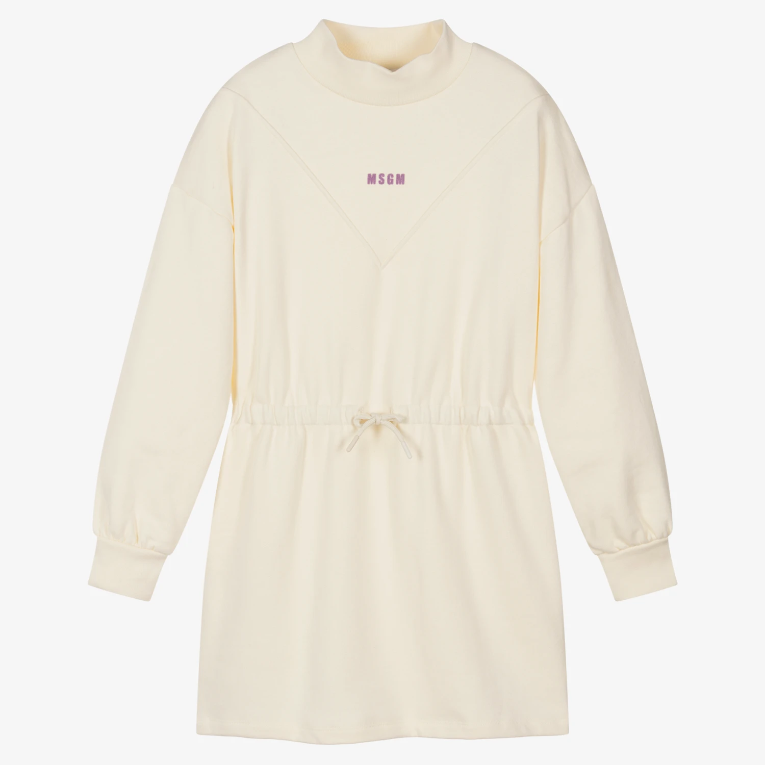 Ivory cotton dress for teen girls by Italian designer MSGM. Made in stretchy sweatshirt jersey, with a warm, fleecy inside, there is a deep ribbed neckline and cuffs, with a lilac pink flocked micro logo on the V-shaped front panel. This comfortable piece has side pockets and a faux drawstring on the stretchy dropped waist.