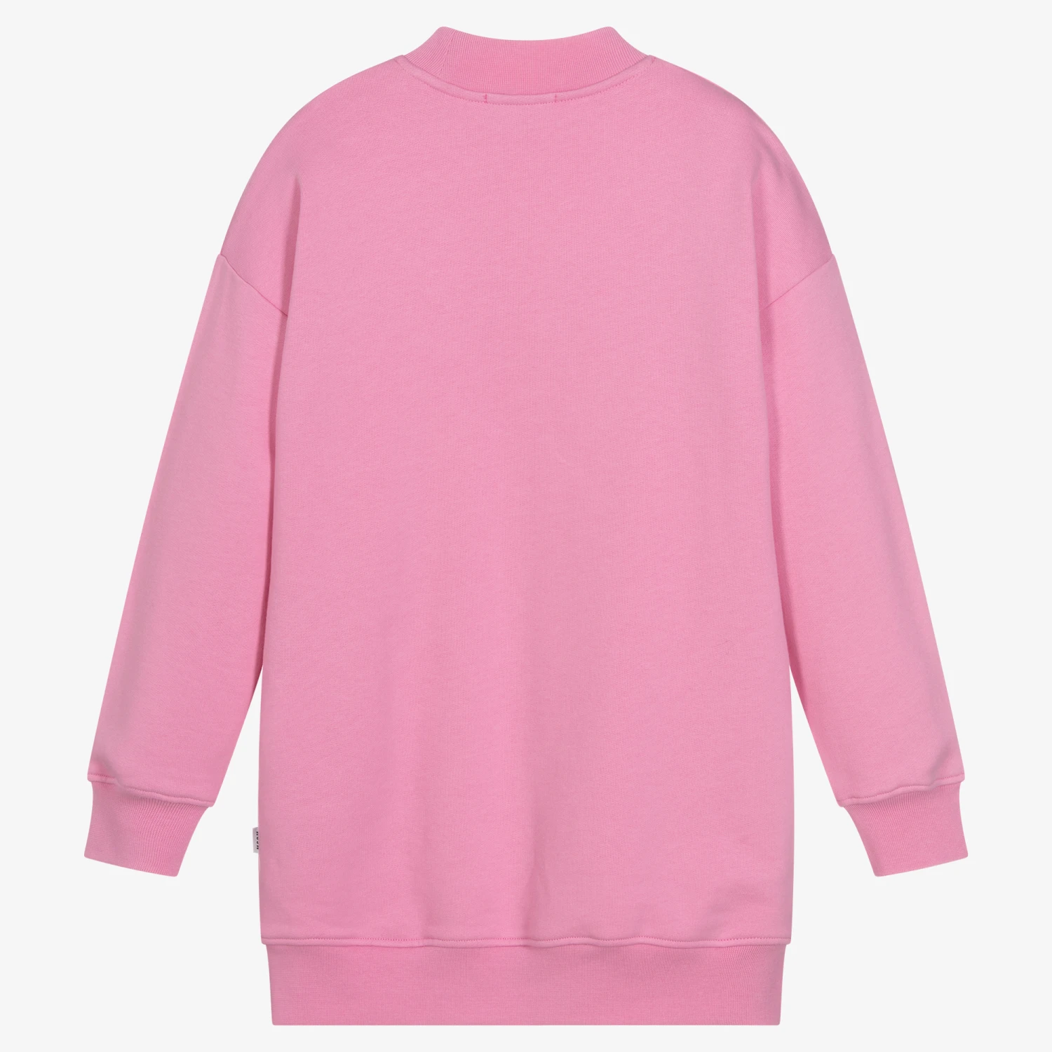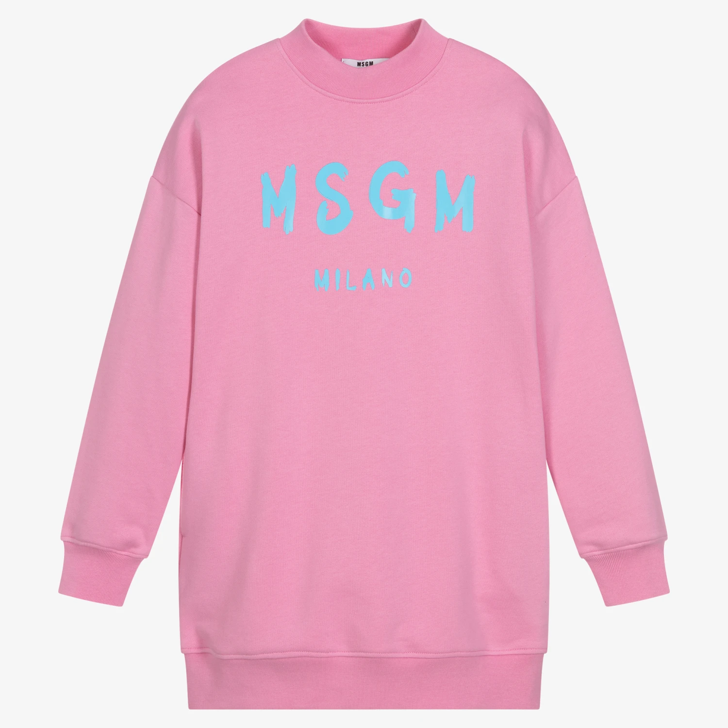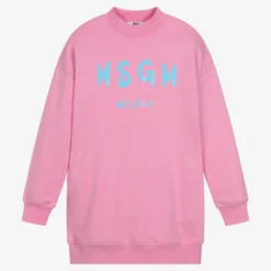 Pink cotton sweatshirt dress for teen girls by Italian designer MSGM. Made in stretchy, mid-weight jersey, there are deep ribbed trims and the designer’s brushed logo on the front in blue. This comfortable piece has pockets and a woven logo tab on the side seam.