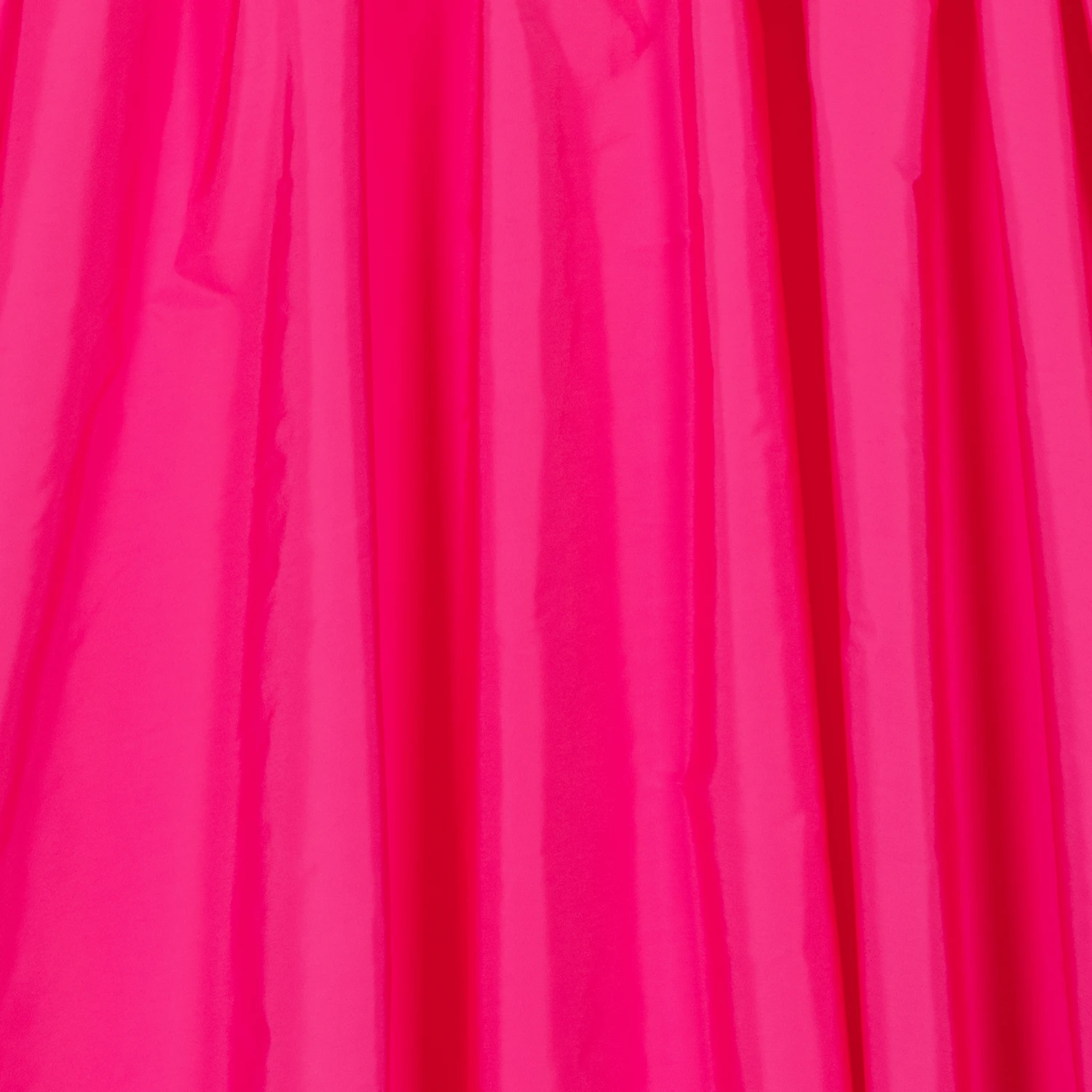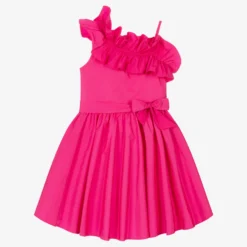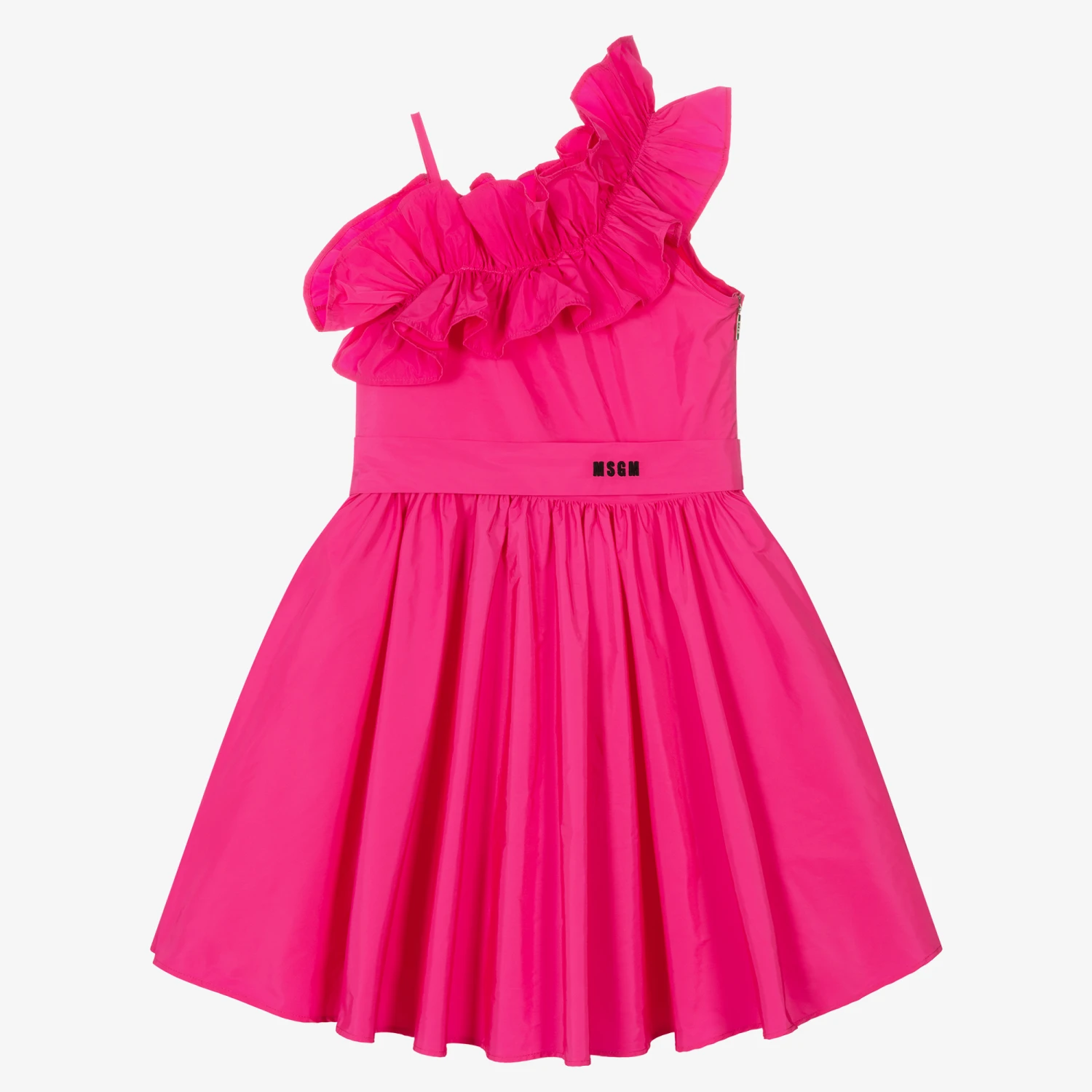 Fuchsia pink dress for teen girls by MSGM, made in soft taffeta with a sheen. Ideal for a special occasion or party, it has a wonderful ruffle around the neckline and over one shoulder, with a voluminous skirt accentuated by an attached belt, embroidered with a black micro logo. The bodice has a soft, lightweight voile lining for comfort and the side zip fastening is concealed for a neat look.