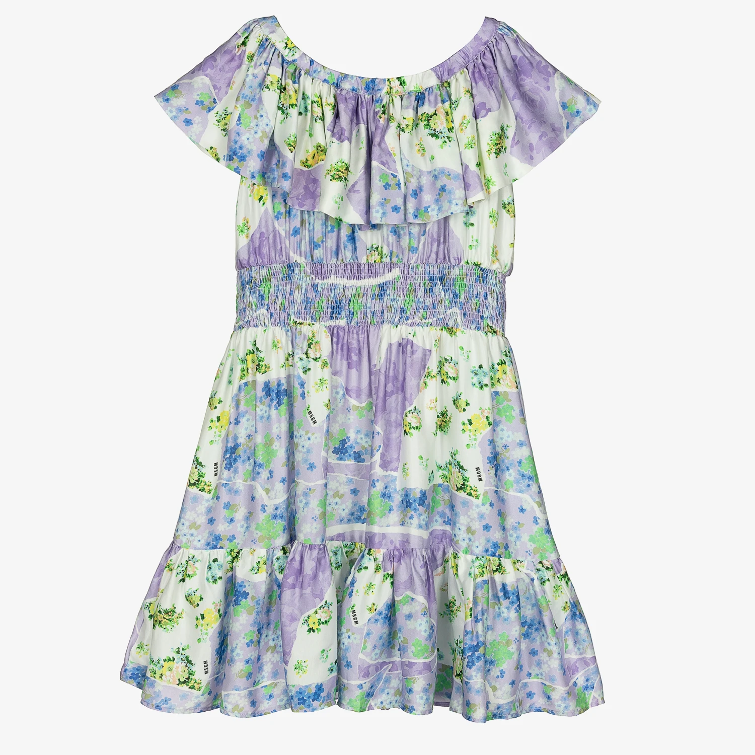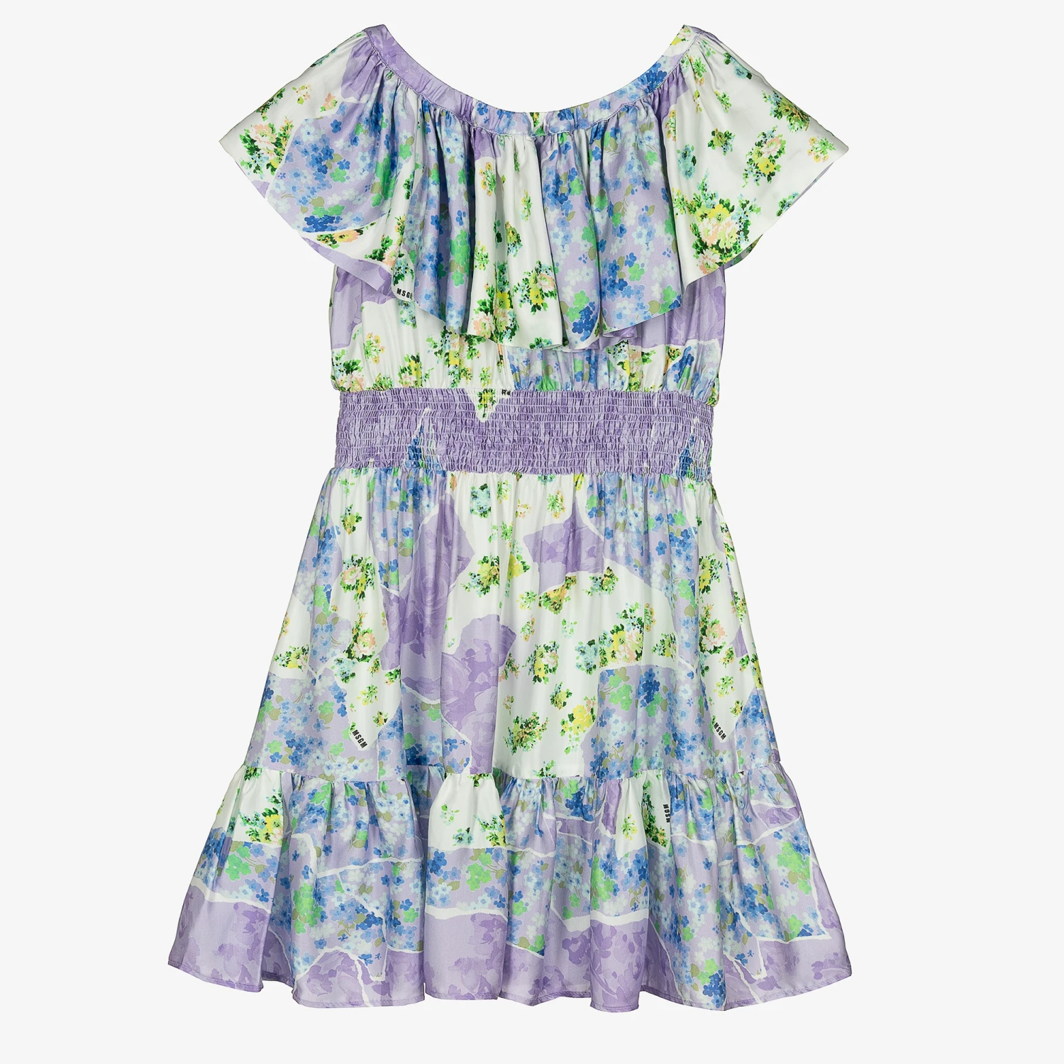 A soft viscose satin dress for teen girls by MSGM, patterned in blue, green, and yellow florals against a light purple and ivory background. Designed with a subtle black micro logo print, this timeless dress has a stretchy, ruffled neckline that can be worn on the shoulders or in a bardot style. Easy to pull on, it has a comfortable shirred waist and a pleated hem for a feminine flourish.