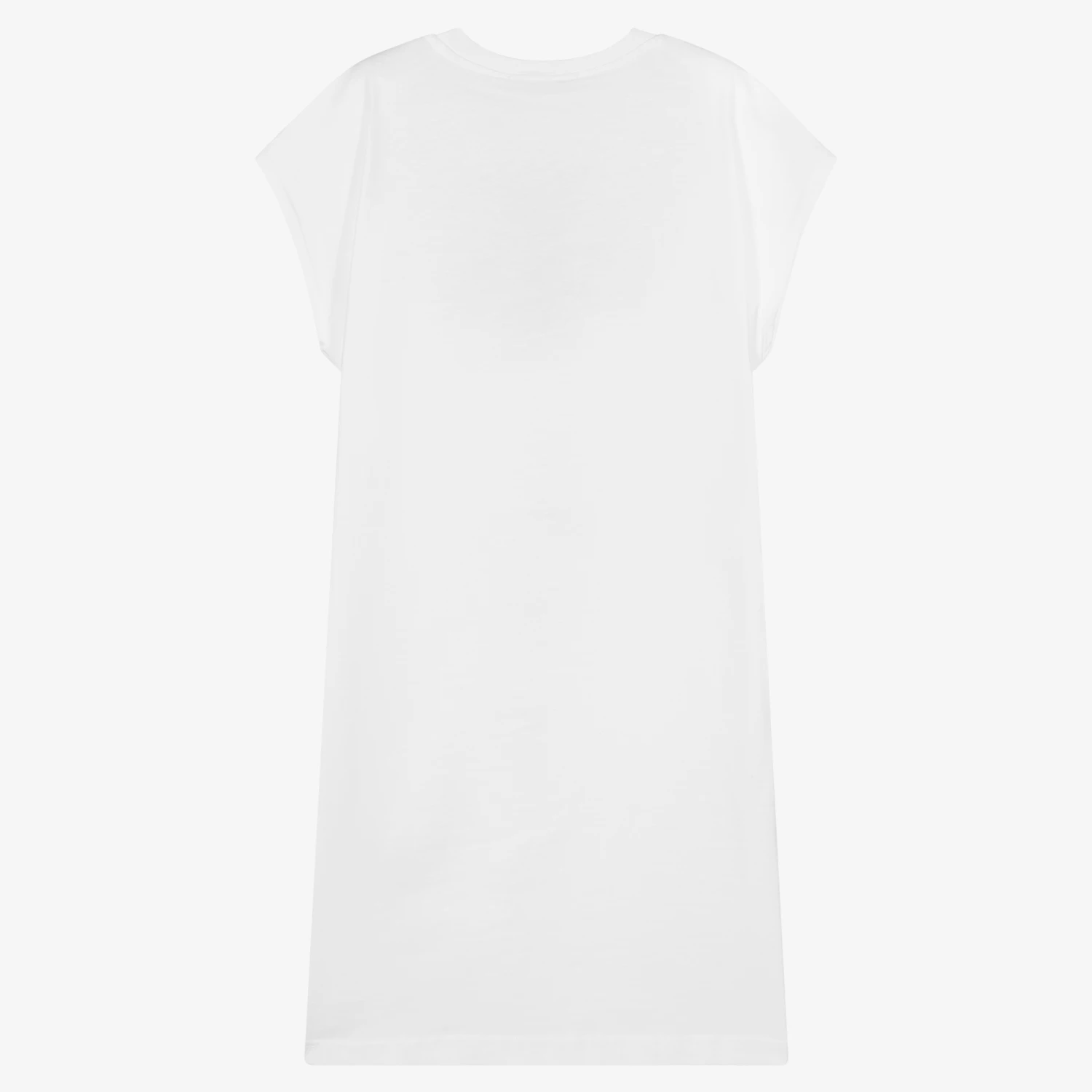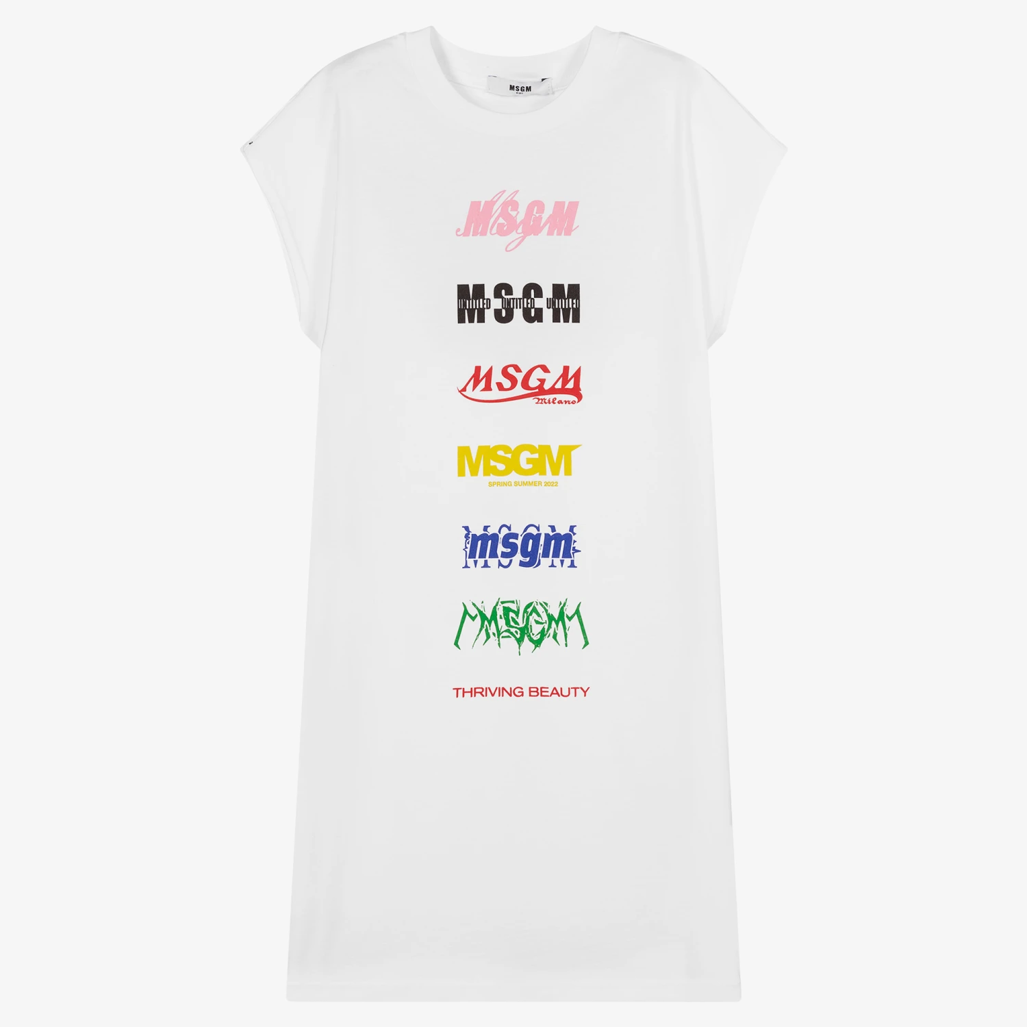 Teen girls white dress by Italian designer MSGM, made in soft and stretchy cotton jersey. This streetwear piece has colourful logo prints on the front in different font styles. For a more structured, boxy silhouette, the shoulders extend to create little capped sleeves.