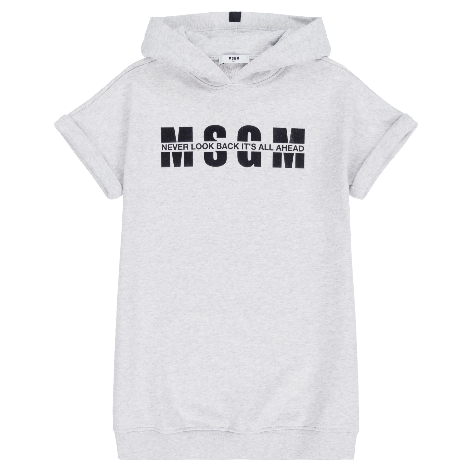Teen girls grey sweatshirt dress by MSGM, with a black printed logo. Made from soft cotton looped back jersey, with a jersey lined hood and short sleeves.