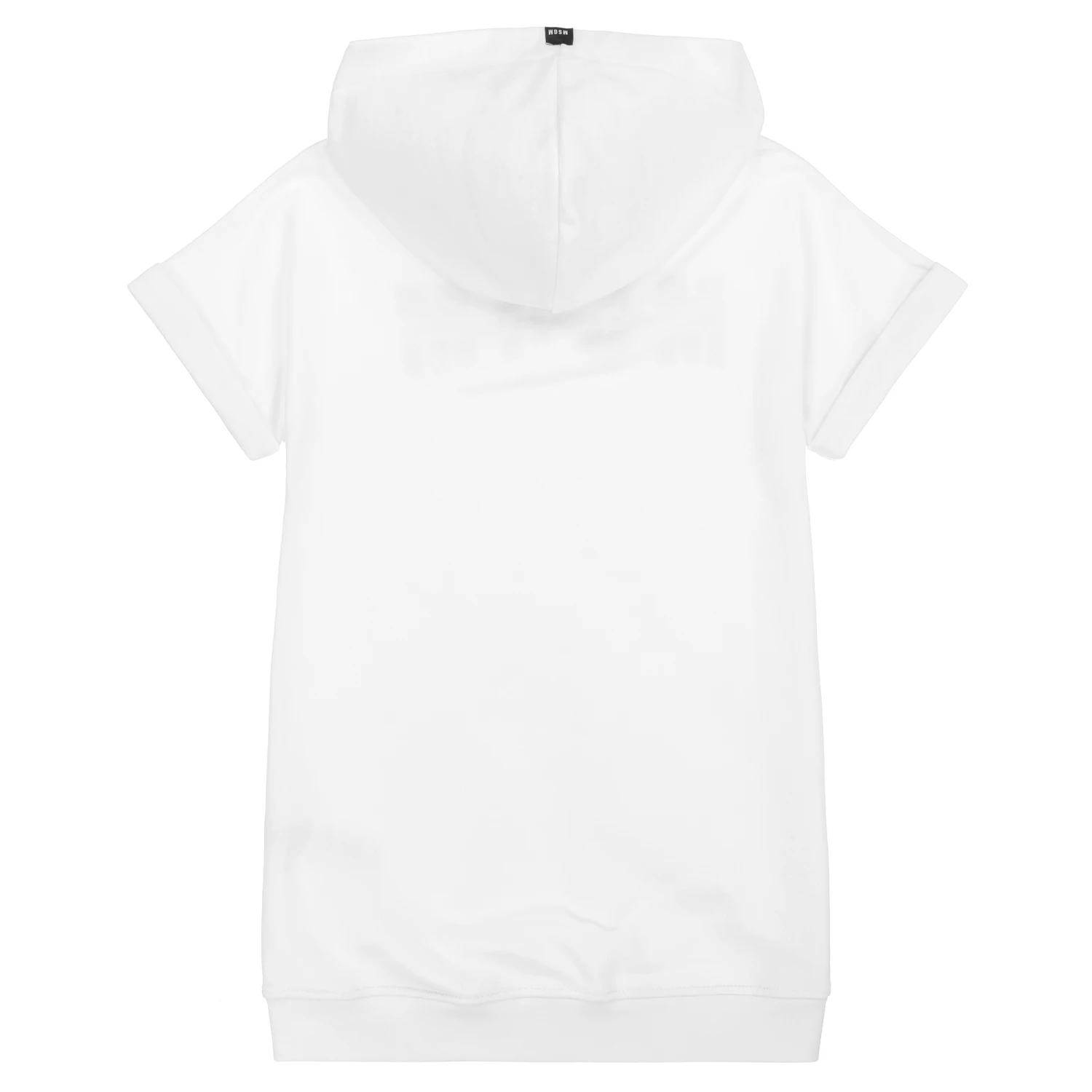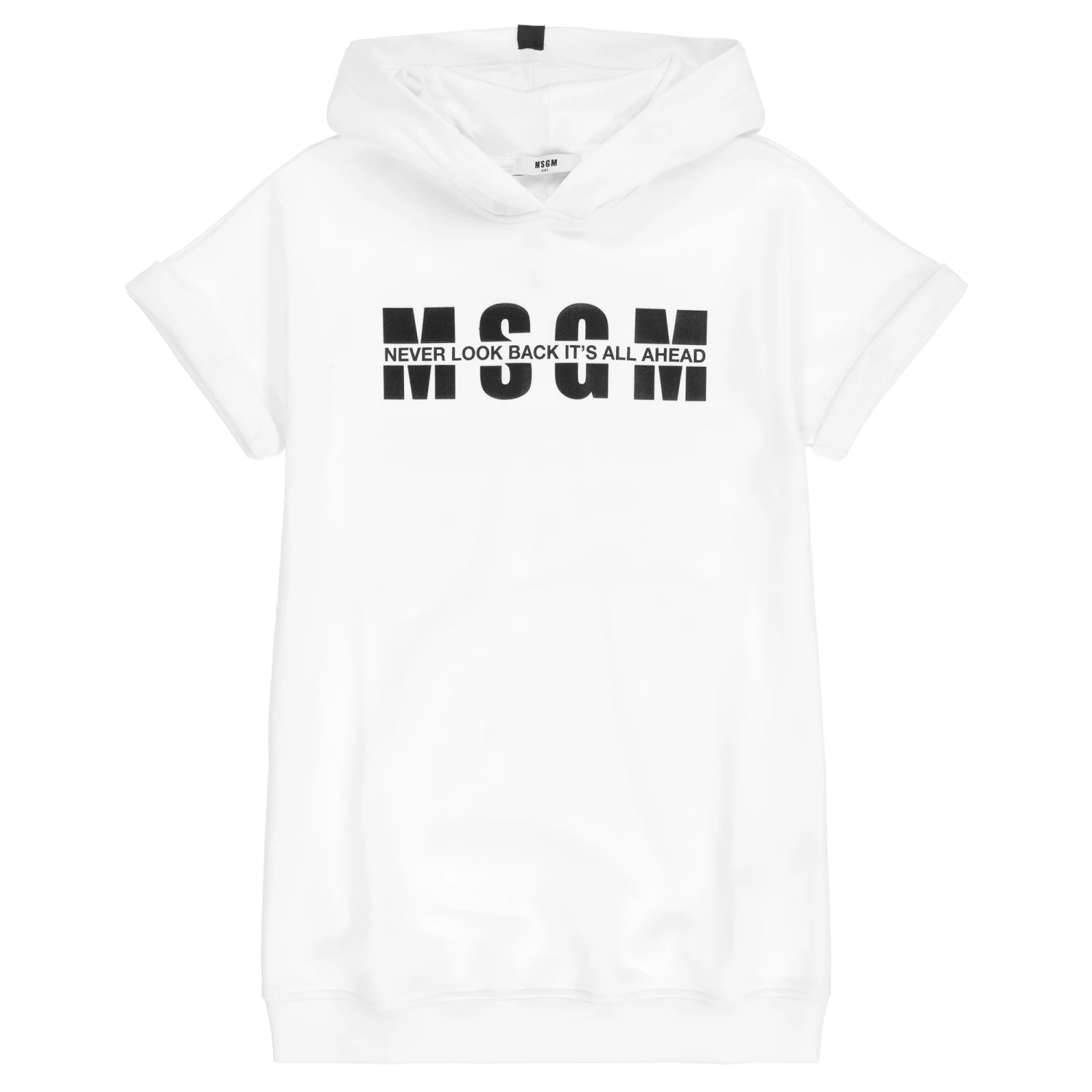 Teen girls white sweatshirt dress by MSGM, with a black printed logo. Made from soft cotton looped back jersey, with a jersey lined hood and short sleeves.