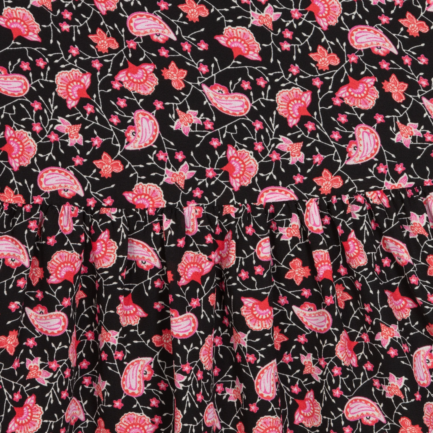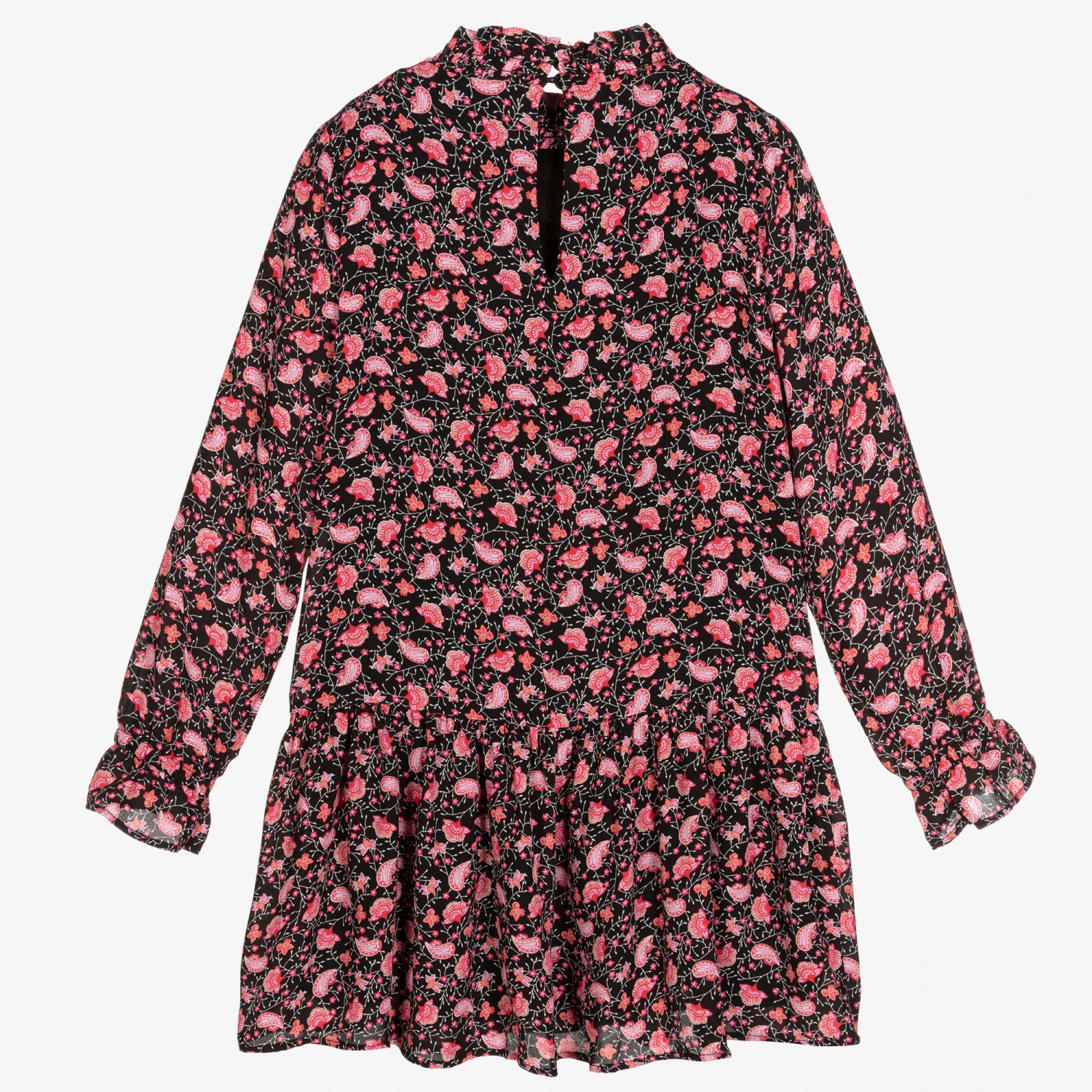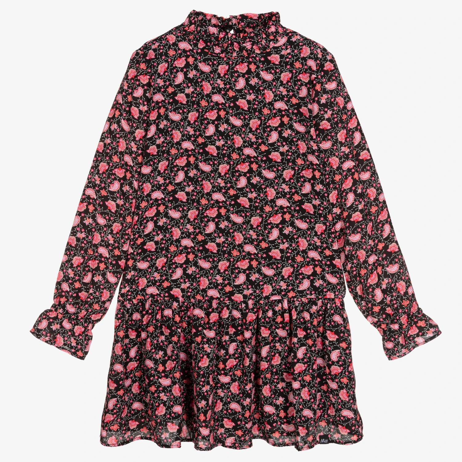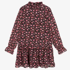 Teen girls black and pink floral dress by NIK&NIK, made in silky recycled chiffon crêpe. With a stylish, gathered drop waist, it has a pretty high-waisted shirred collar with matching cuffs for a sophisticated look.