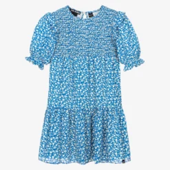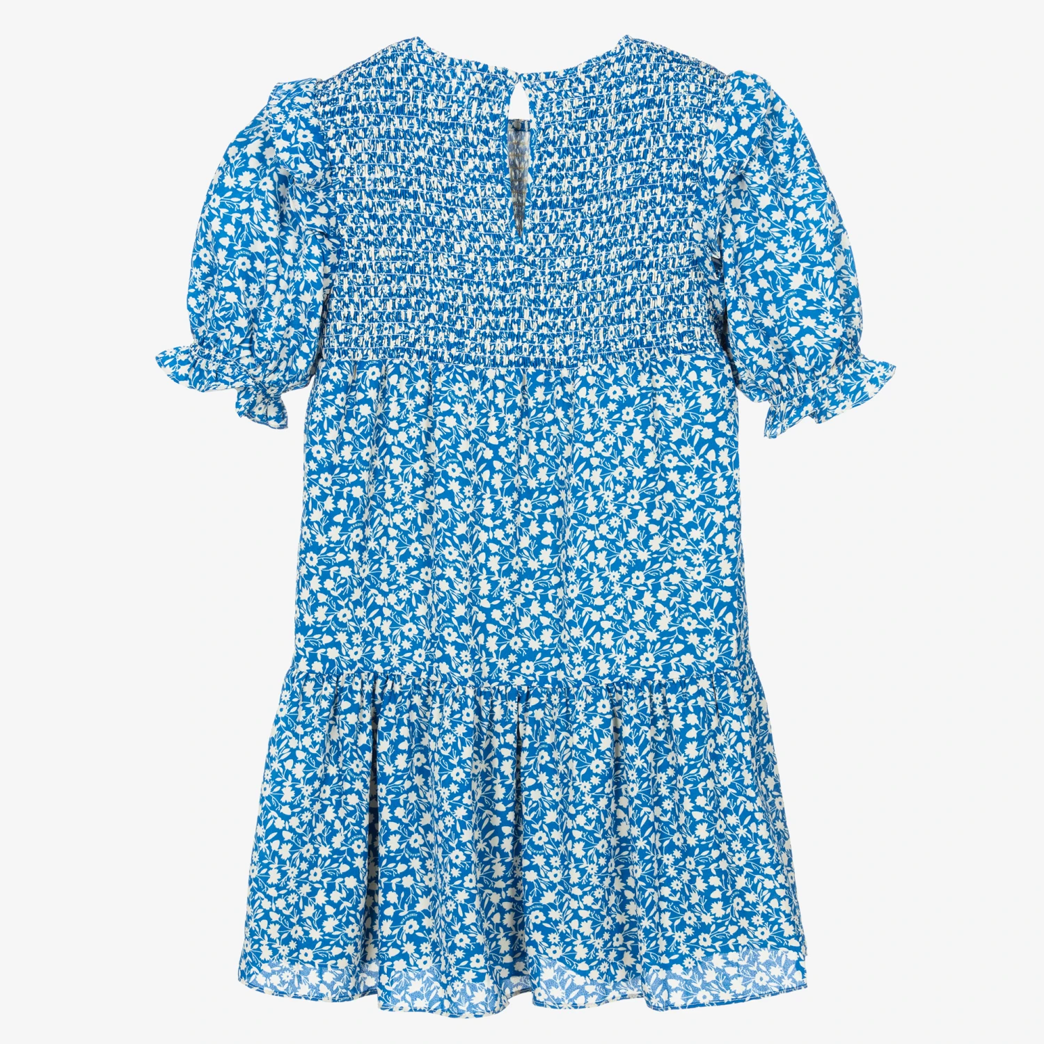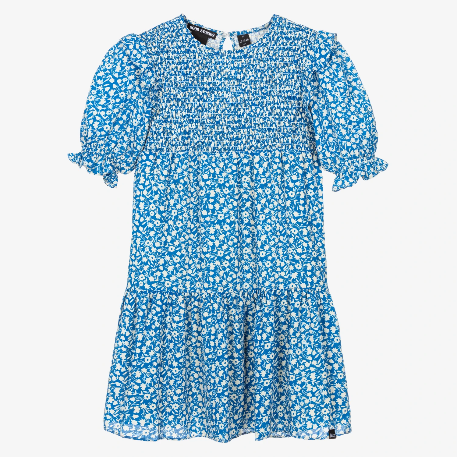 A pretty blue and white floral dress for teen girls by NIK&NIK, made in silky, recycled polyester crêpe. It has elasticated shirring on the front and back bodice and puffed sleeves. There are soft gathers on the waist, a ruffled hem and little frills over the shoulders. It has a single button fastening on the back and a full lining.